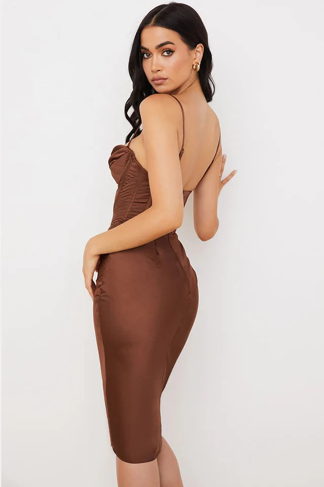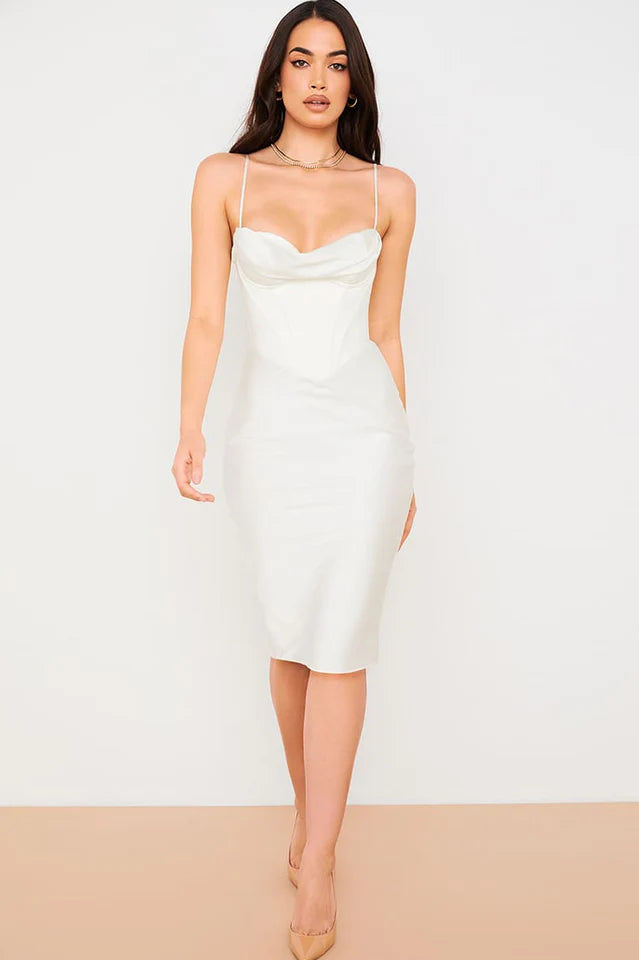 Nothing comes close to the level of perfection achieved by the Absolute Elegance Corset Midi Dress! Made from luxe satin this number features cowl neckline and cut on the bias for a beautiful drape and figure skimming silhouette. We love the pretty half cups and the delicate spaghetti straps are adjustable for the perfect fit. The skirt sits elegantly just below the knee. It has a zip to the back for easy on. Wear yours with a pointy heel for a super feminine vibe.