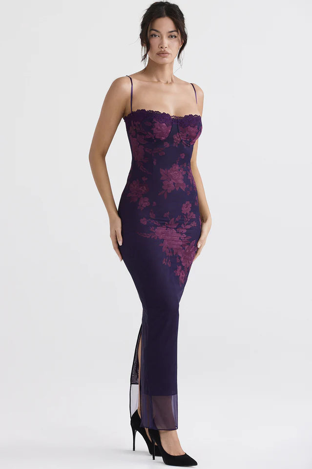 "Aiza" is beautiful with its scalloped trim and particular shade of purple. The 'Aiza' is cut from our signature stretch-mesh for shape and has the most pleasing lace back. Wear yours with sparkly pumps for a party-season radiant look.