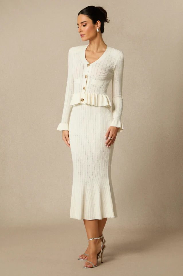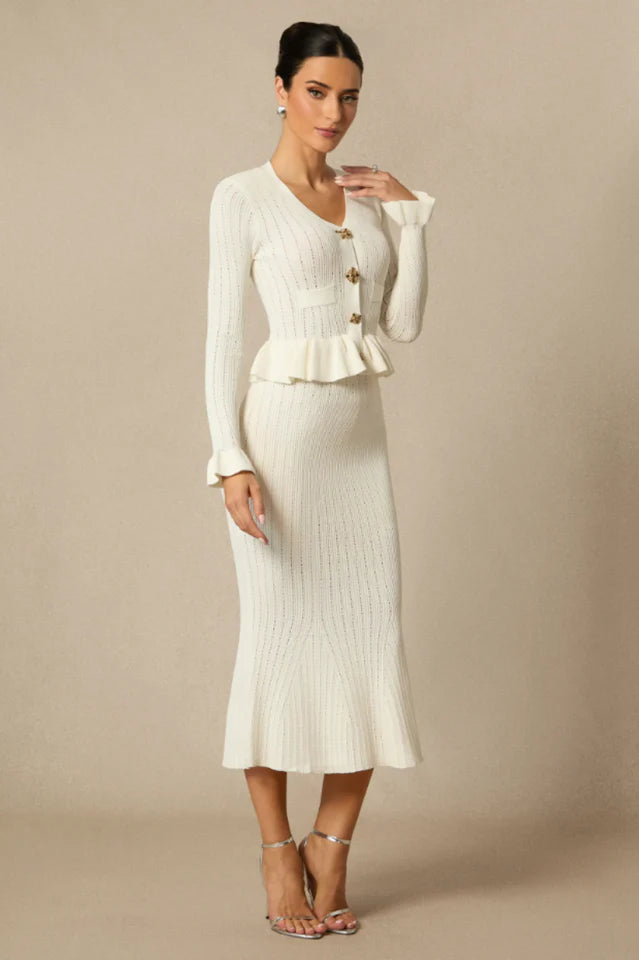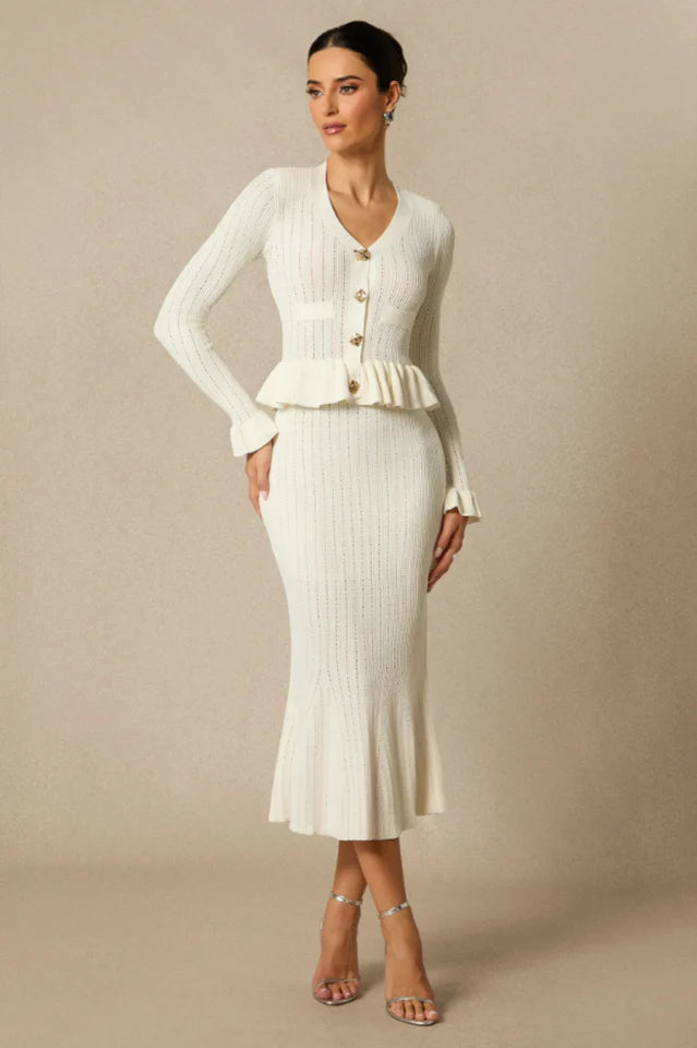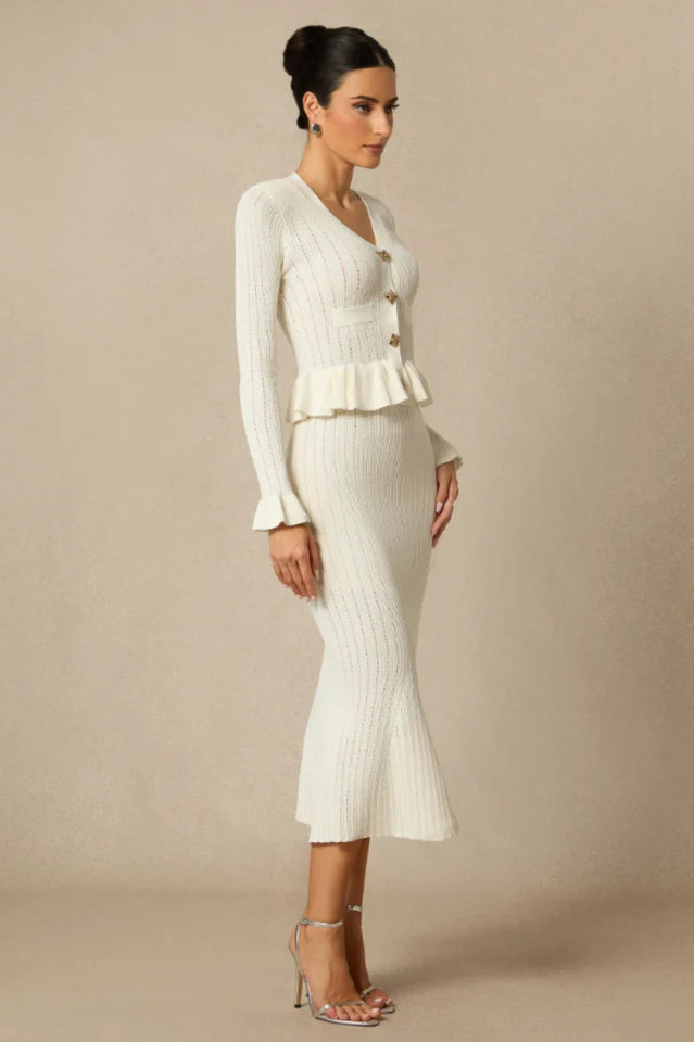 V-Neck, Peplum Hem, Ribbed Knit Texture, Long Sleeves, Midi Length.