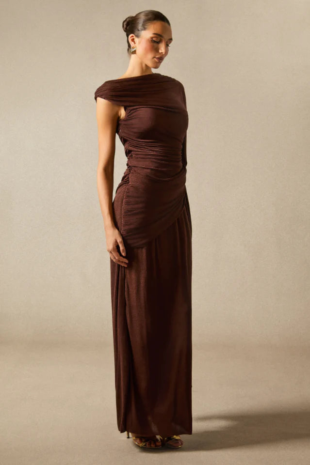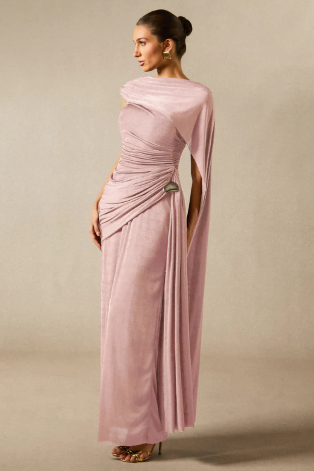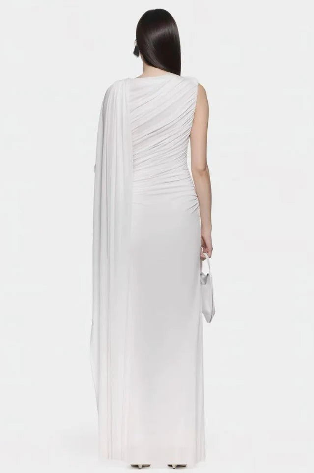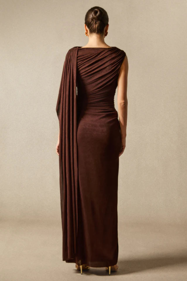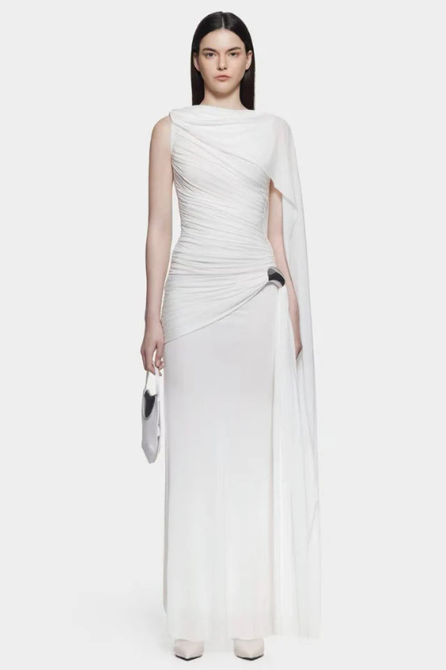 One Shoulder Design, Cape Sleeve Detail, Draped Bodice, Ruched Side Detail, Asymmetric Neckline, Raw Edge Finish, Maxi Length.
