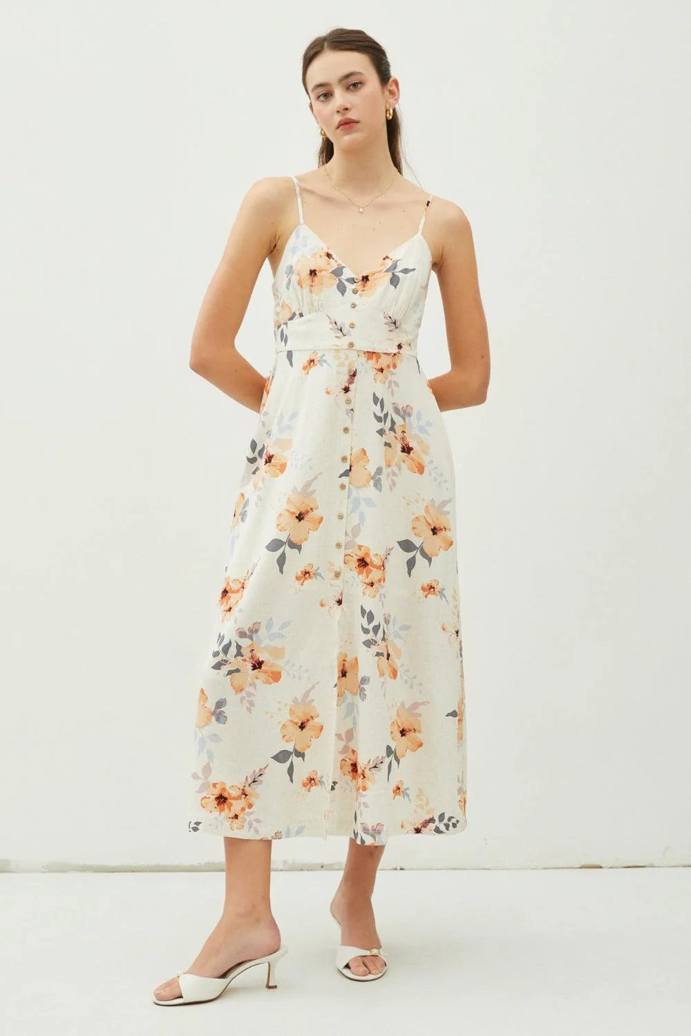Introducing our Floral Button Down Cami Midi Dress, a charming and feminine choice for your wardrobe! This dress features a lovely floral print, a button-down front, and cami-style straps for a chic look. The midi length adds a touch of elegance, making it perfect for any occasion. Made from lightweight and flowy fabric, it offers both comfort and style. Select your favorite floral pattern to showcase your individual style. Elevate your look with this romantic and versatile midi dress that will effortlessly take you from day to evening events!