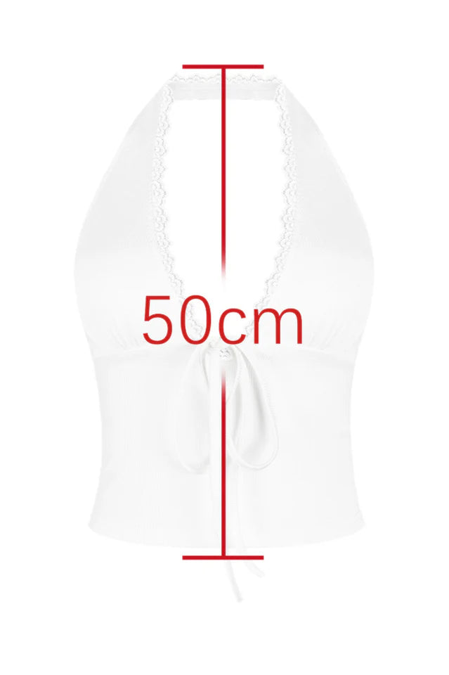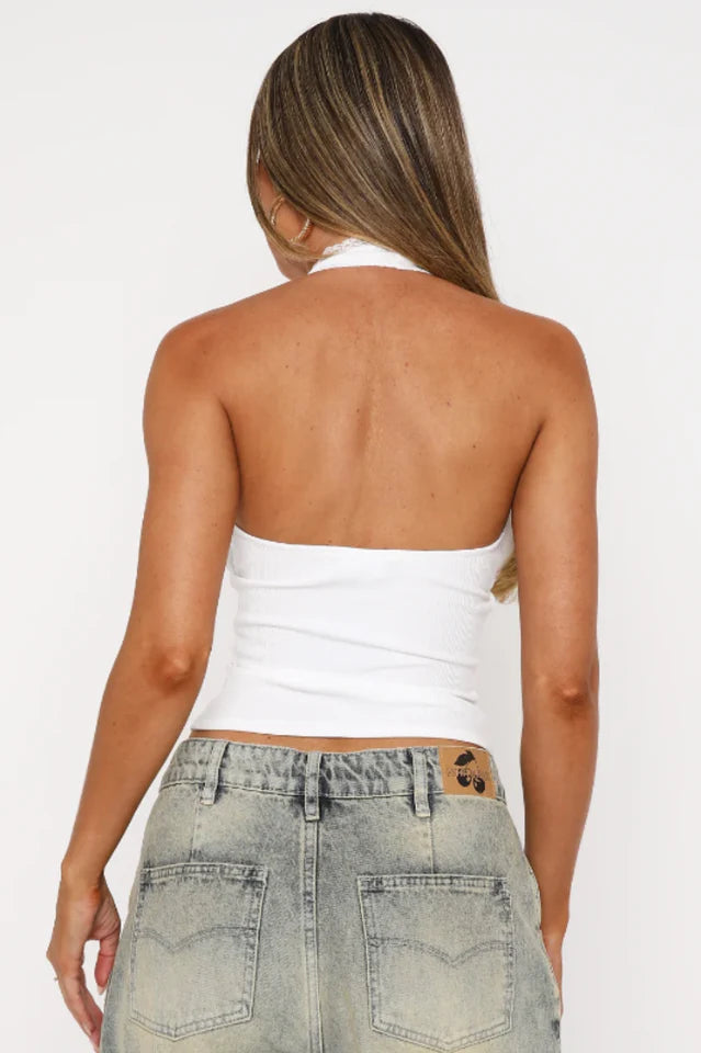 Spring is around the corner and the Believing The Lies Halter Top is a must have! Features a halter neck design with clasp closure, low plunge V neckline with front tie detailing, lace trim detailing, stretch material and cropped length. Pair with a mini skirt for the cutest vibe!