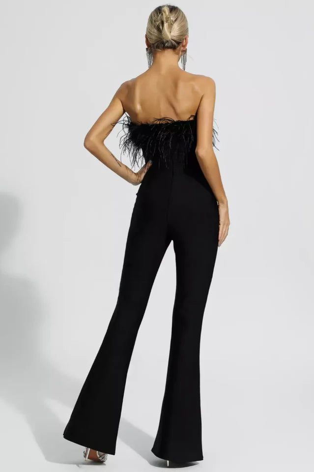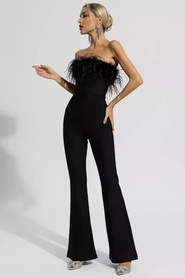 Never sacrifice style for comfort! This Bianca And Bridgett Nicki Jumpsuit perfectly blends feather and bandage fabric to create an effortlessly stylish black jumpsuit. Flaunt your fashion confidence and turn heads with this unique piece!