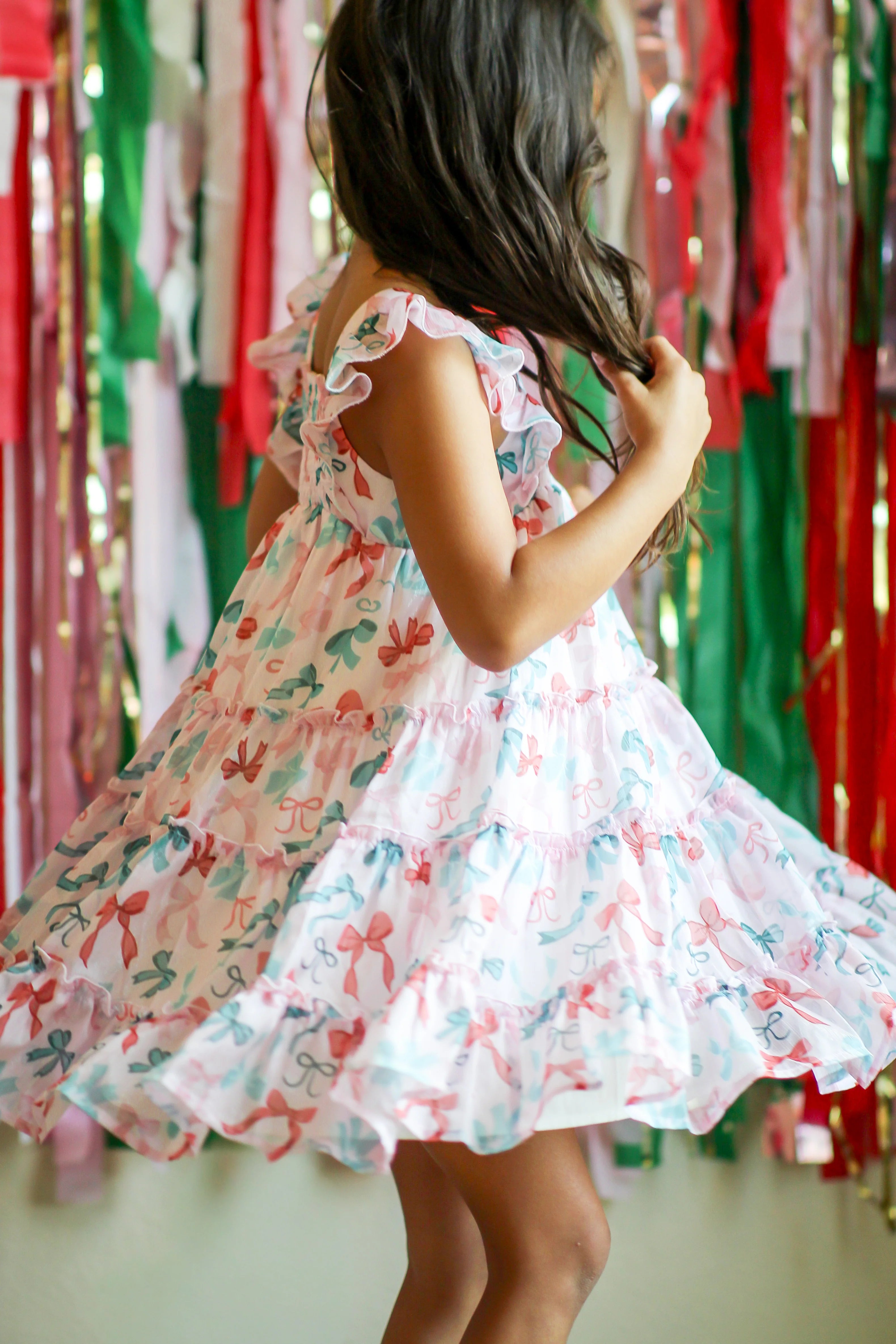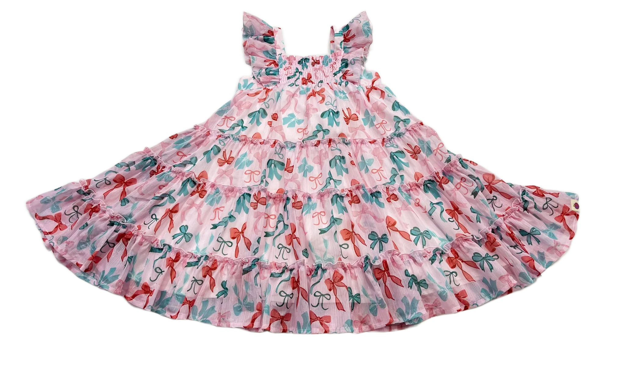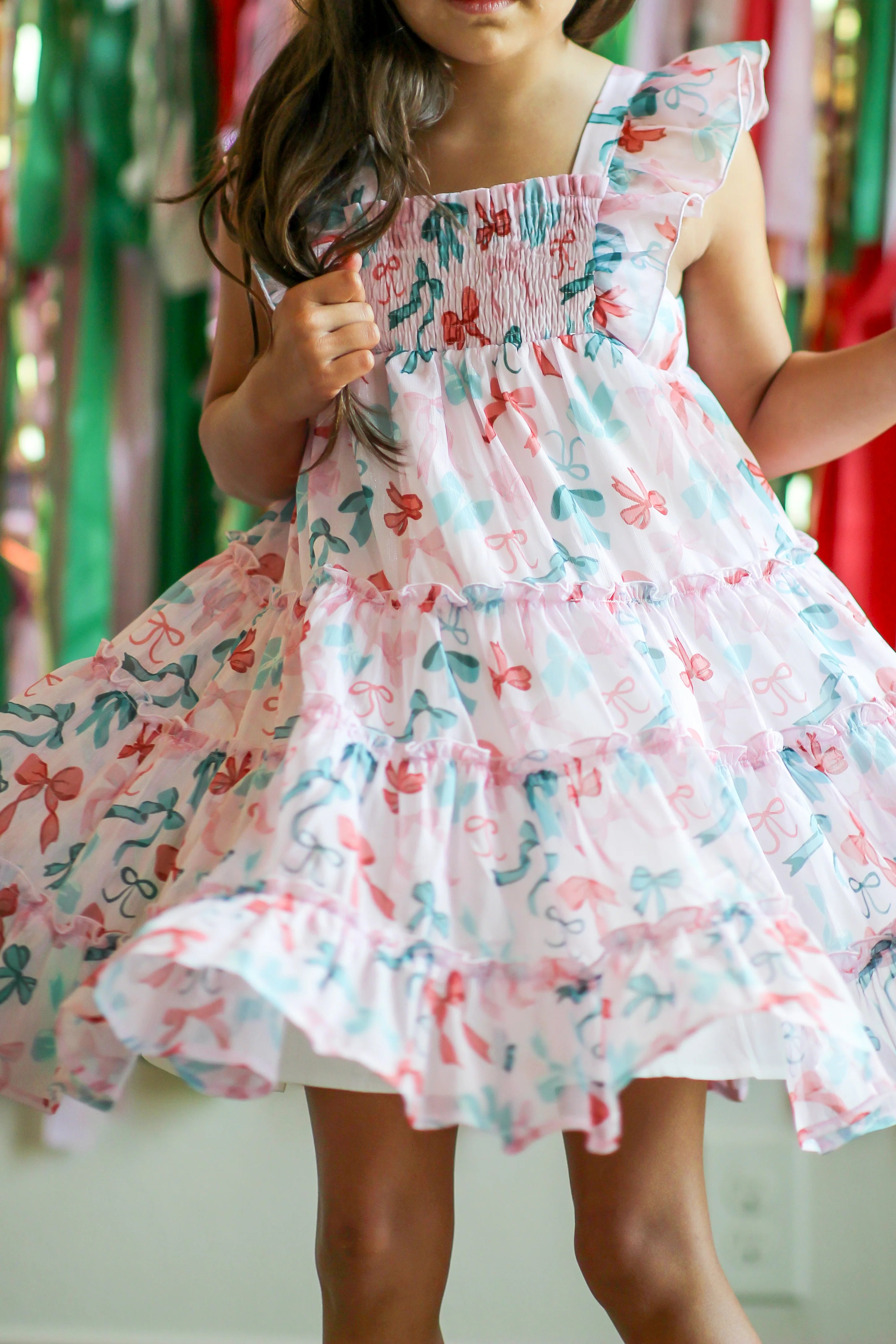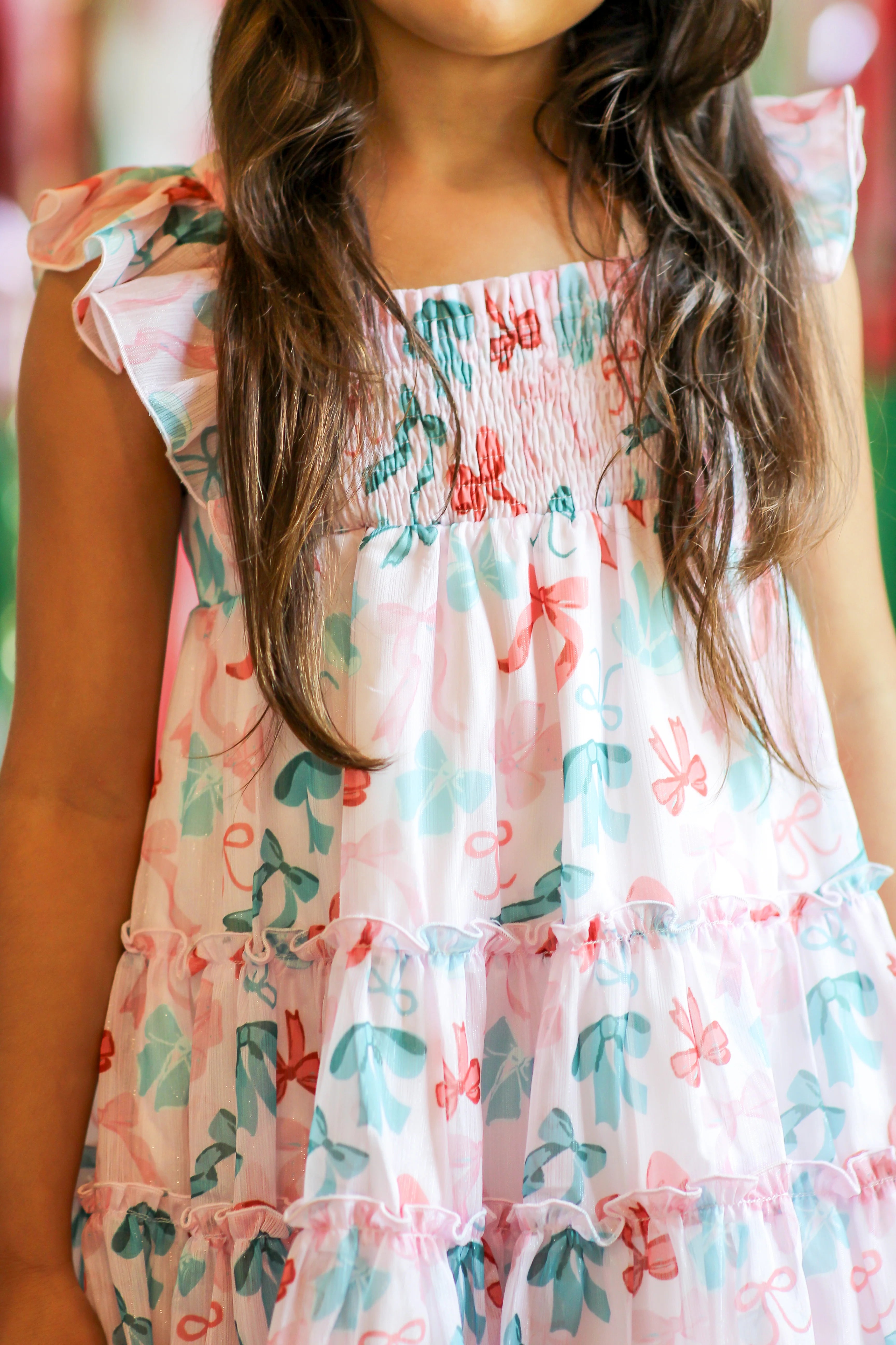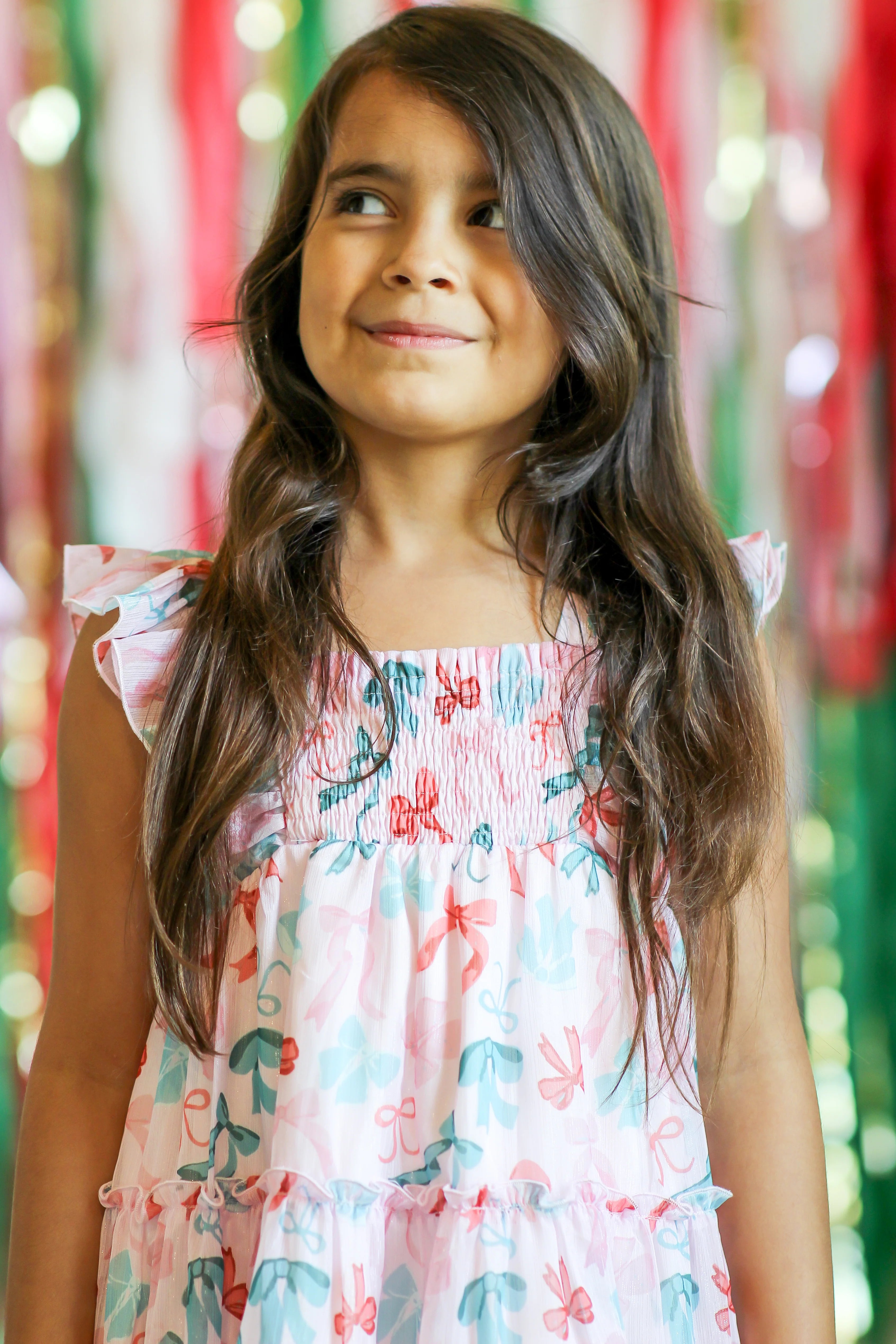Delight your little one with the Brielle Shimmer Dress in Peppermint Ribbons, featuring charming ruffle sleeves for an enchanting look.
