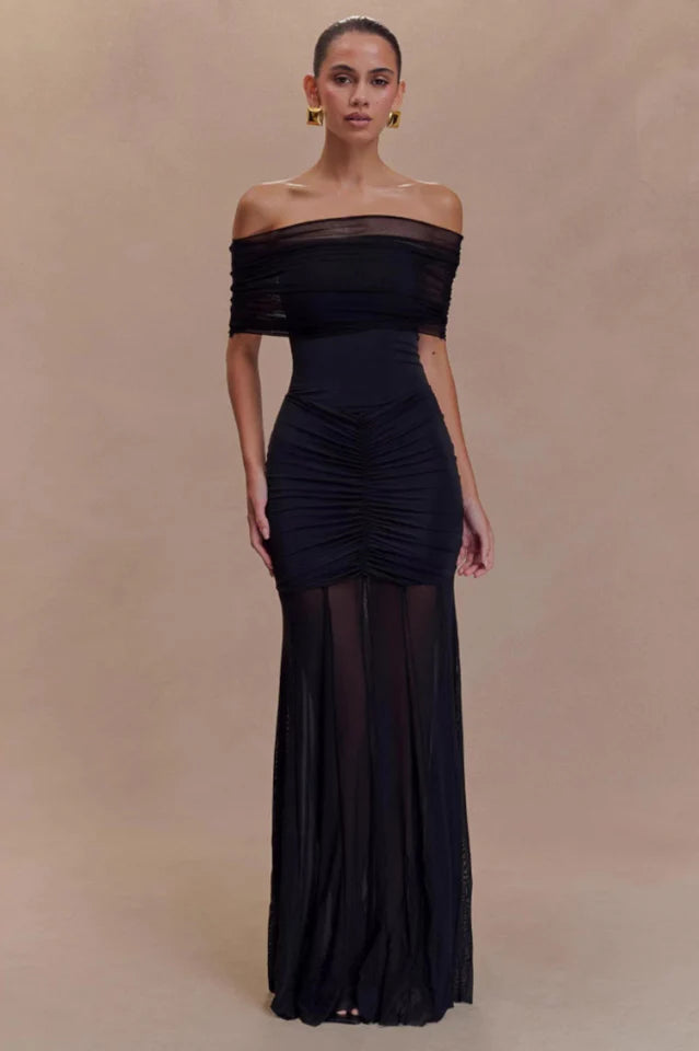 Step into enchanting Stardust Nights with the CASPIAN Slinky And Mesh Off Shoulder Maxi Dress, a captivating blend of allure and sophistication. Boasting a boat neckline and a strapless internal design with an elegant mesh overlay, this dress effortlessly combines glamour with a touch of drama. Ruching detail at the front and back waist enhances your silhouette, ensuring a flattering fit that's as comfortable as stylish. The flowing mesh skirt adds an ethereal charm, while the lined bodice provides comfort and coverage. Perfect for formal events or special occasions, the maxi length exudes grace and refinement, making it a standout choice for evenings filled with magical moments.