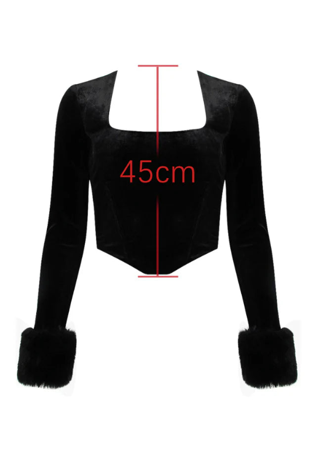 "Catriona" is made from ultra-luxe stretch velvet that feels rich and soft. The faux fur cuffs add to the festive atmosphere, and the supportive bone buttons perfectly tighten the waist. "Catriona" can be worn with tailored trousers or jeans for a casual look.
