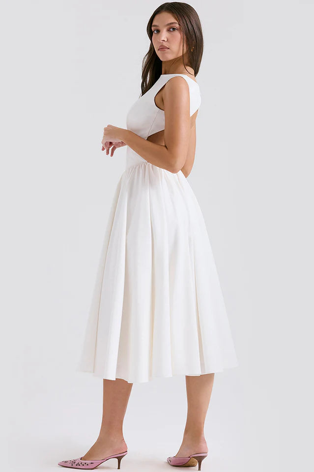 Cindy White Twill Midi Sundress has an elegant, effortless style that's inspired by our love for romantic designs. Made from soft peached twill, the crisp white hue has a Spring-Summer feel that's perfect for dreamy destinations and pretty garden parties. The fitted bodice has a sleeveless silhouette and a subtle high neck that turns to reveal a dramatic open back.