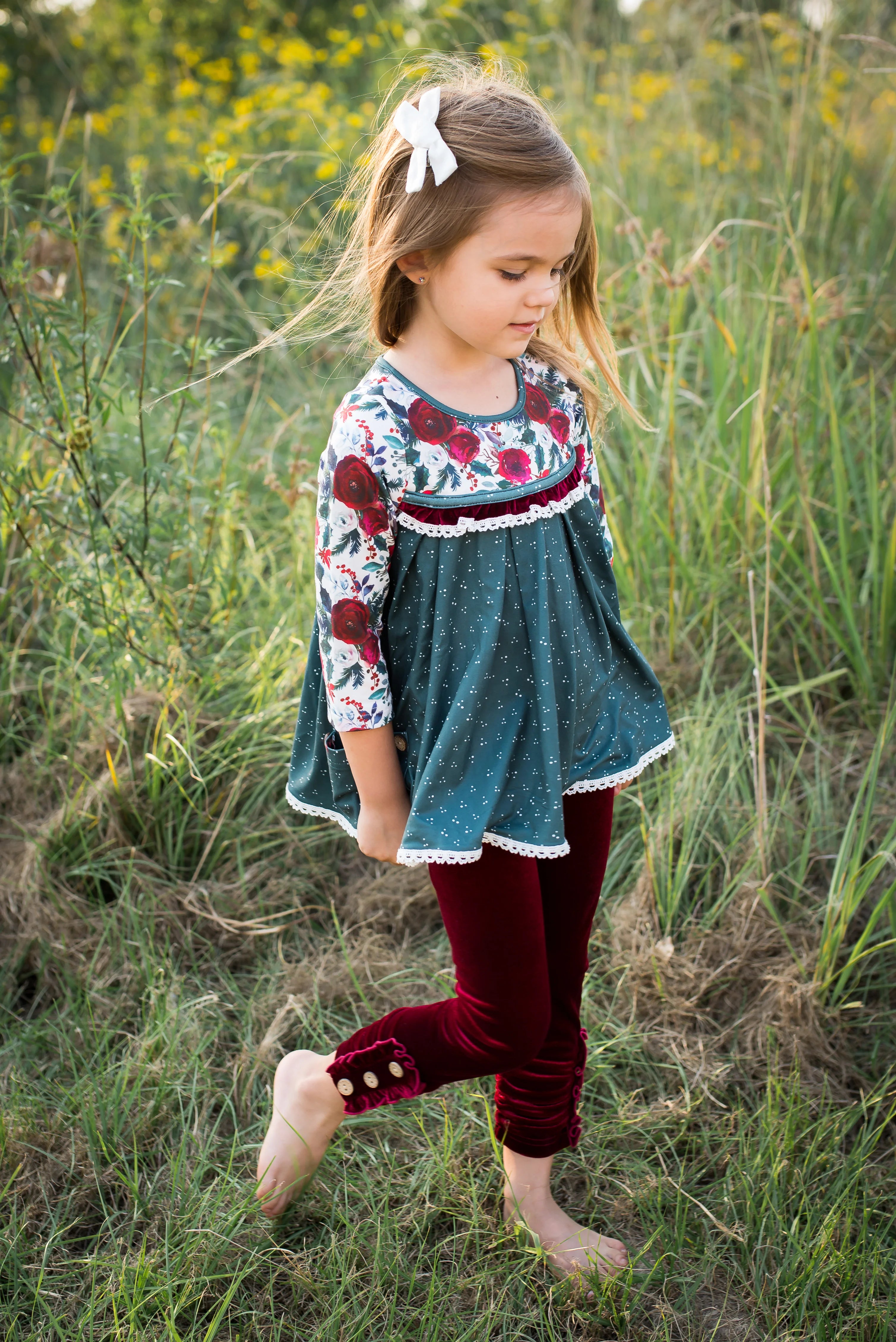 Get ready for the holiday season with the Cora Play Set - Holly Jolly. This charming set features soft velvet leggings paired with a playful top combining mixed polka dots and festive holiday florals. Perfect for festive fun and cozy comfort, it’s an adorable way to celebrate the season in style.