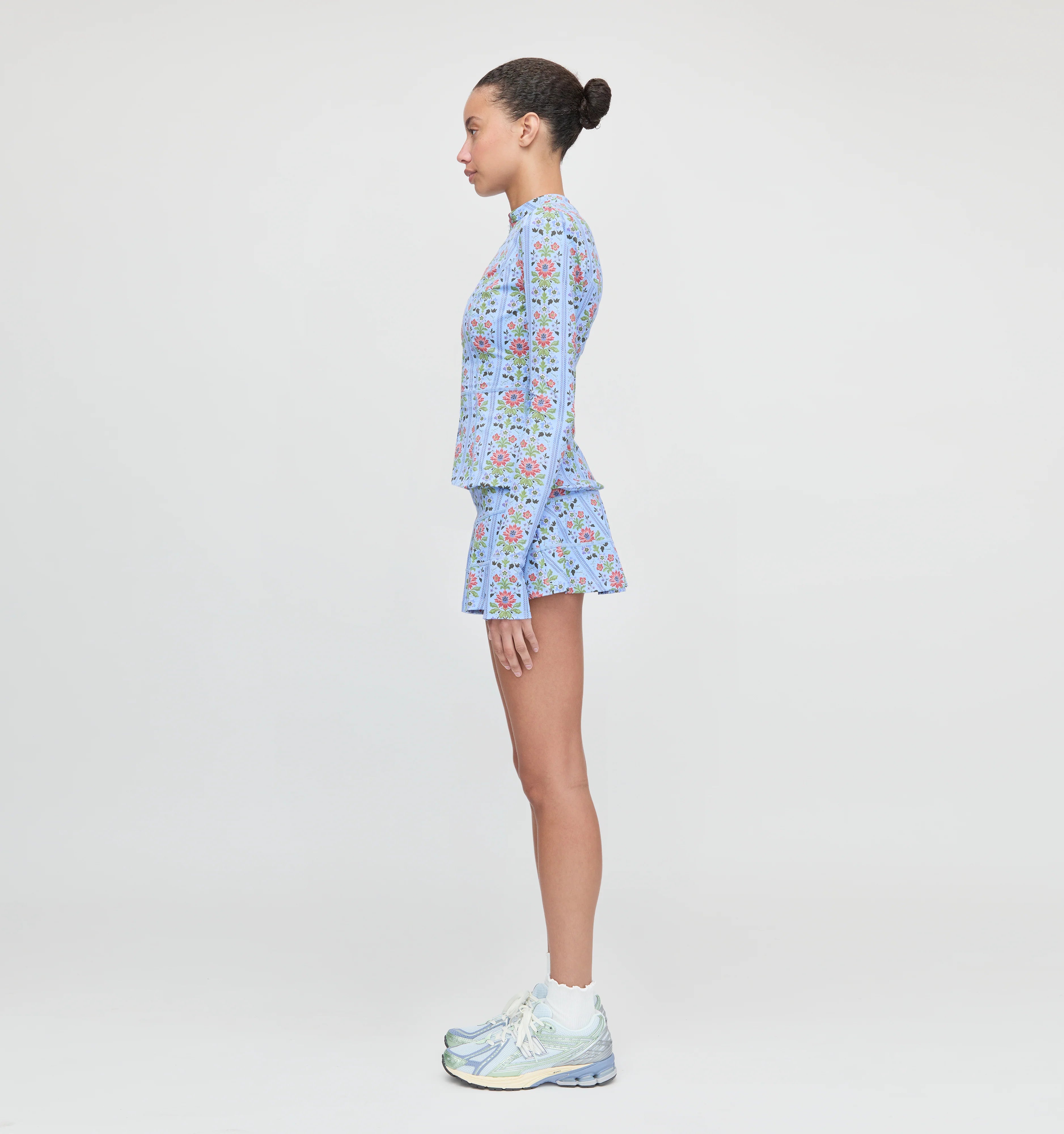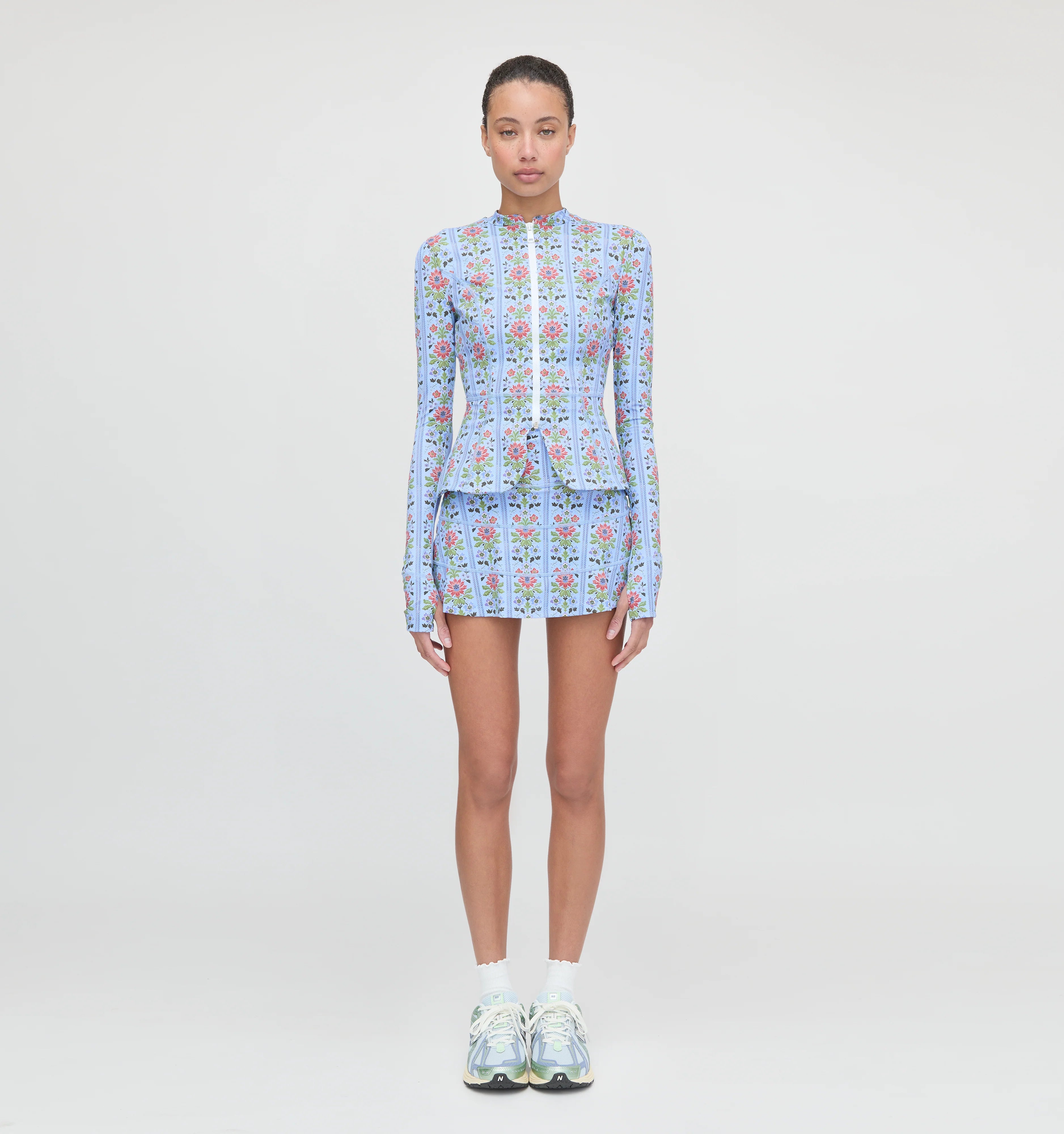 Meet the Alexia Rashguard. Alexia is a slim fit rash guard that skims the body and features a subtle peplum at the waist for an ultra-flattering fit. The functional front-zip allows for easy layering. Our favorite design detail? Thumbholes along the cuffs! Make it a set with the Riley Pool Skirt.