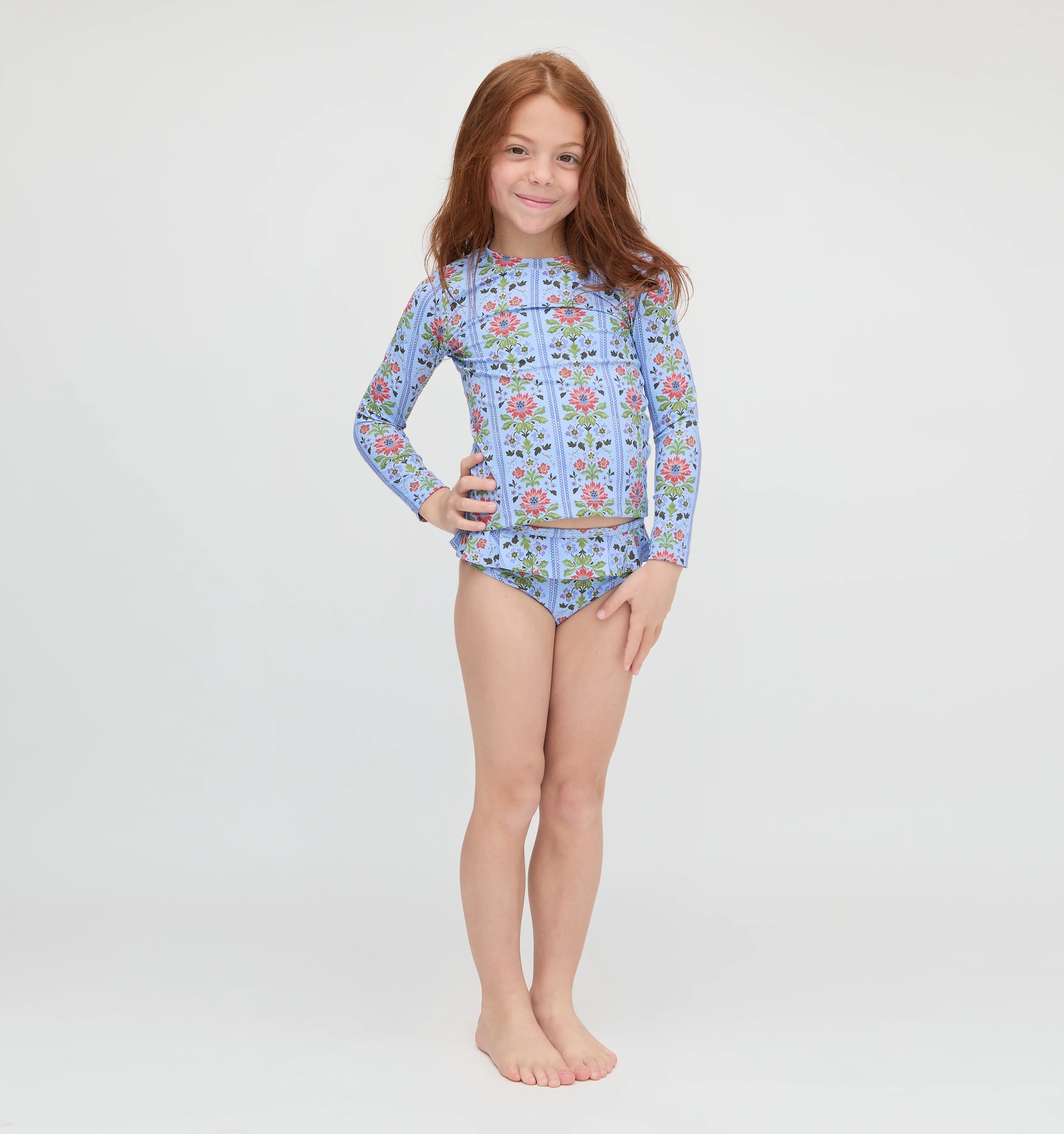 Meet the Baby Ariel Rashguard Set. This set includes a long-sleeve rash guard and ruffle swim bottoms.