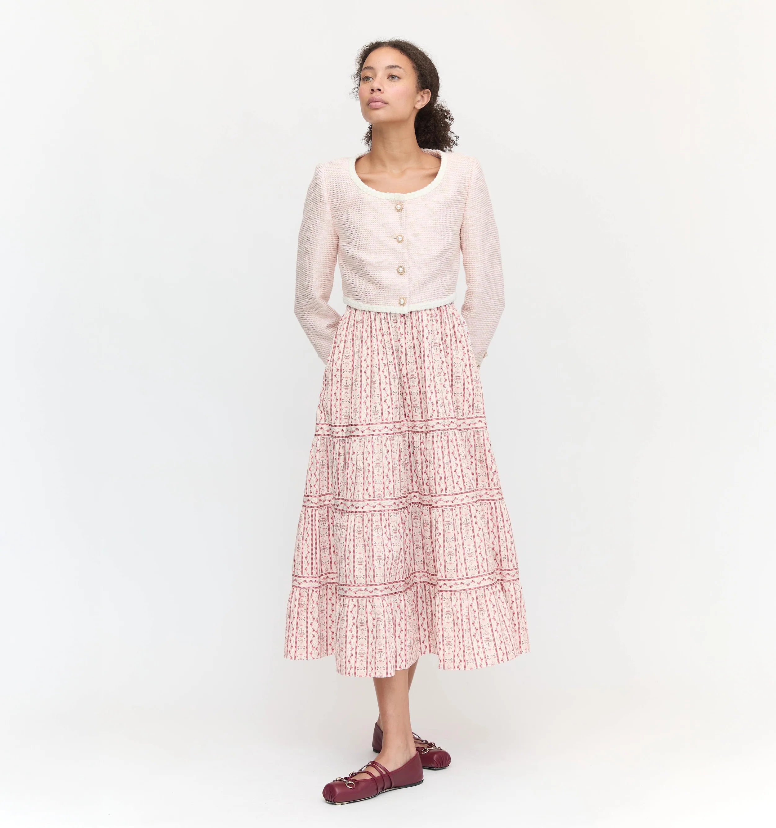Meet the Bernadette Cropped Jacket. Bernadette features a square neckline, cropped silhouette and long sleeves. Functional, pearl buttons adorn the placket and cuffs. Make it a set with the Bennett Dress.