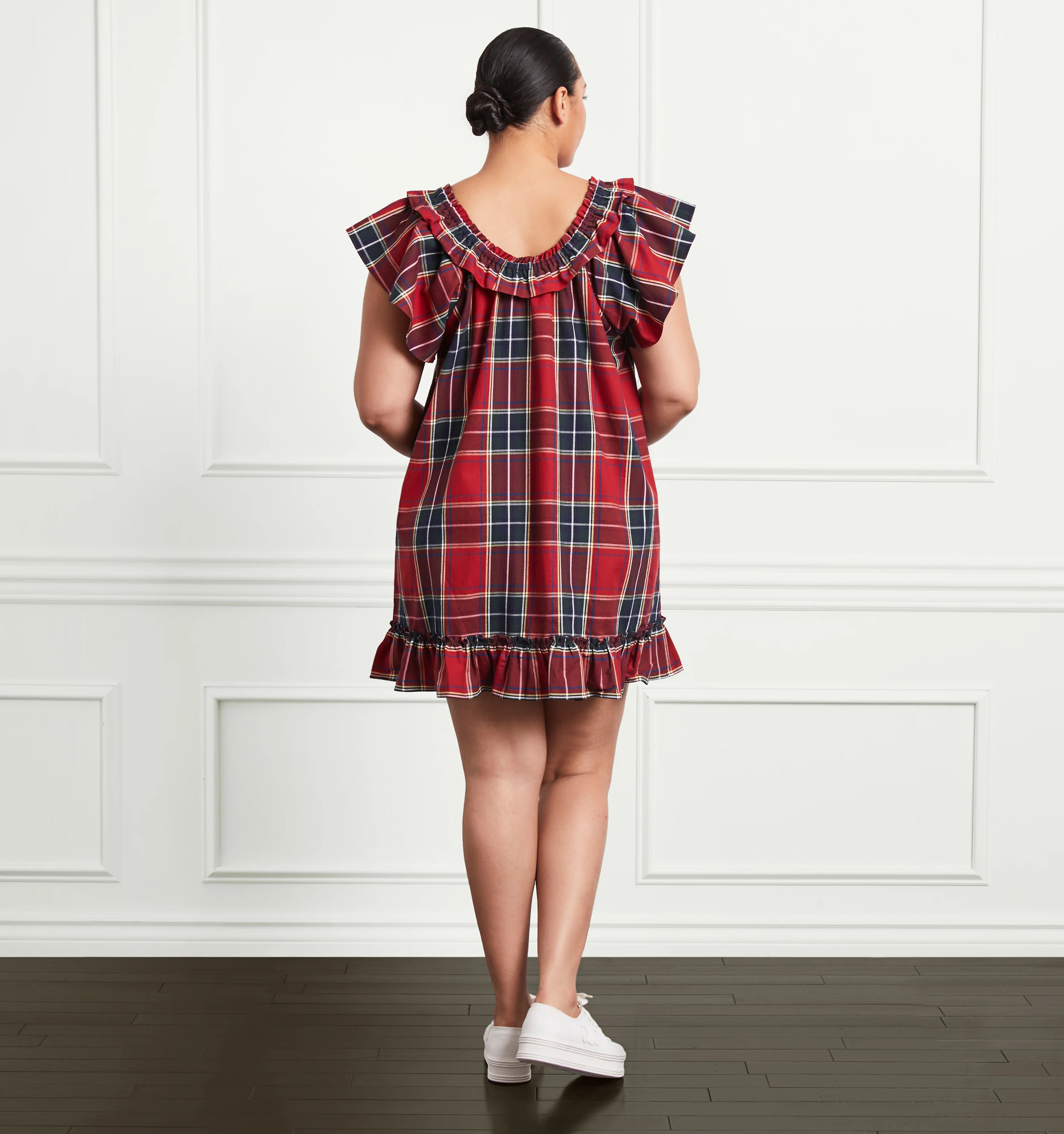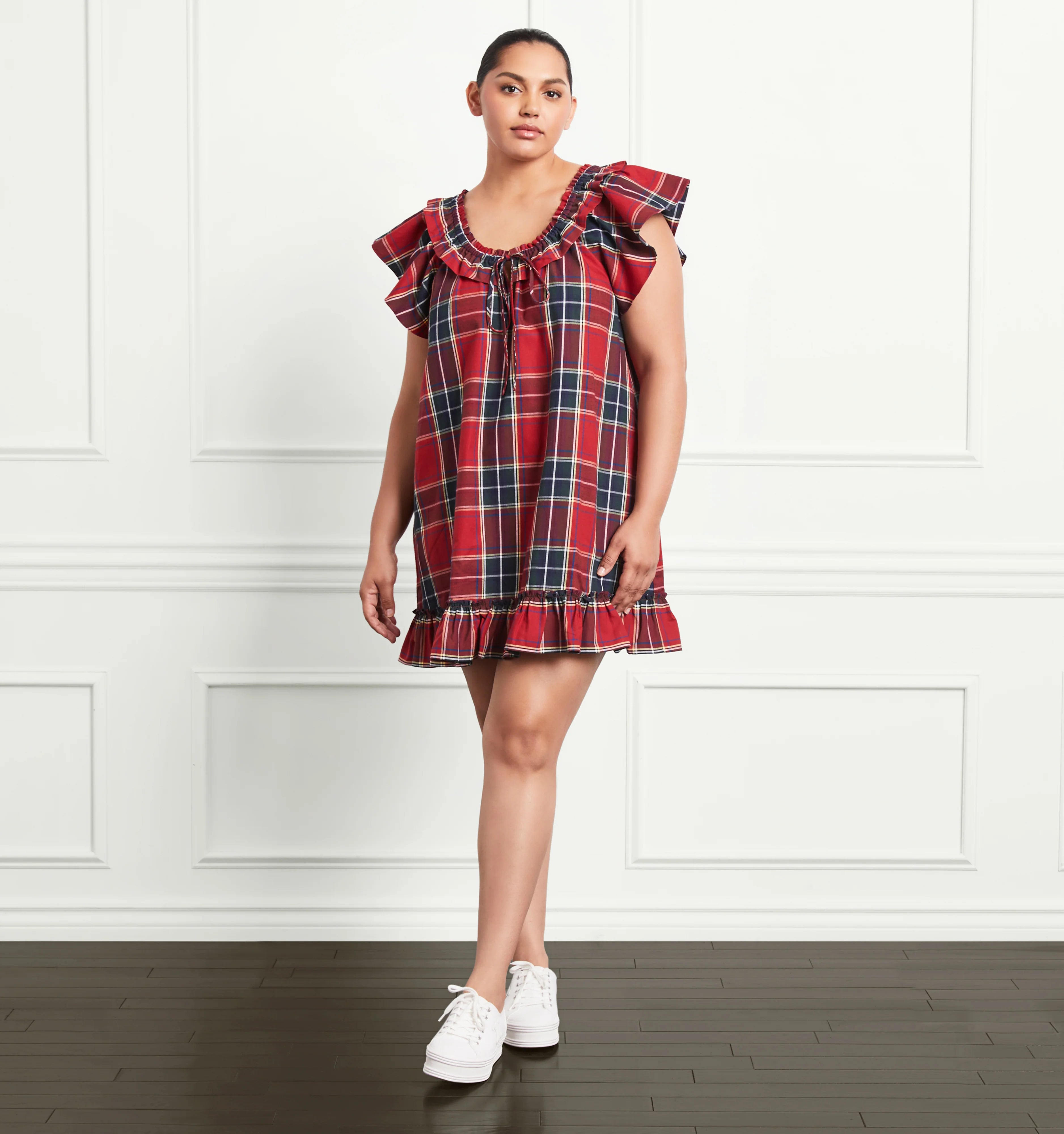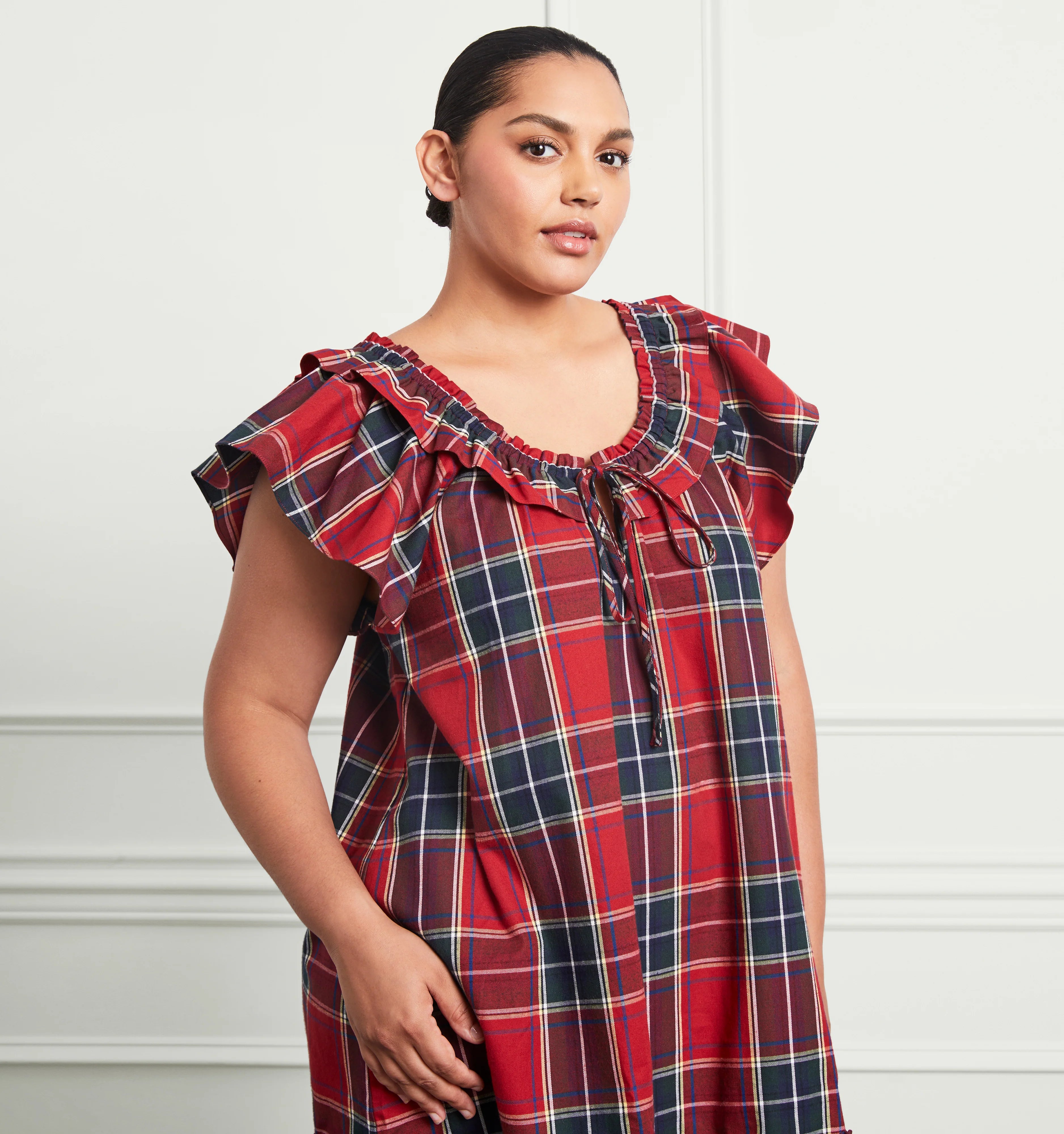 Meet Cordelia, our new dress that also doubles as a cozy holiday nightgown. It features feminine details like a double layer of ruffles at the shoulder and a functional bow at the front. We love styling it both on and off the shoulders.