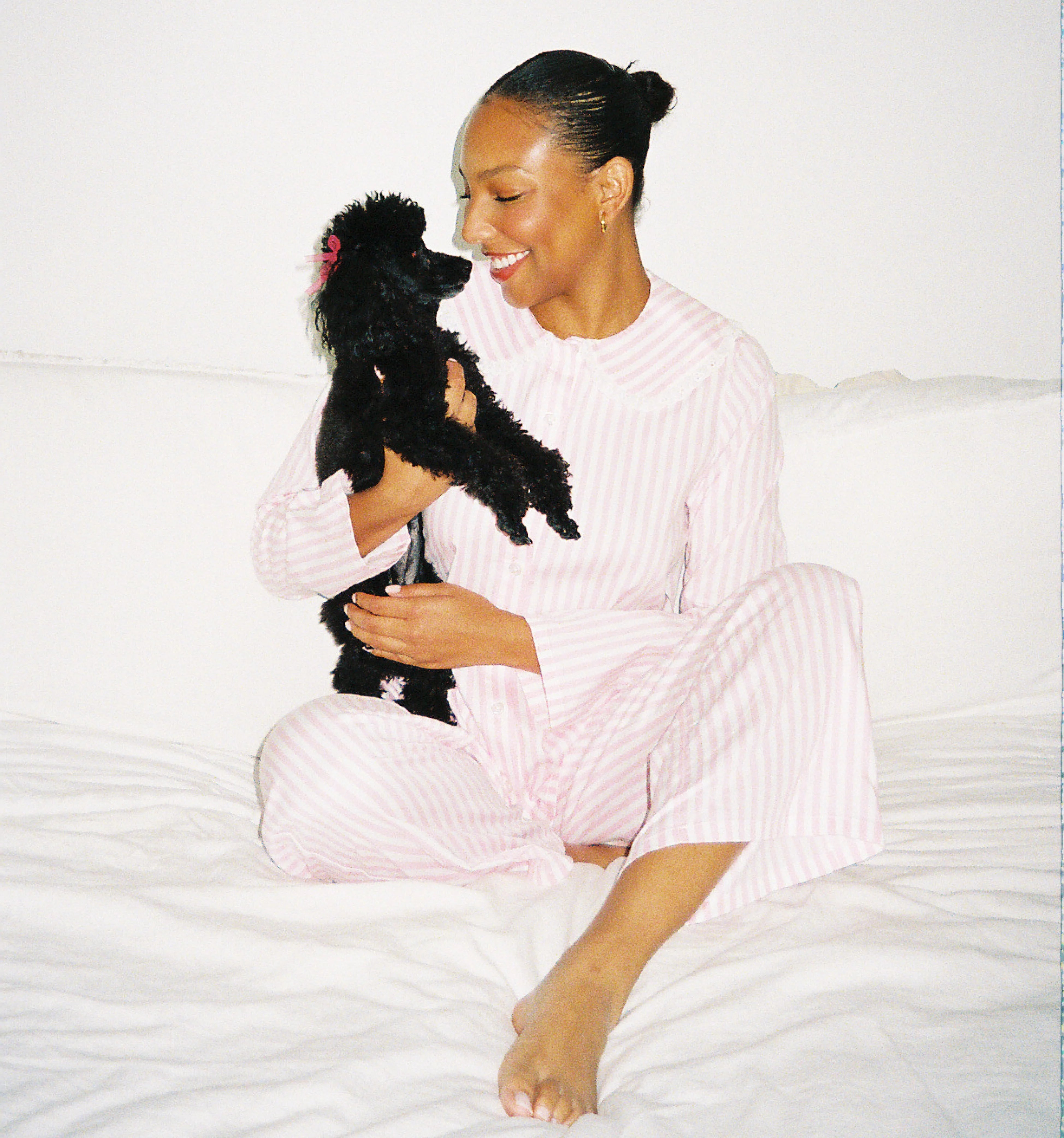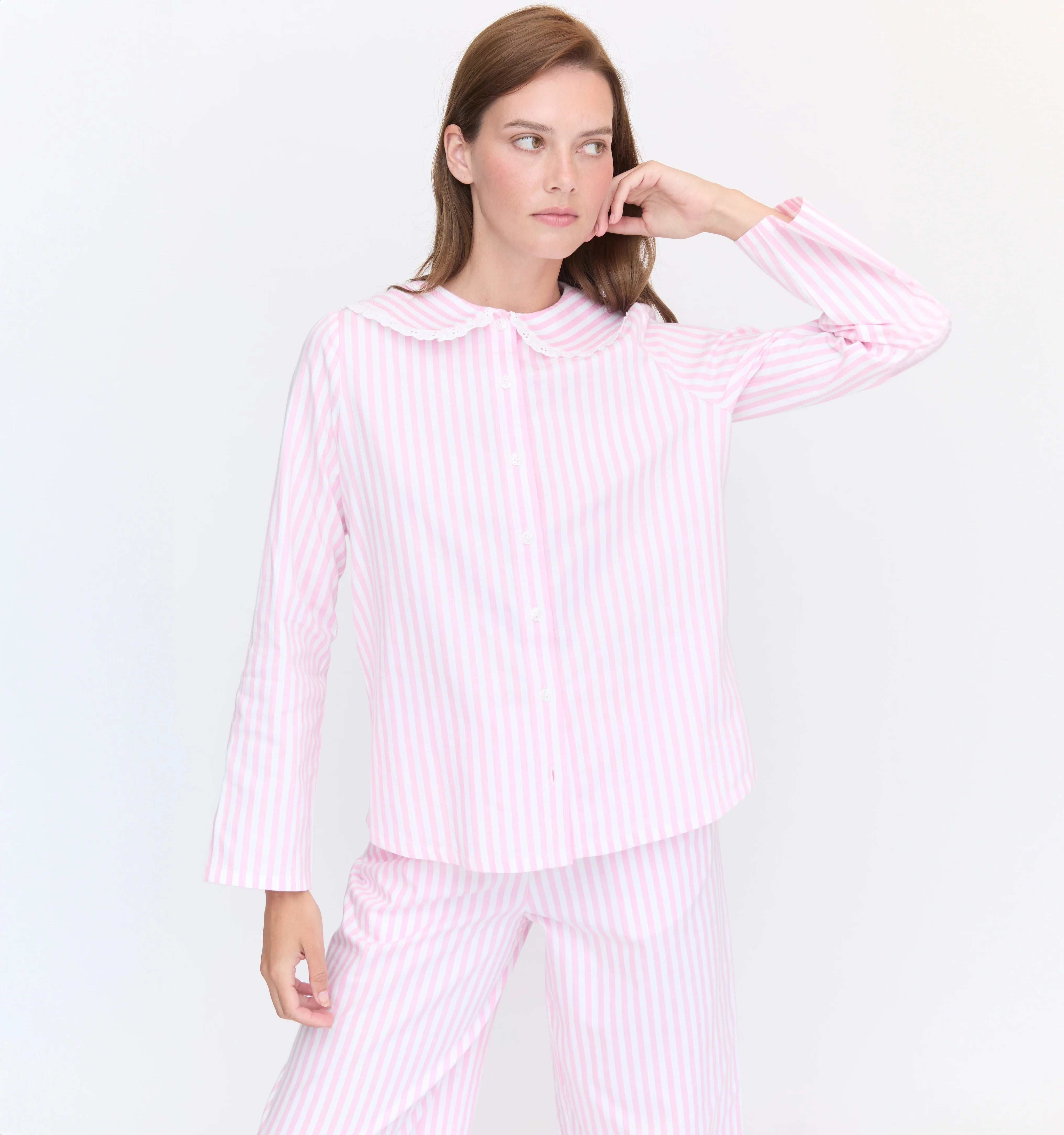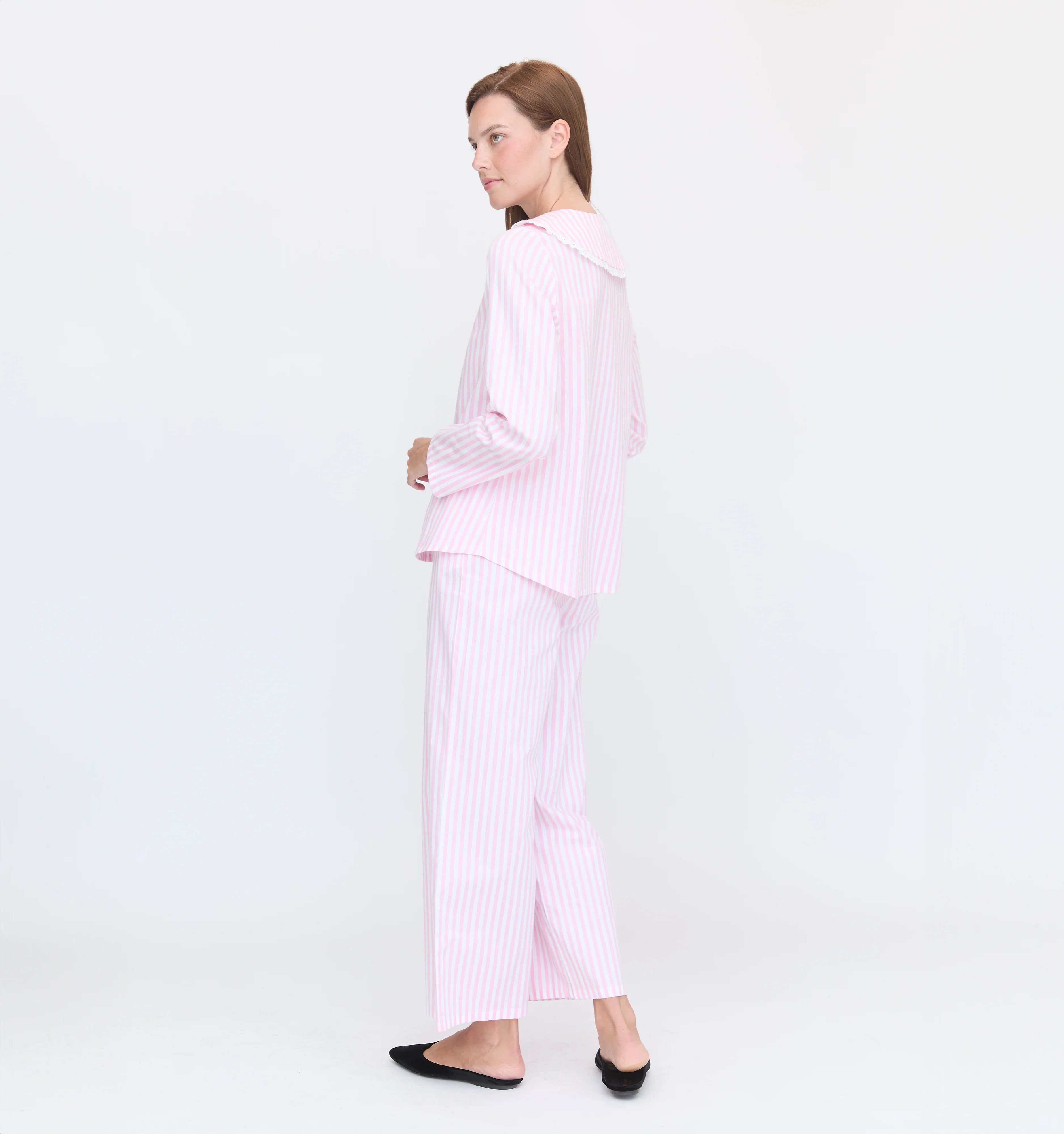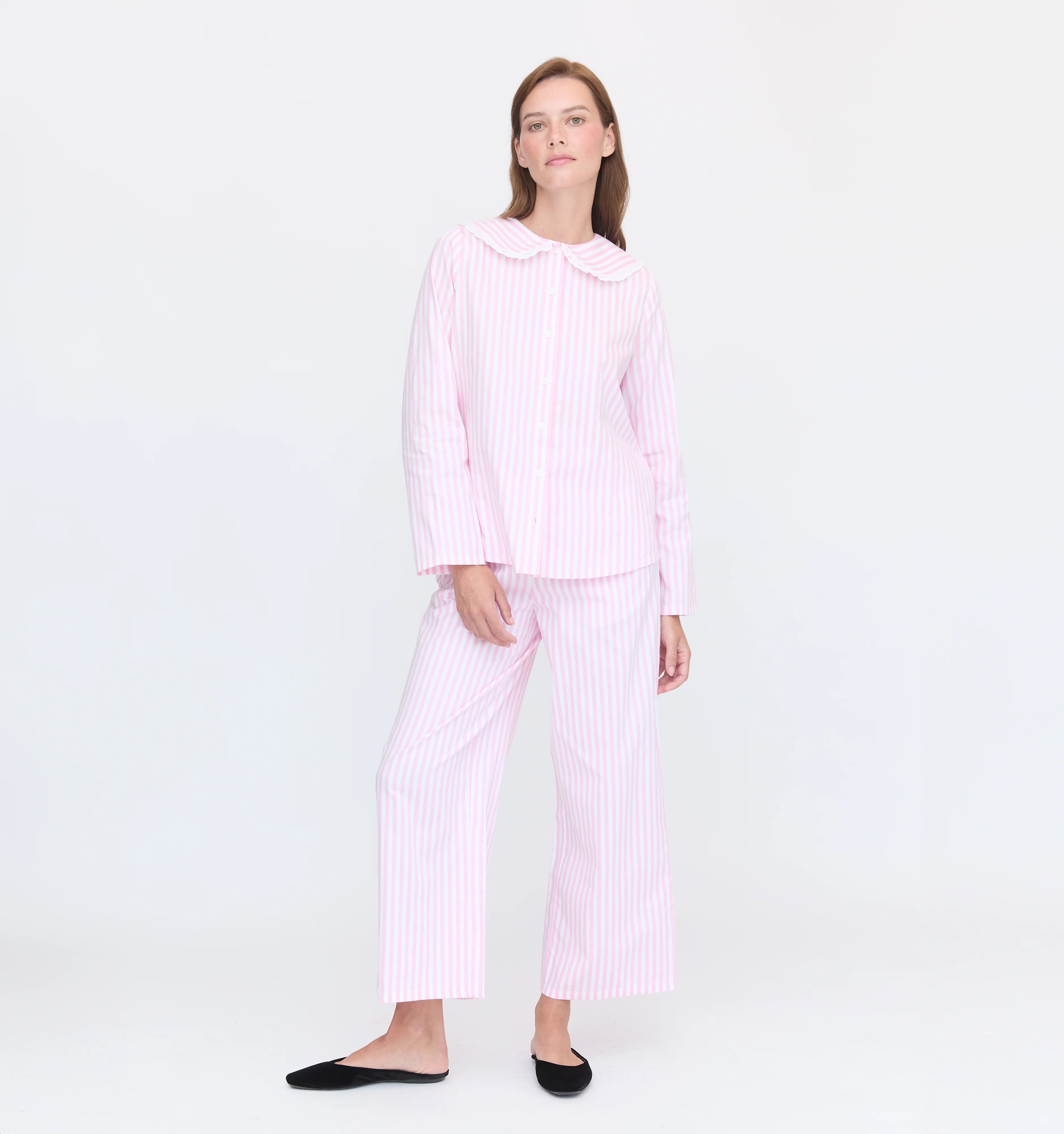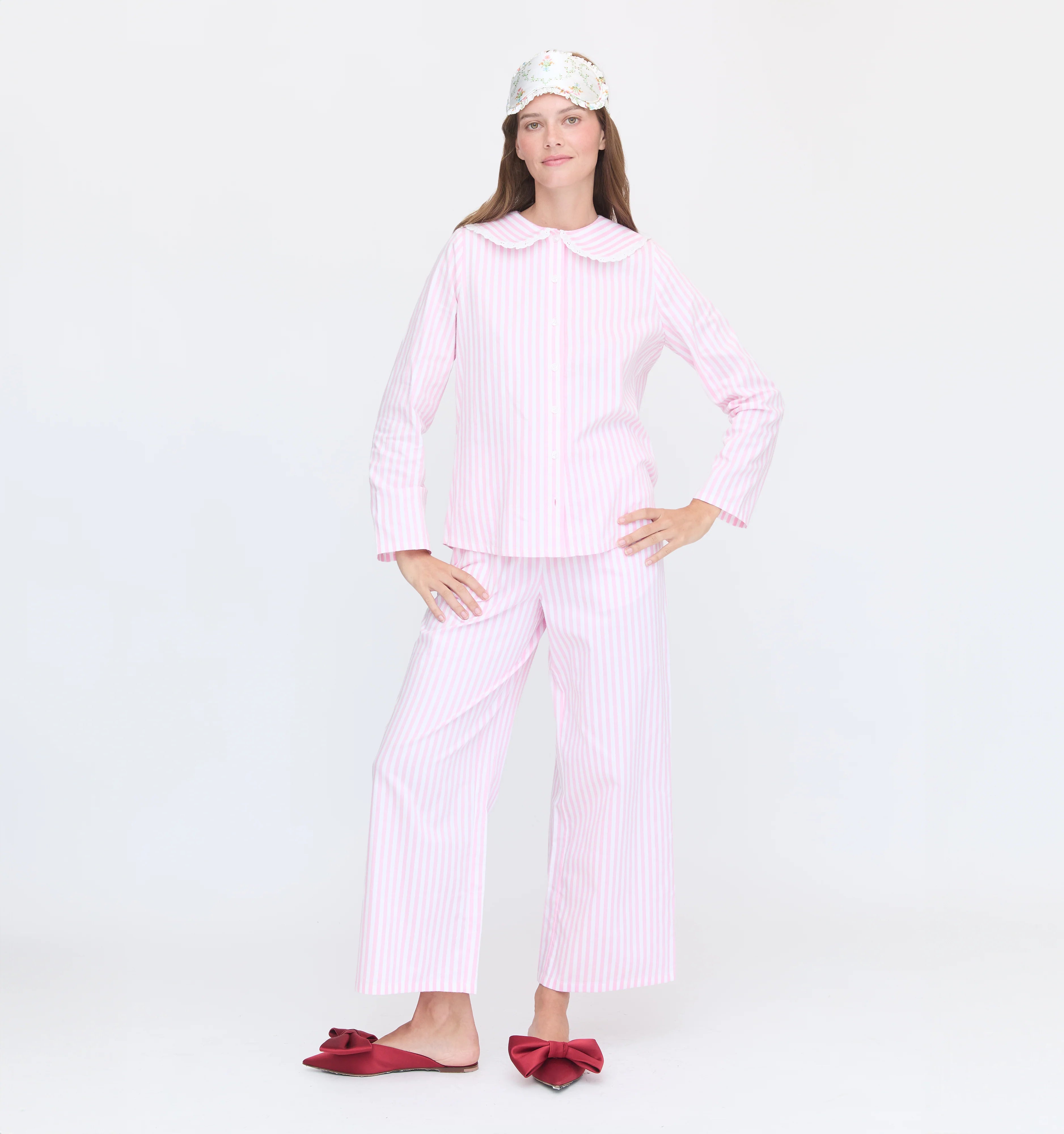 The top features a Peter Pan collar with lace-trim details while the pants have a cropped kick flare and an elastic drawstring waistband for a flexible fit.