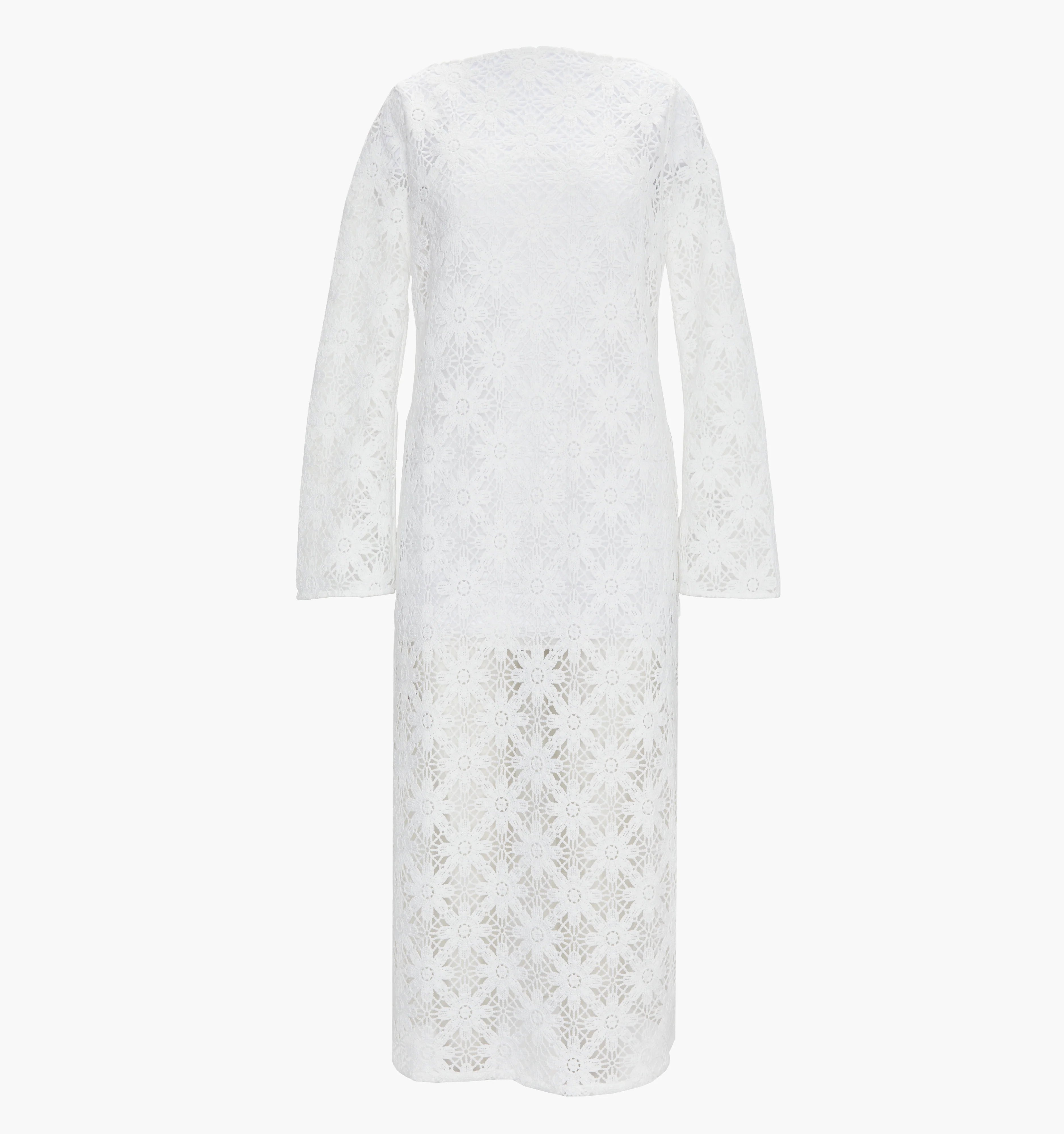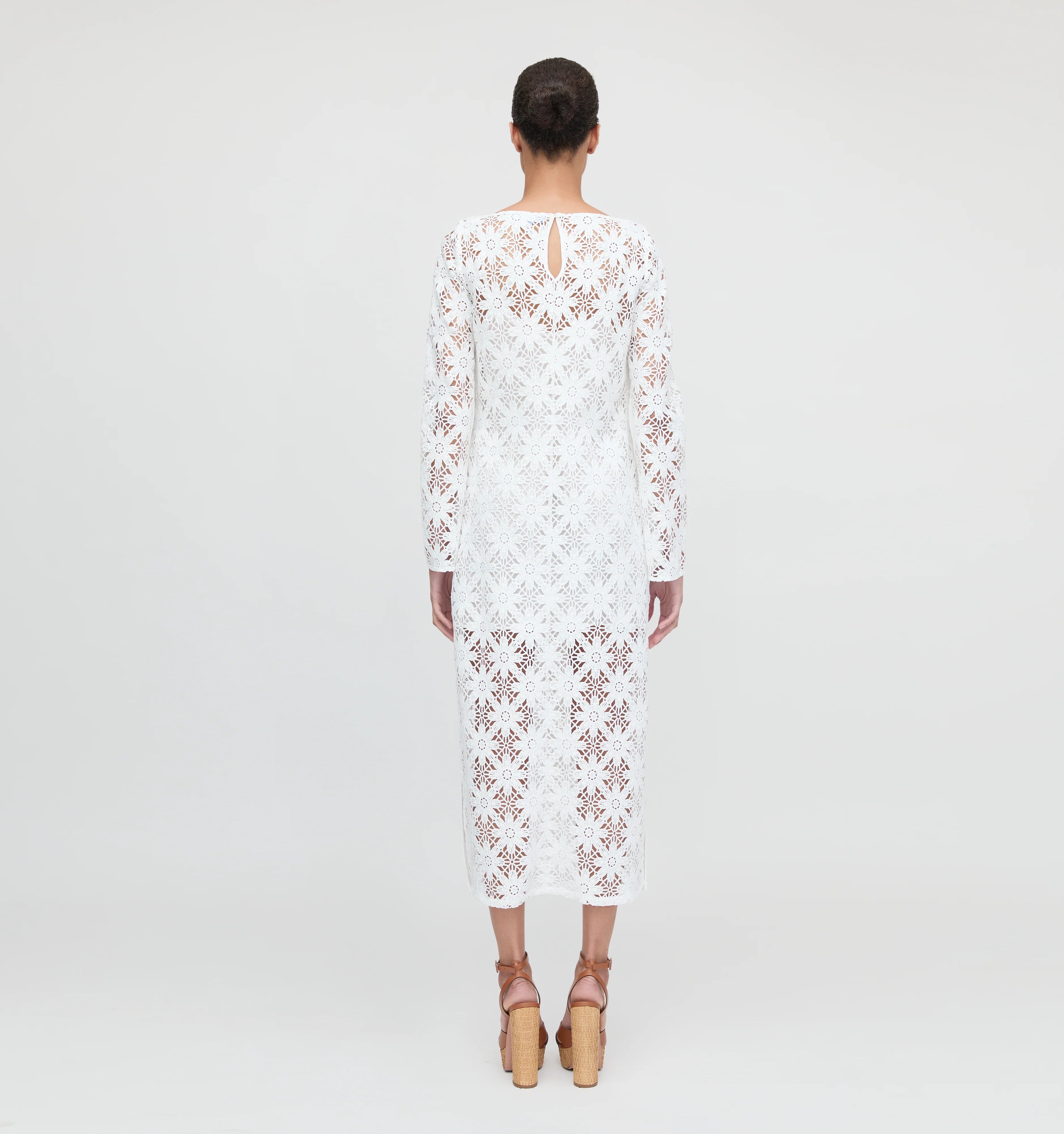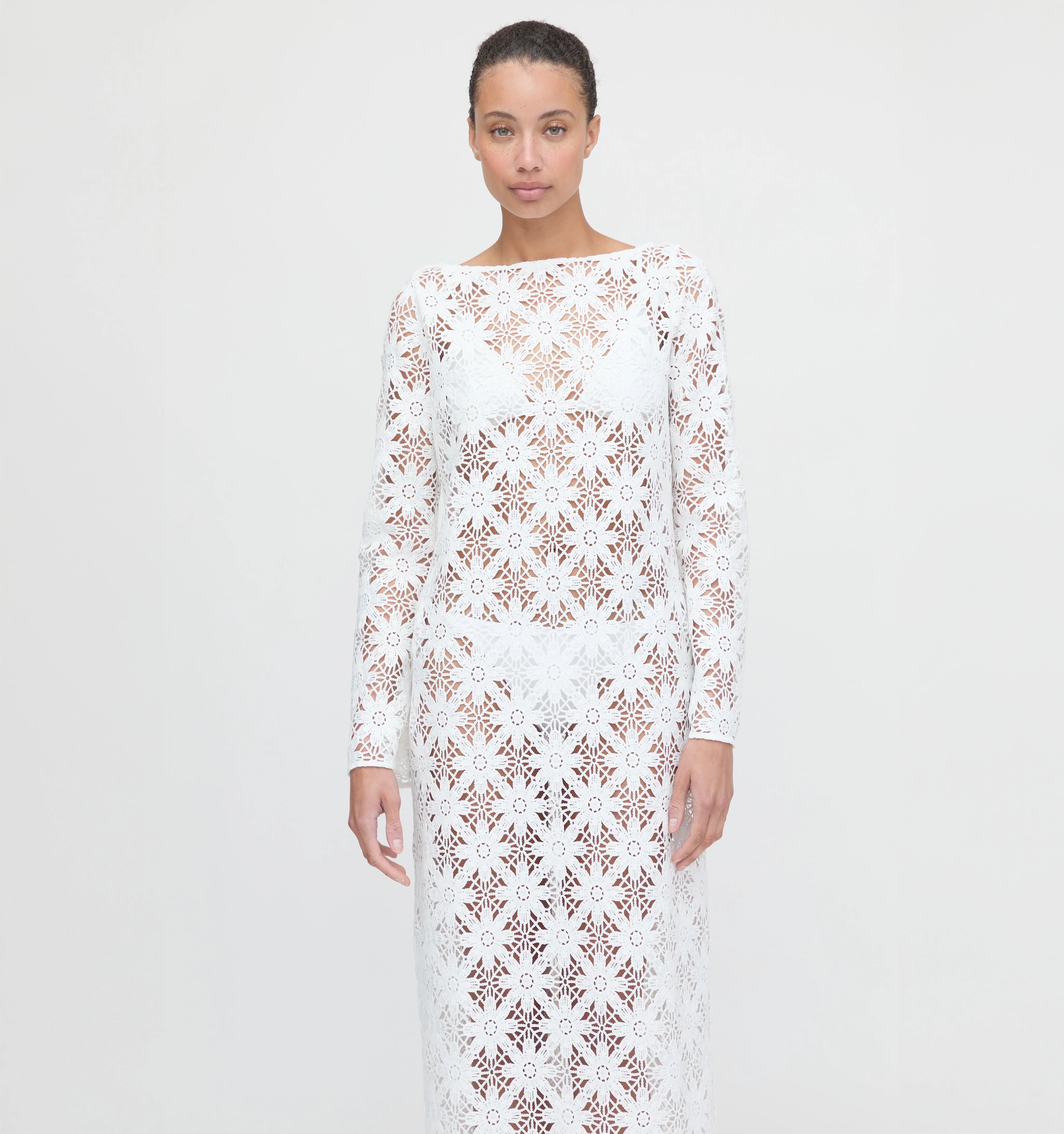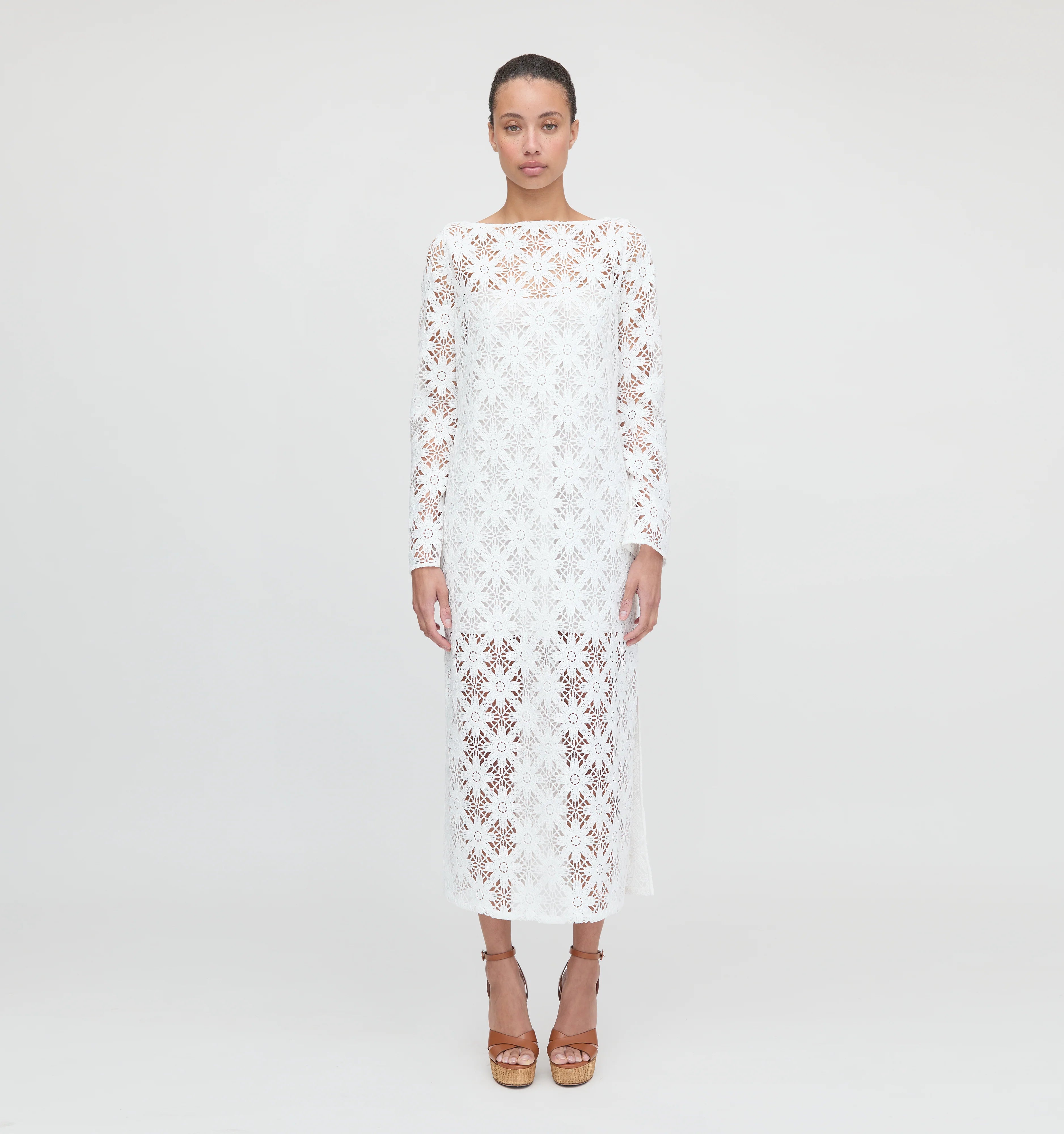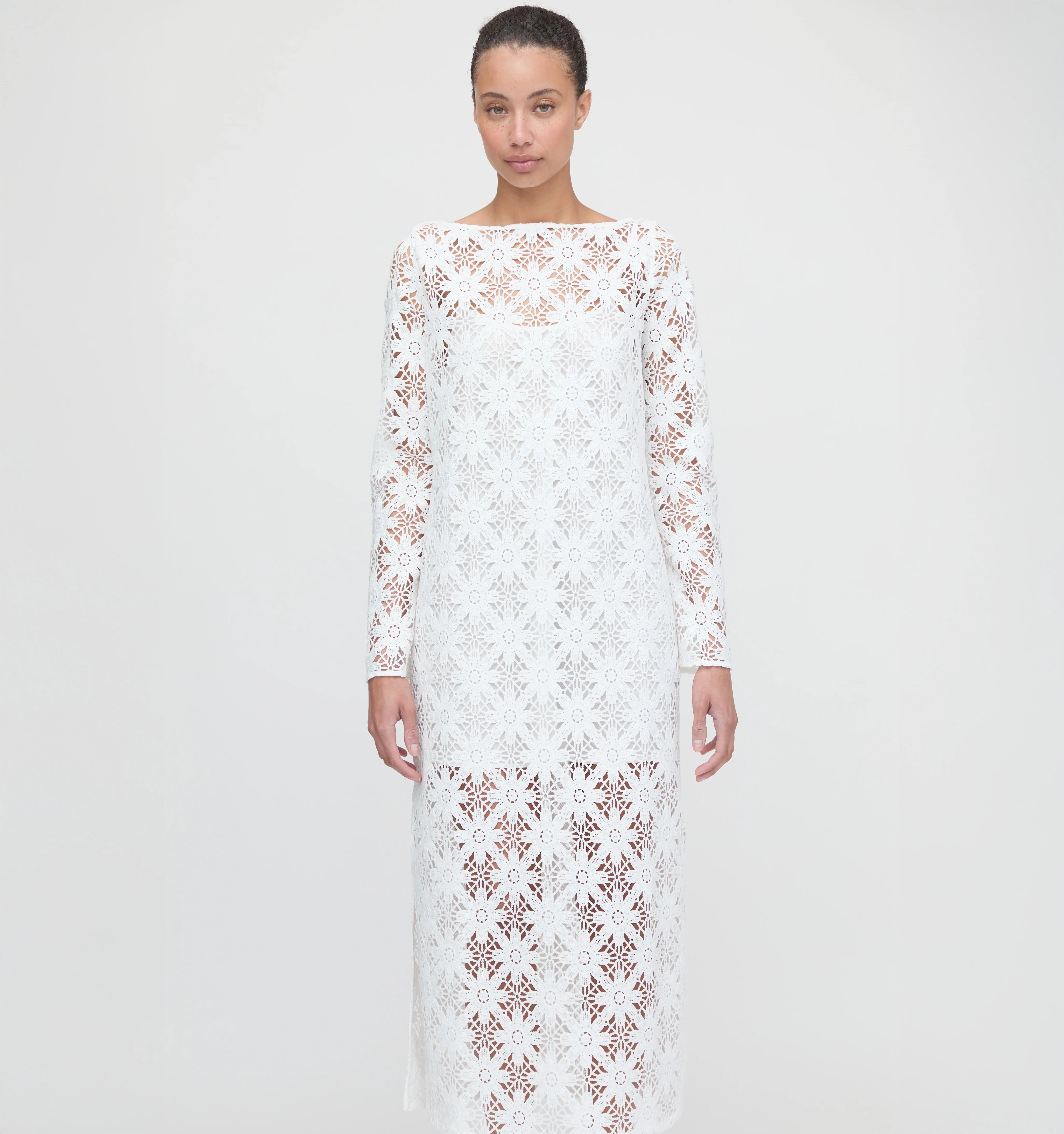 Meet the Eliza Dress. A caftan-inspired silhouette, Eliza is a true maxi dress with long sleeves and a high neck. Subtle slits adorn either side of the maxi skirt for some added movement. Beautiful crochet fabric in white comes with a white cotton slip that is removable. Style it with the slip for dinner or over a bathing suit by the pool.