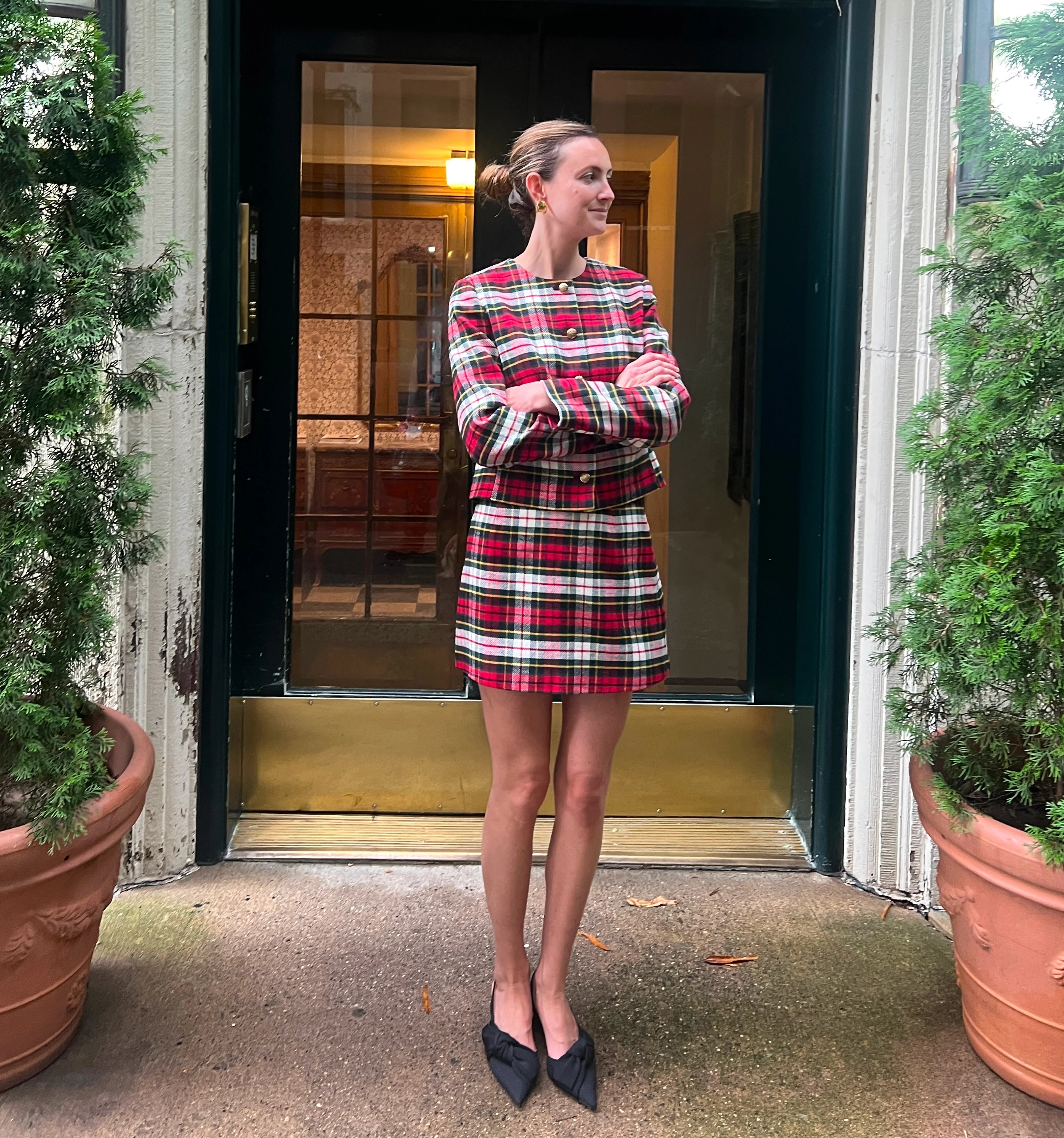 Meet the Hallie Skirt. Hallie is a high-waisted straight mini skirt with a zip in the back. Make it a set with the Virginia Jacket.