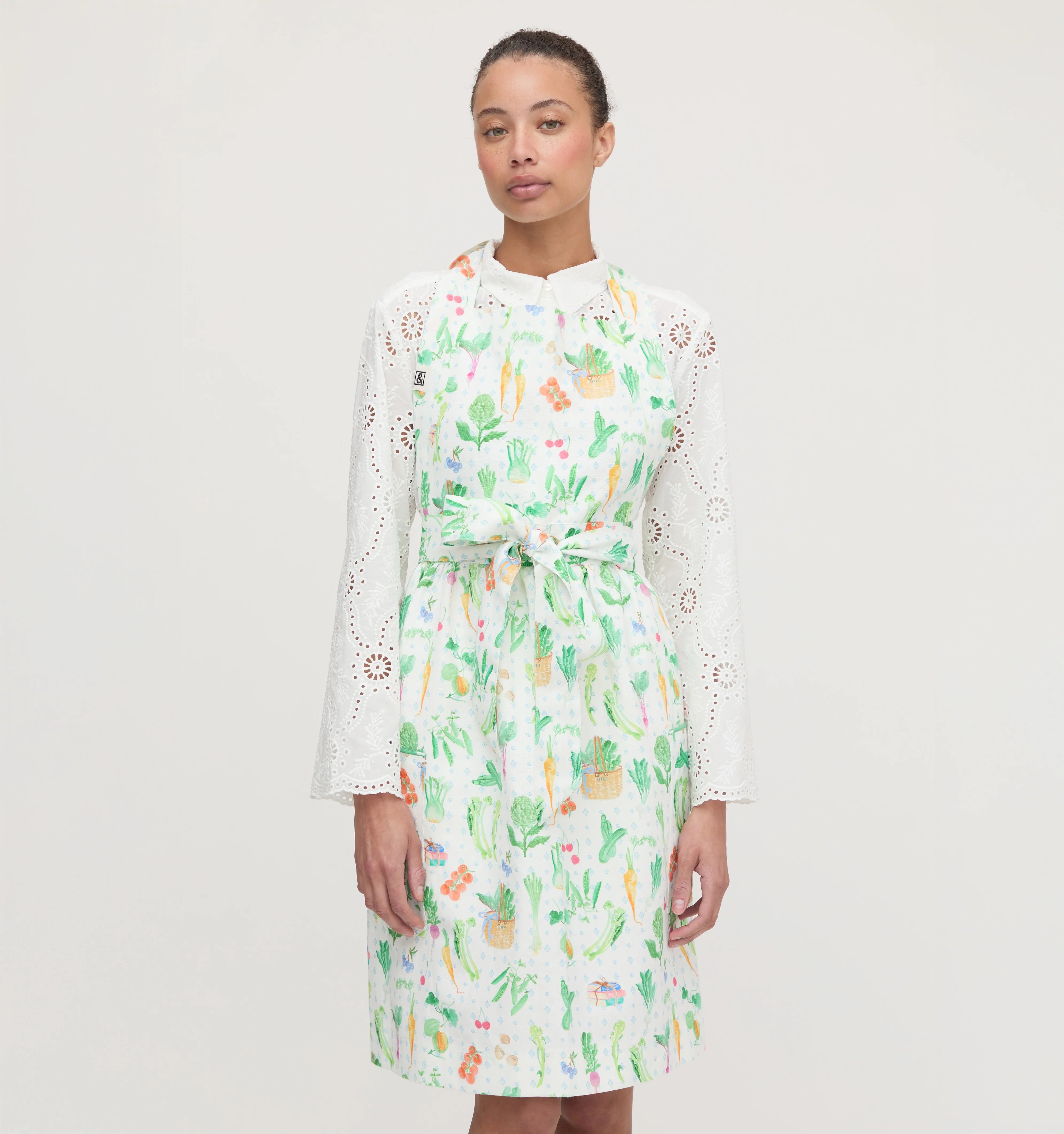 The Pinafore Apron in Farmer’s Market features a cinched waist, flared skirt, exaggerated ribbon-like ties, and big lap pockets. Made from a light yet durable cotton-linen blend, the pinafore apron has a comfortable and feminine fit designed to flatter all sizes. There’s even a 100% cotton towel loop that’s printed to match.