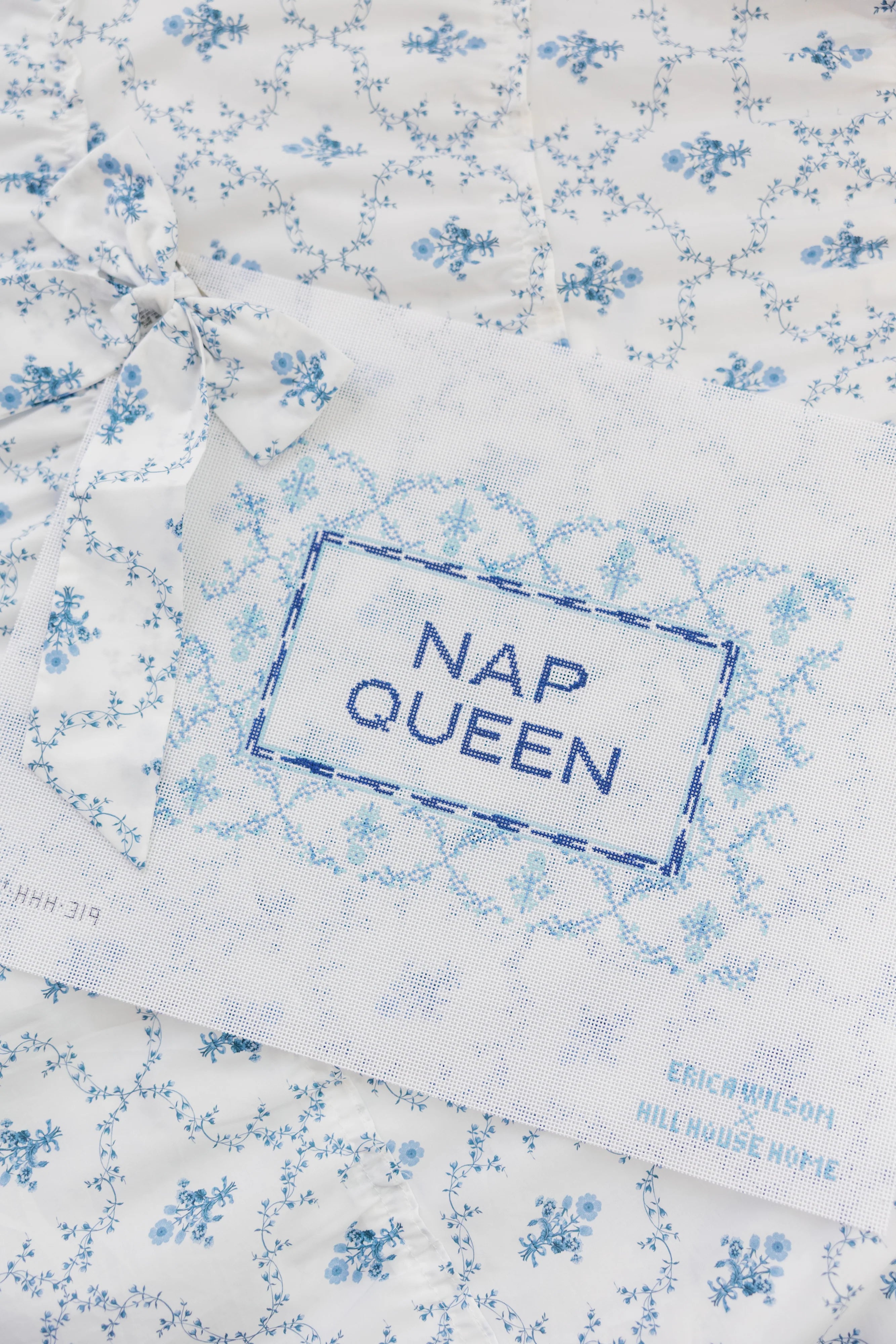 Meet the Nap Queen Pillow canvas. Featuring our Blue Trellis print, this mini pillow is designed to be perched on your bed or framed on your wall.