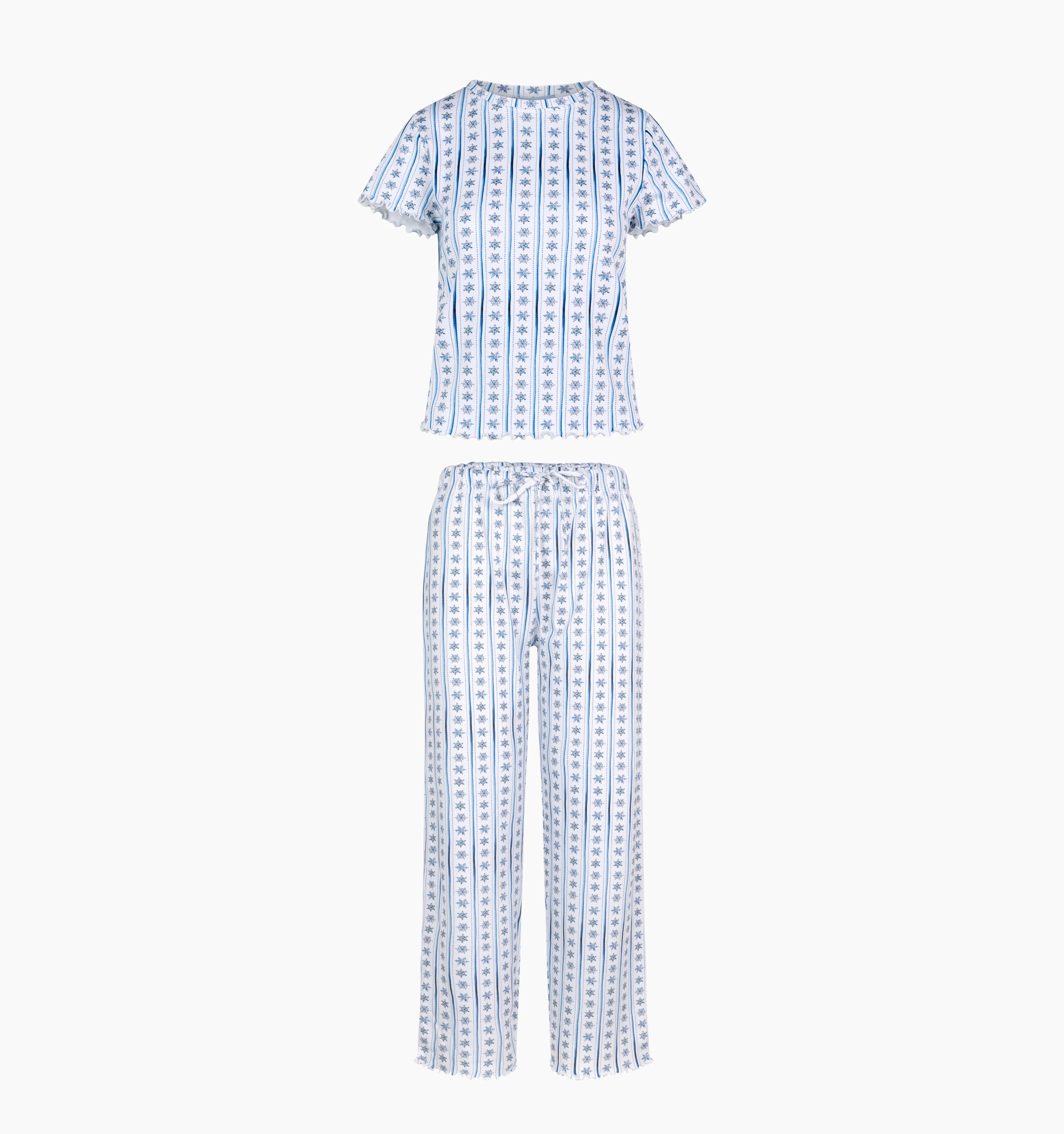 Meet the Kelly Pajama Set. Does that perfectly ruffled lettuce edge immediately make you think of slumber parties with all of your besties eating Pizza Bagels with Clueless on the big screen and the fresh scent of face masks and nail polish remover? No? Just me? Either way, the Kelly Pajama Set is perfect. The Kelly Pajama Set is a short sleeve t-shirt and pant set made from the softest, stretchiest organic cotton interlock fabric – the same fabric we use in our baby products, so you too can sleep like a baby.