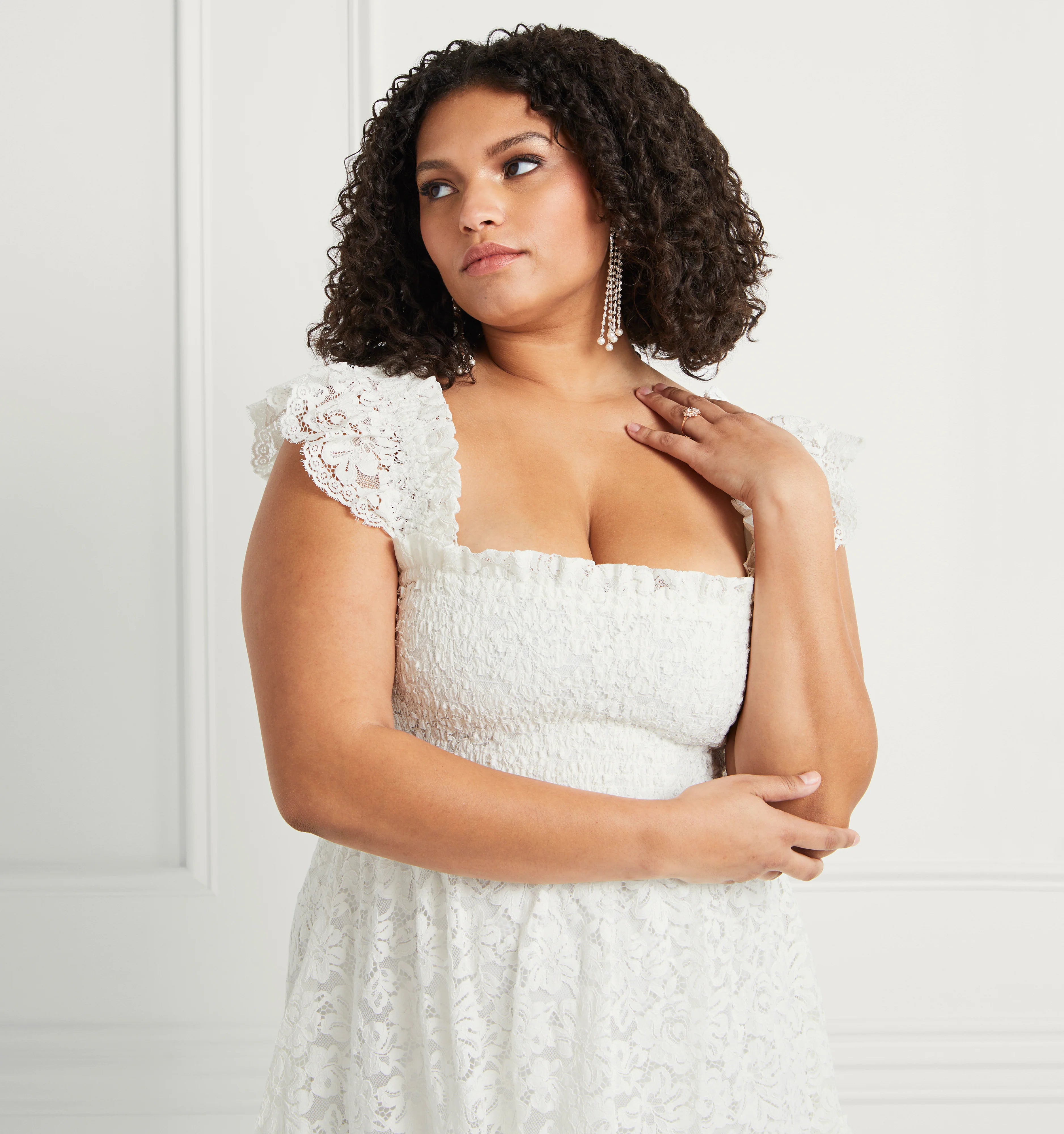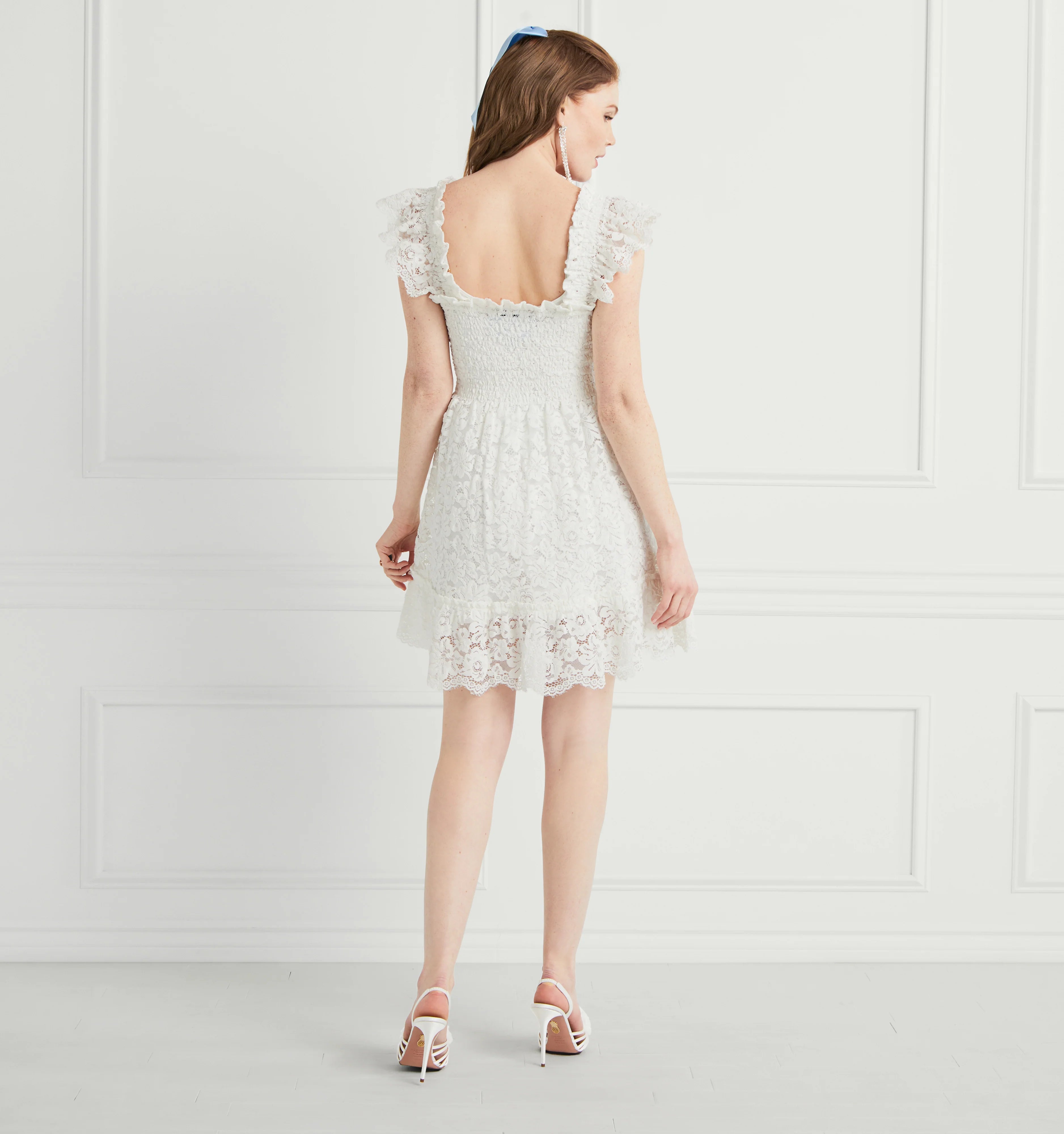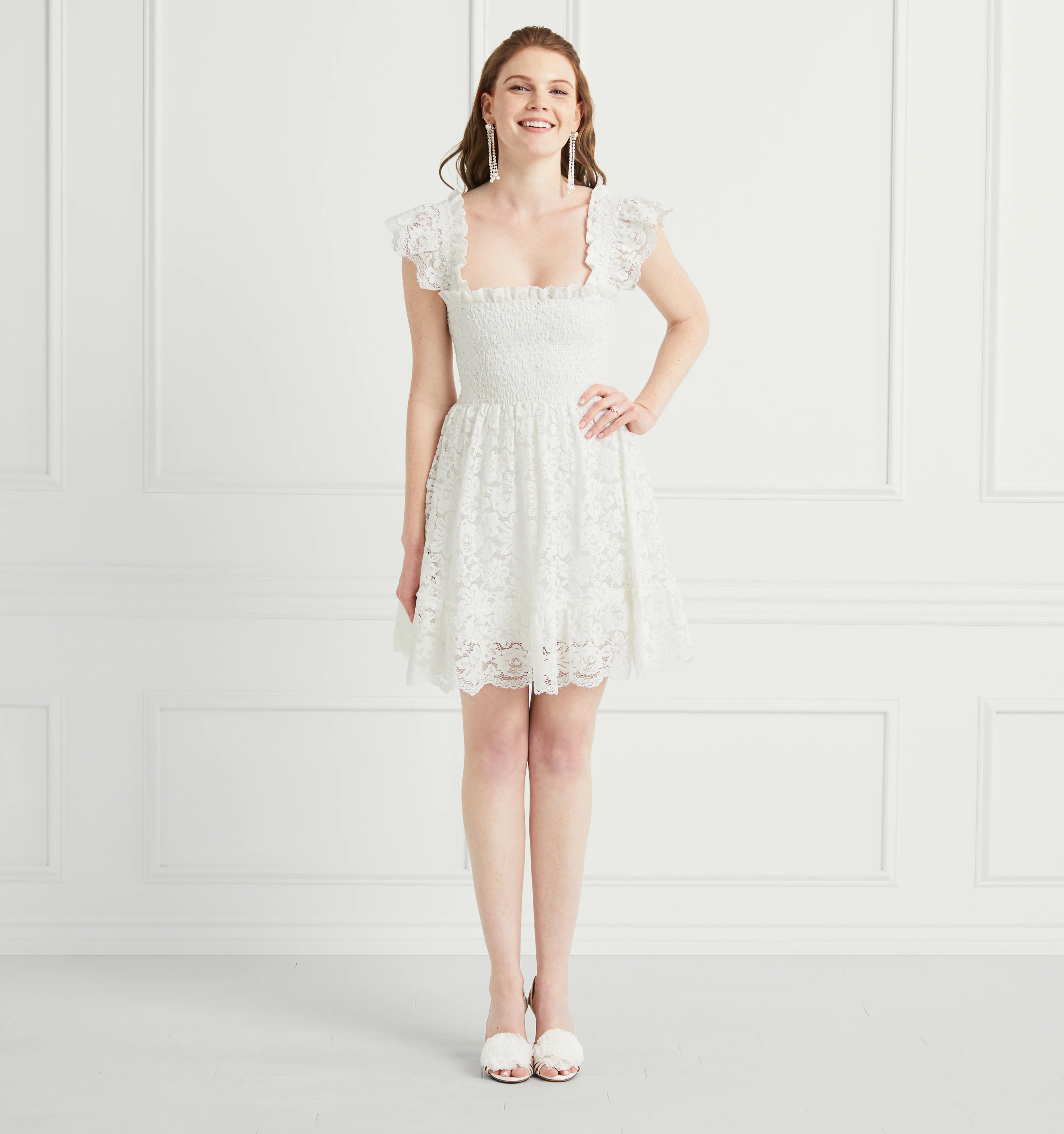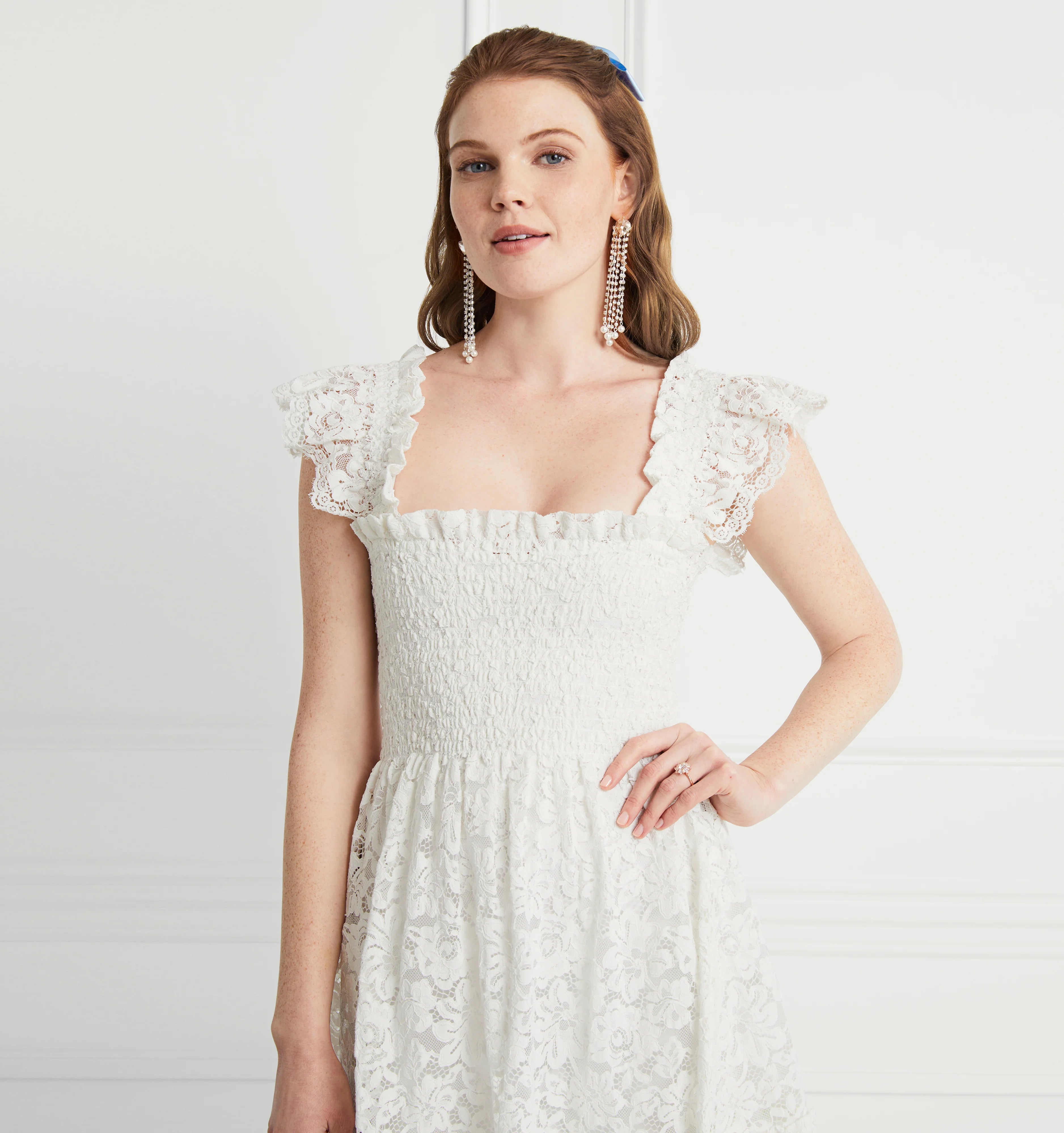 An exciting new addition to our Collector's edit, meet the Lace Elizabeth Nap Dress®. Collector’s Edition pieces are extra special versions of our signature styles, made from elevated fabrics. The Lace Elizabeth Nap Dress® has elasticated smocking, ruffled shoulders, a mini-length skirt, and pockets. It’s a shorter version of our bestselling Ellie Nap Dress®, but now in unlined white lace, making it styleable for any bridal event. Throw on, and go!