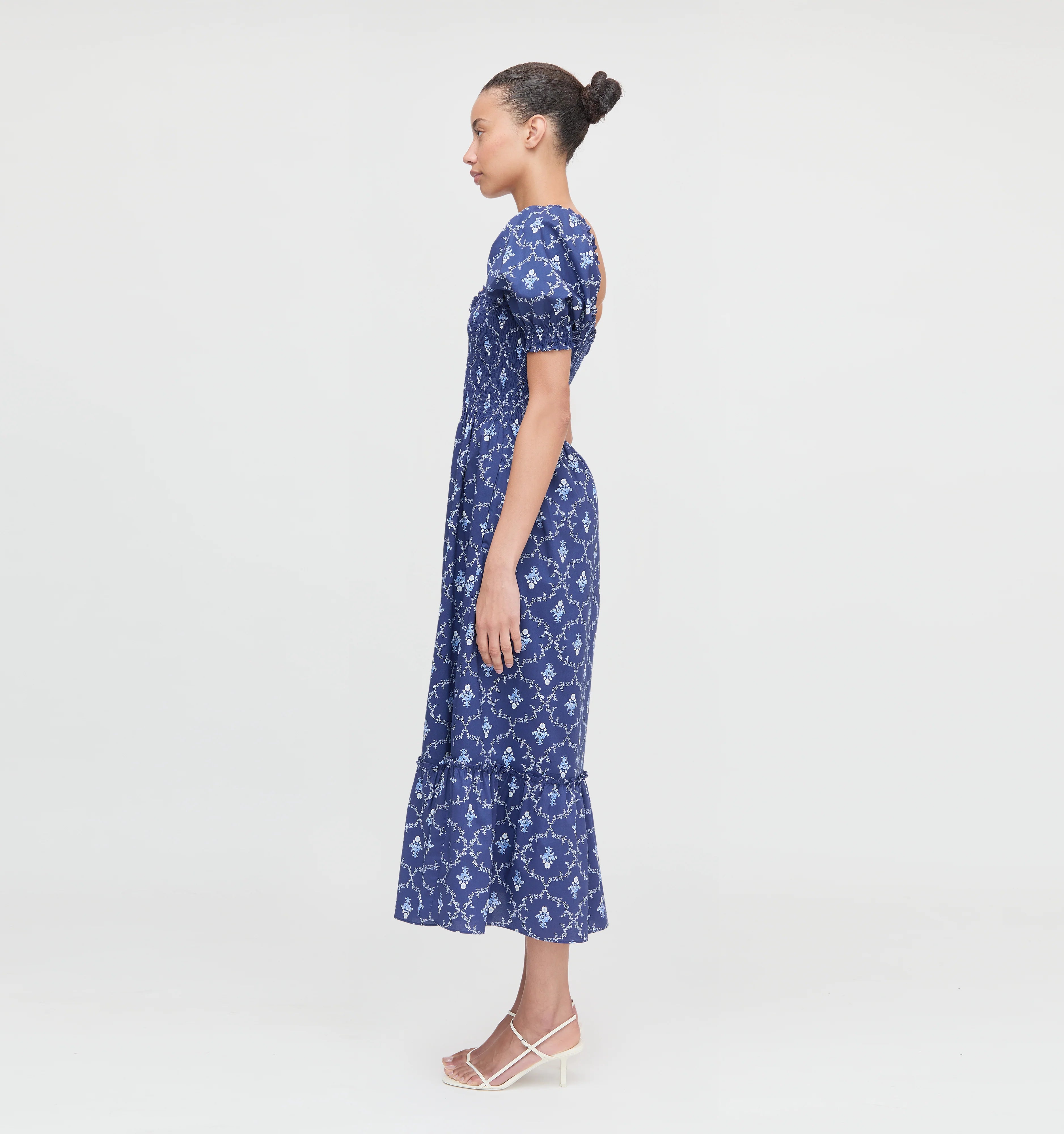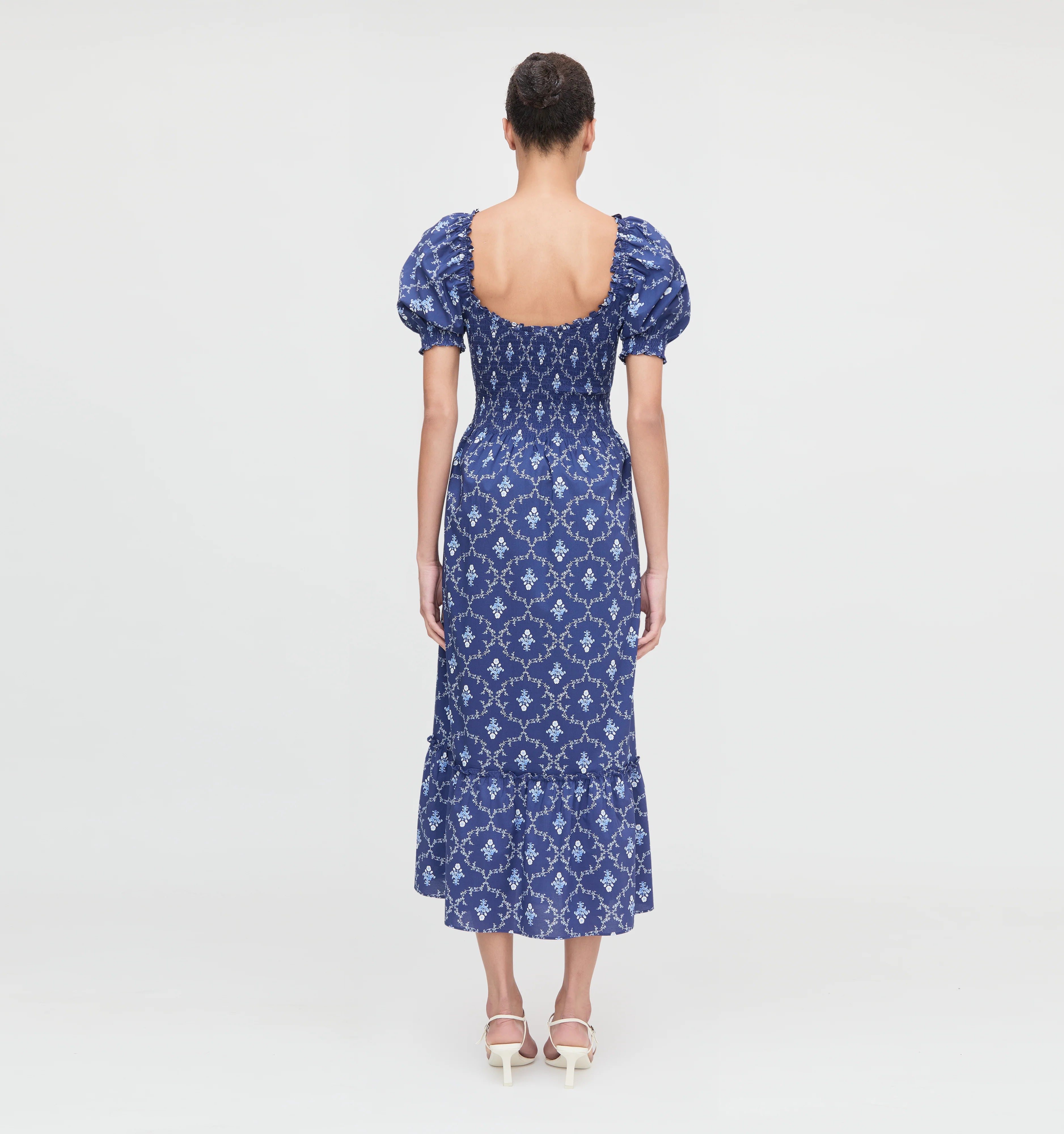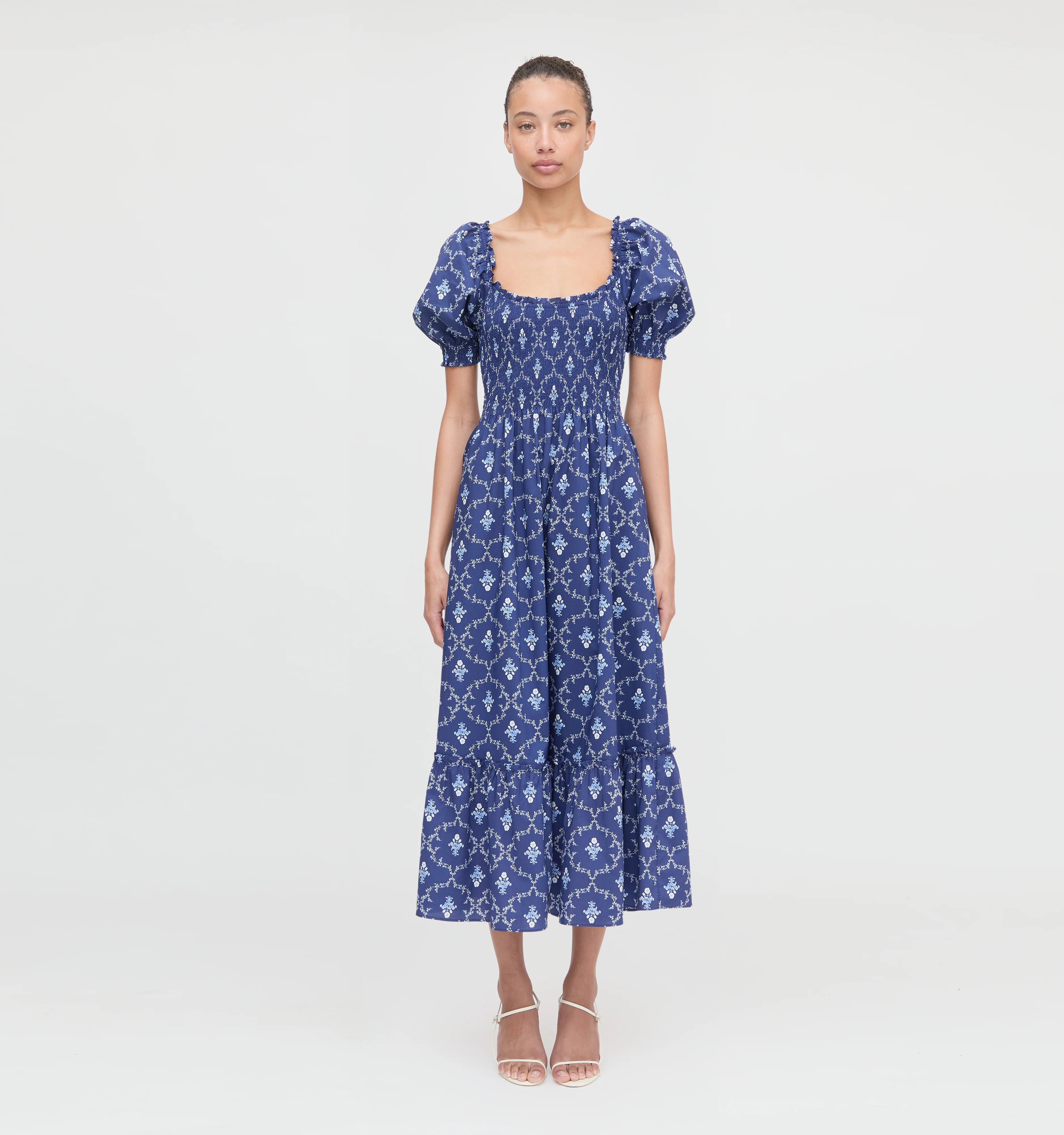 Meet the Louisa Nap Dress®. Louisa features our proprietary, elasticated Nap Smocking, a bra-friendly scooped neckline, ruffle hem midi skirt in an updated length and puff sleeves.