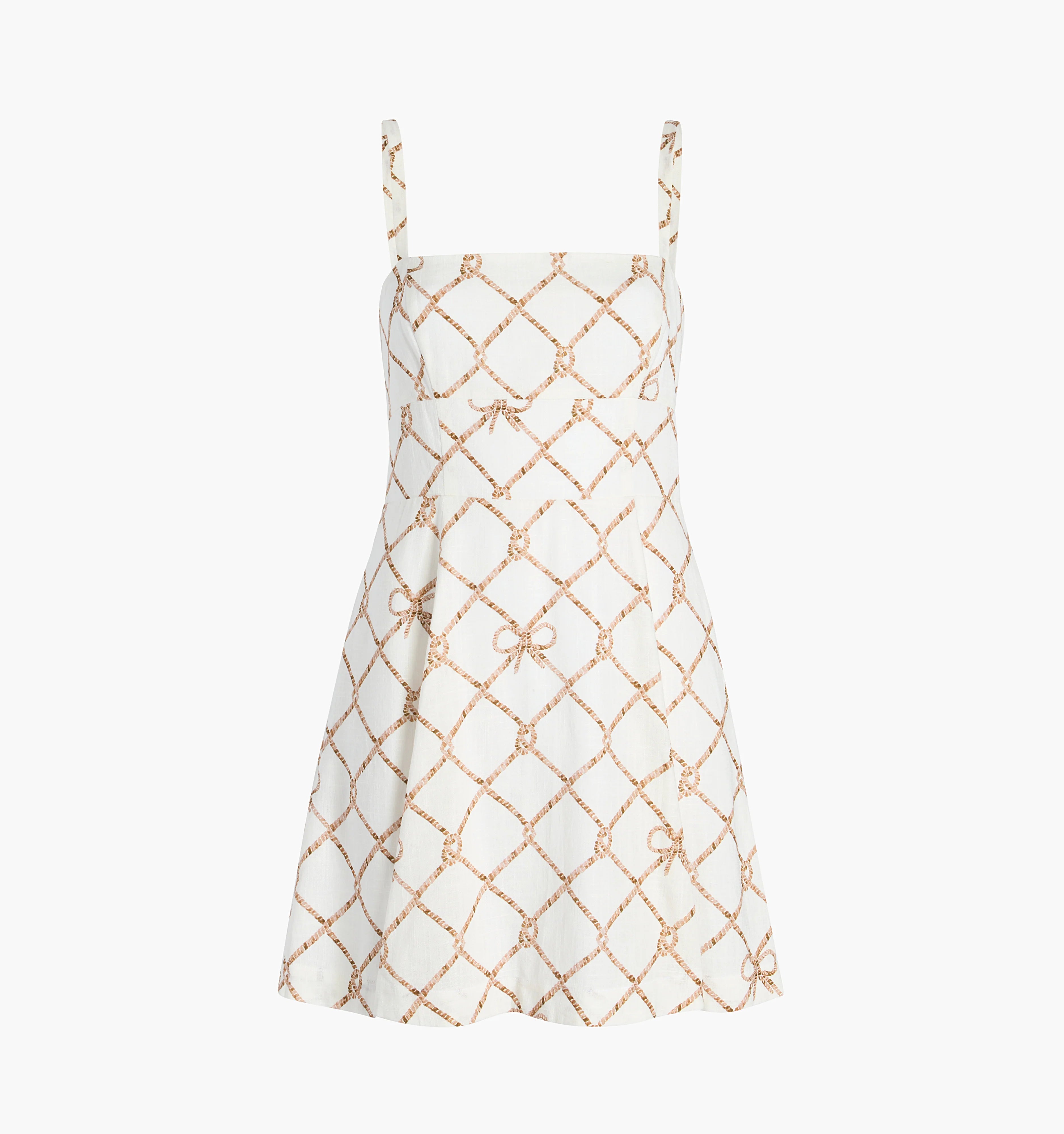 Offered exclusively in Linen, the Nautical Trellis print is an ode to coastal summers. Warm, neutral toned ropes criss cross into trellis and wind into bows against a white ground.