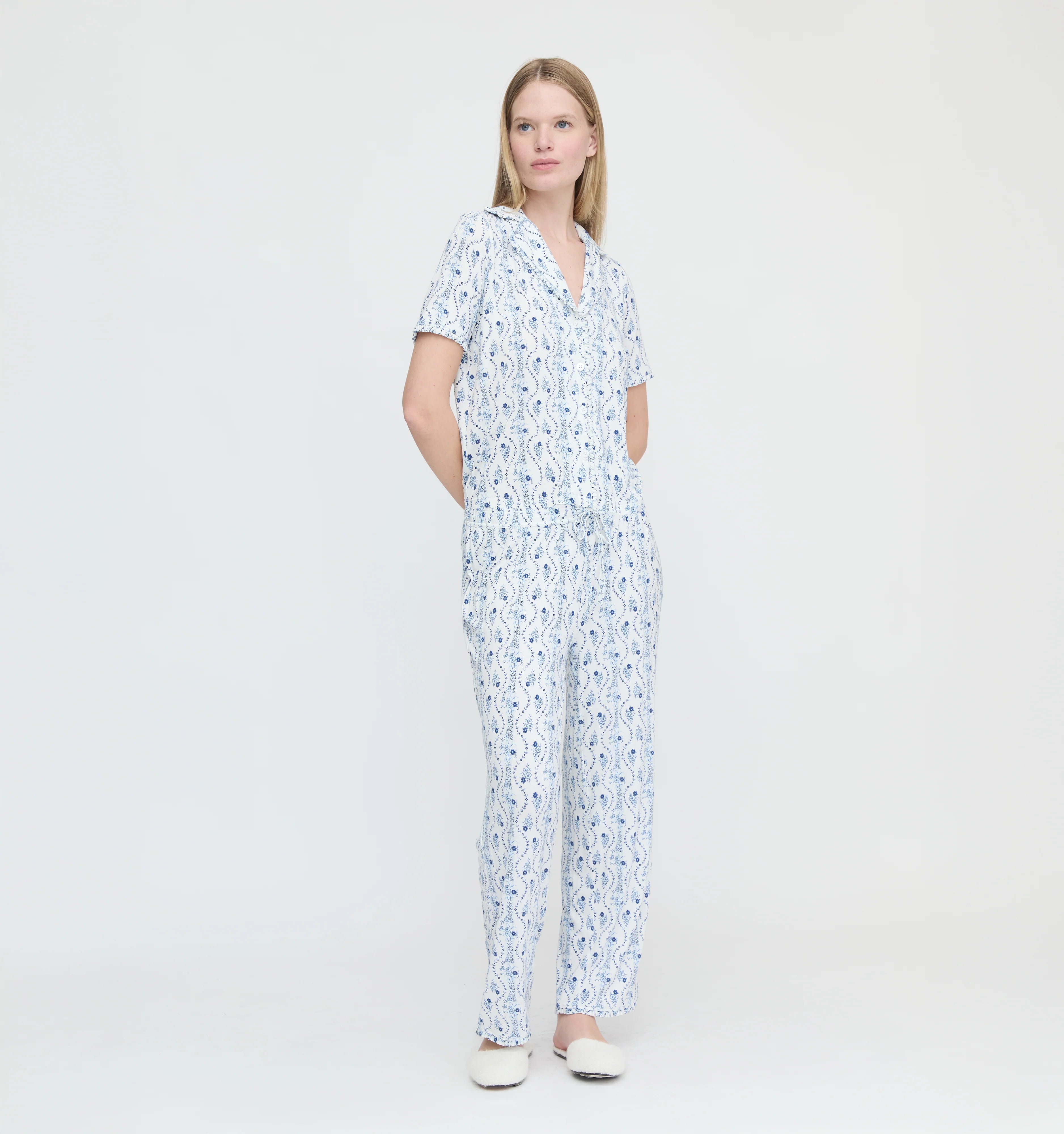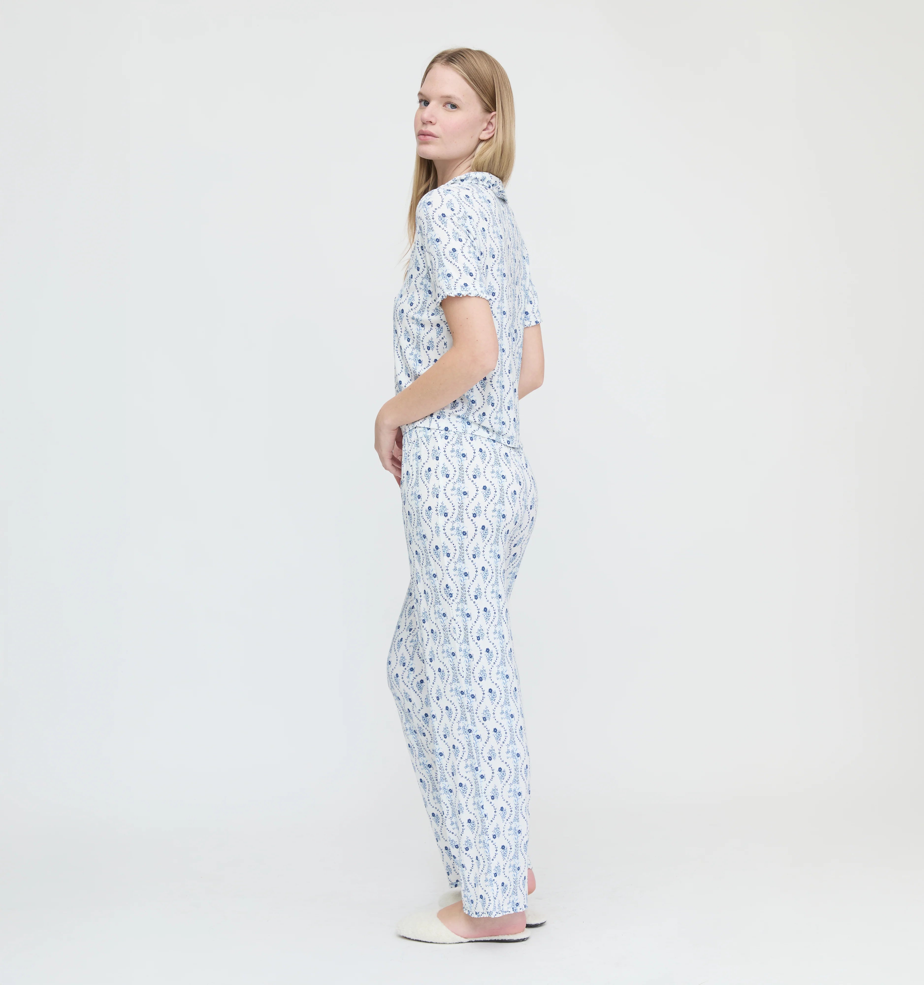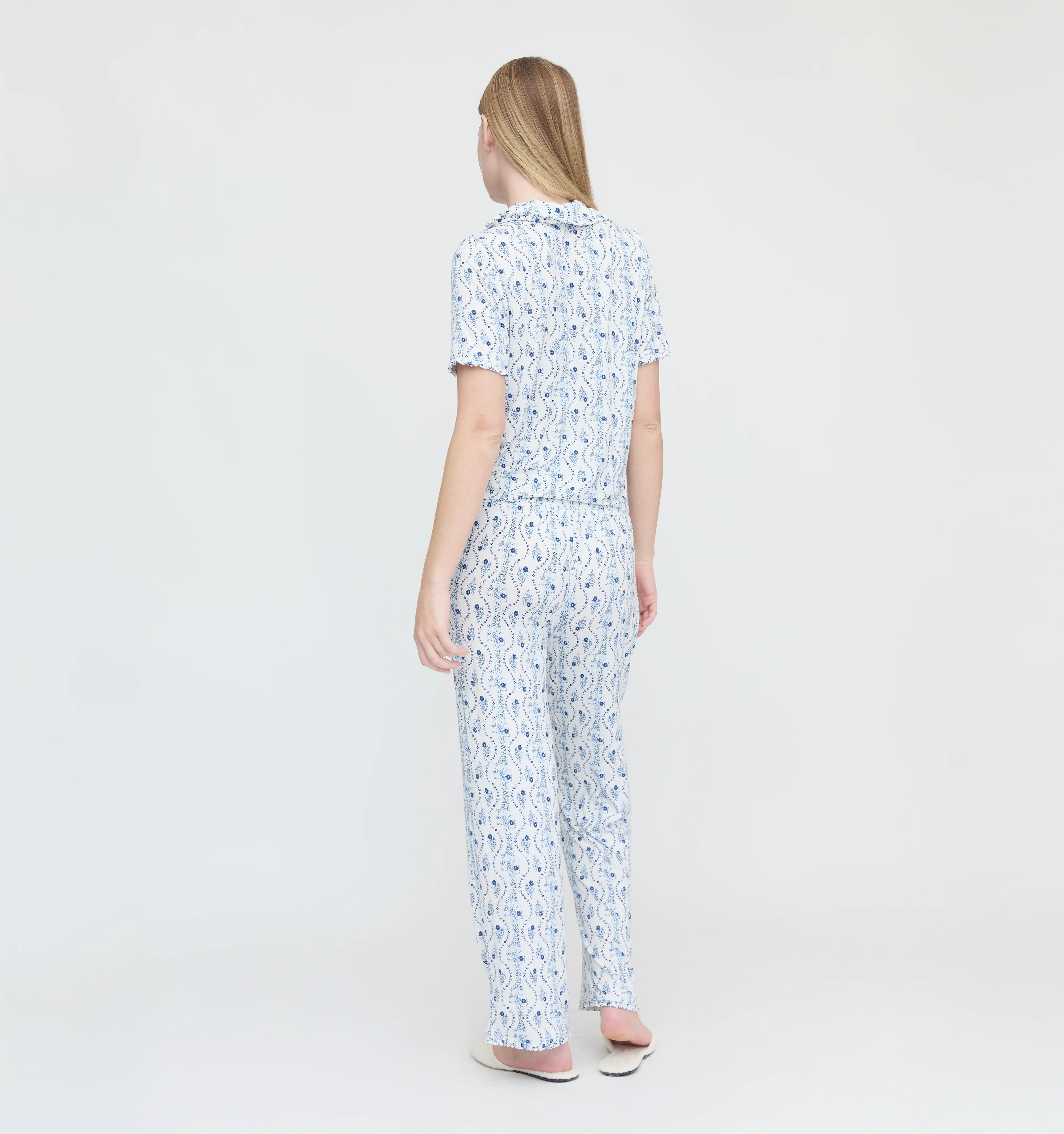 Meet the Marina Pajama Set. Marina is a super-soft jersey set featuring drawstring pants and a short sleeve button down with a ruffle edge.