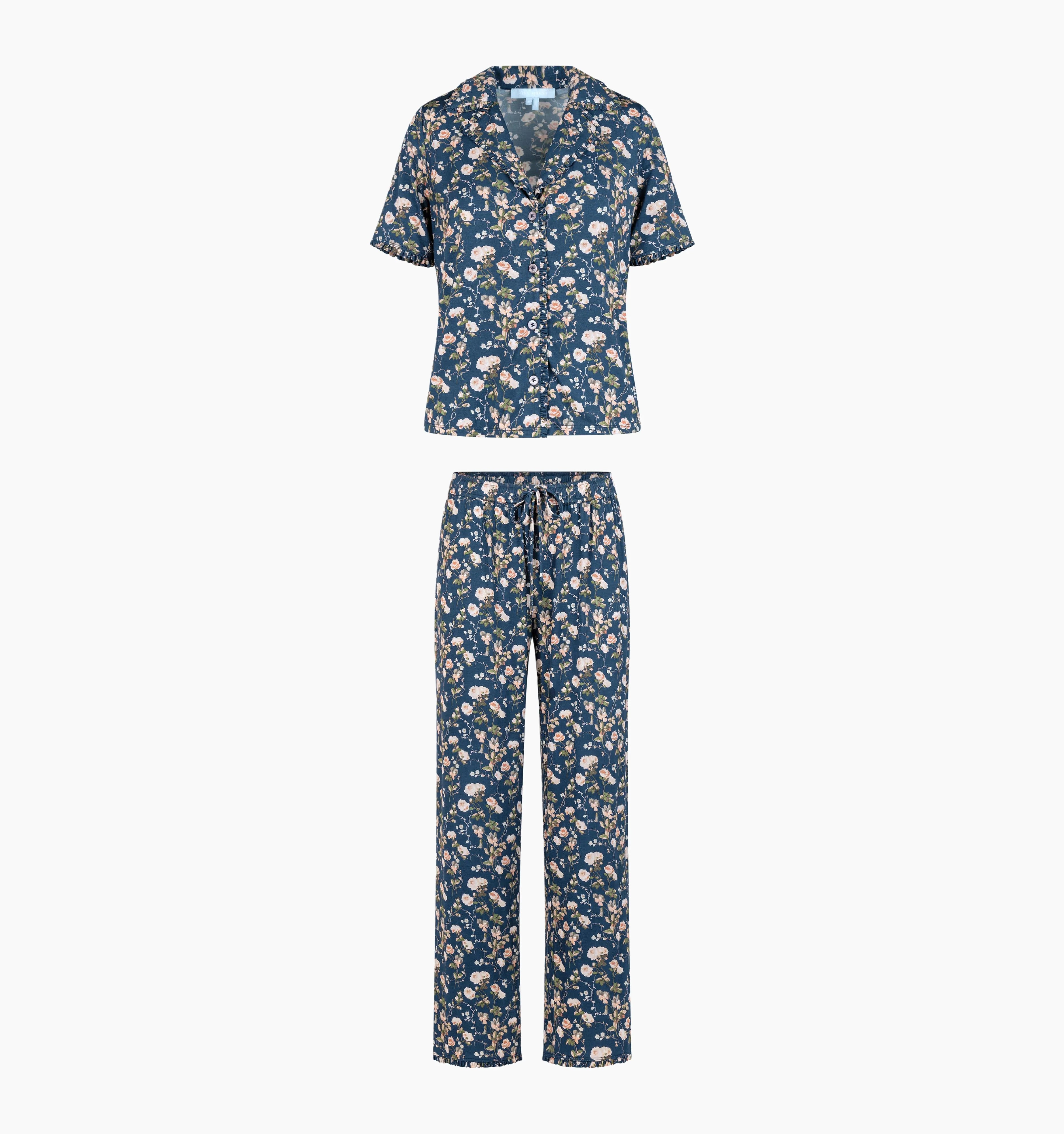 Meet the Marina Pajama Set. Marina is a super-soft jersey set featuring drawstring pants and a short sleeve button down with a ruffle edge.