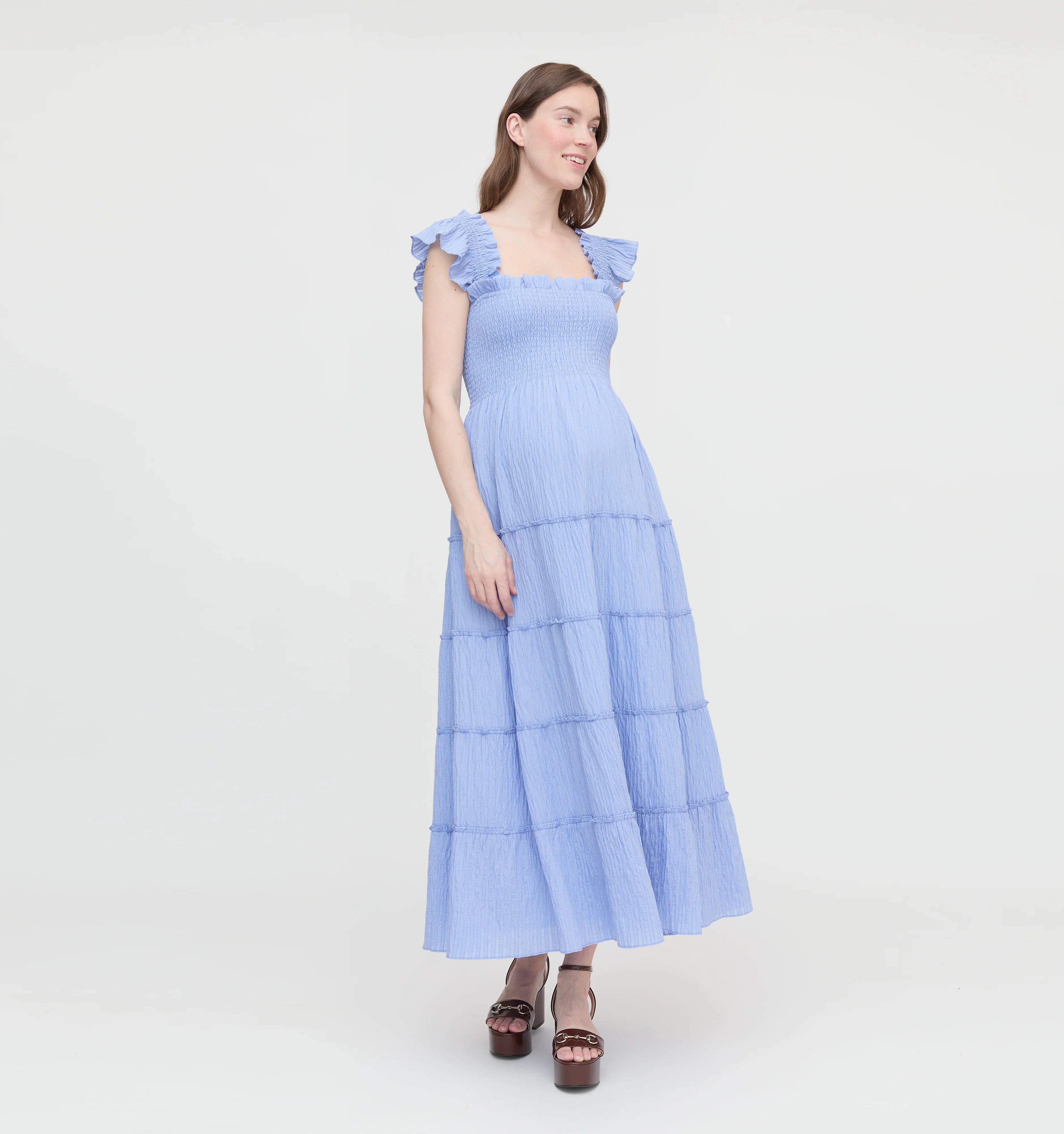 The Ellie is an A-line Nap Dress® with our proprietary, elasticated Nap Smocking, ruffled shoulders, tiered midi skirt, and pockets.