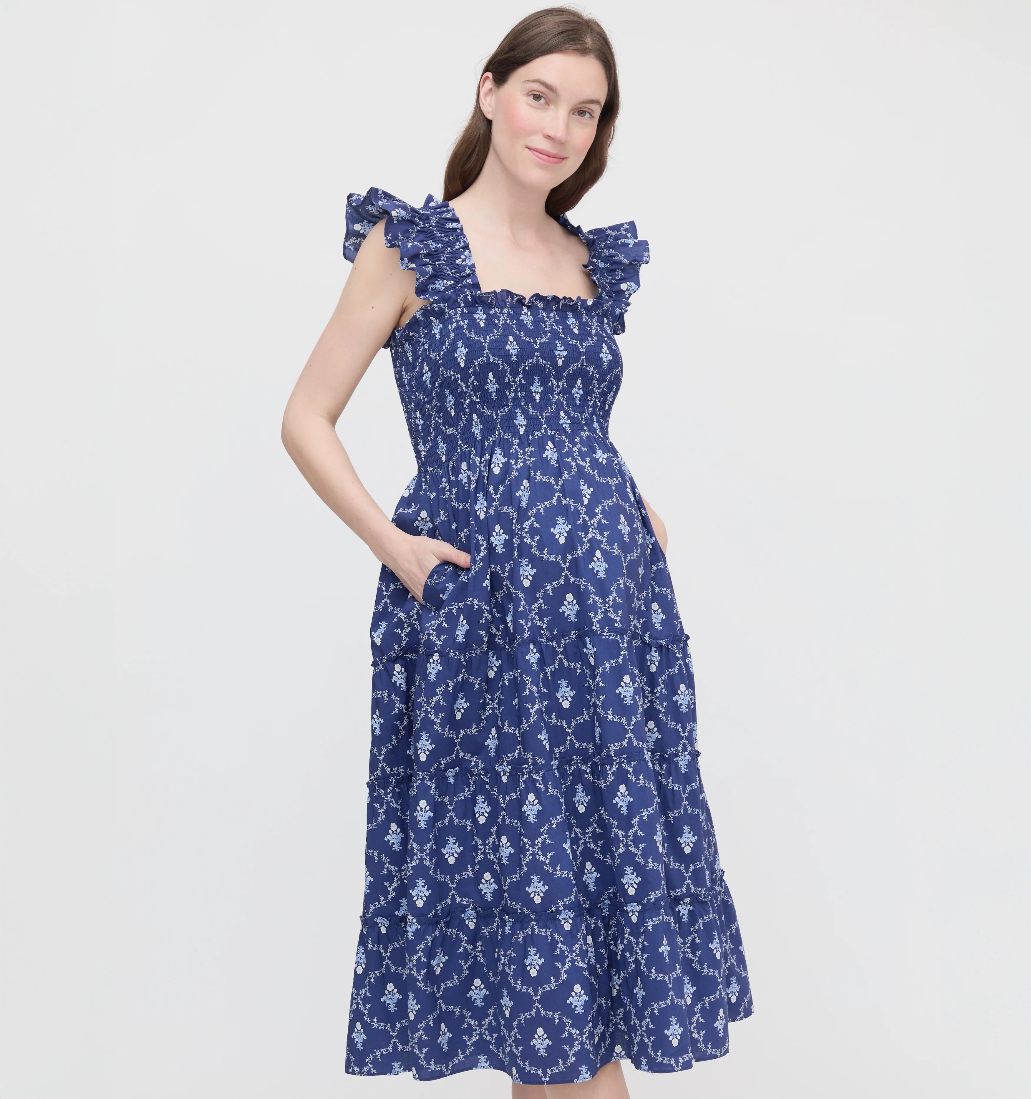 The Ellie is an A-line Nap Dress® with our proprietary, elasticated Nap Smocking, ruffled shoulders, tiered midi skirt, and pockets.