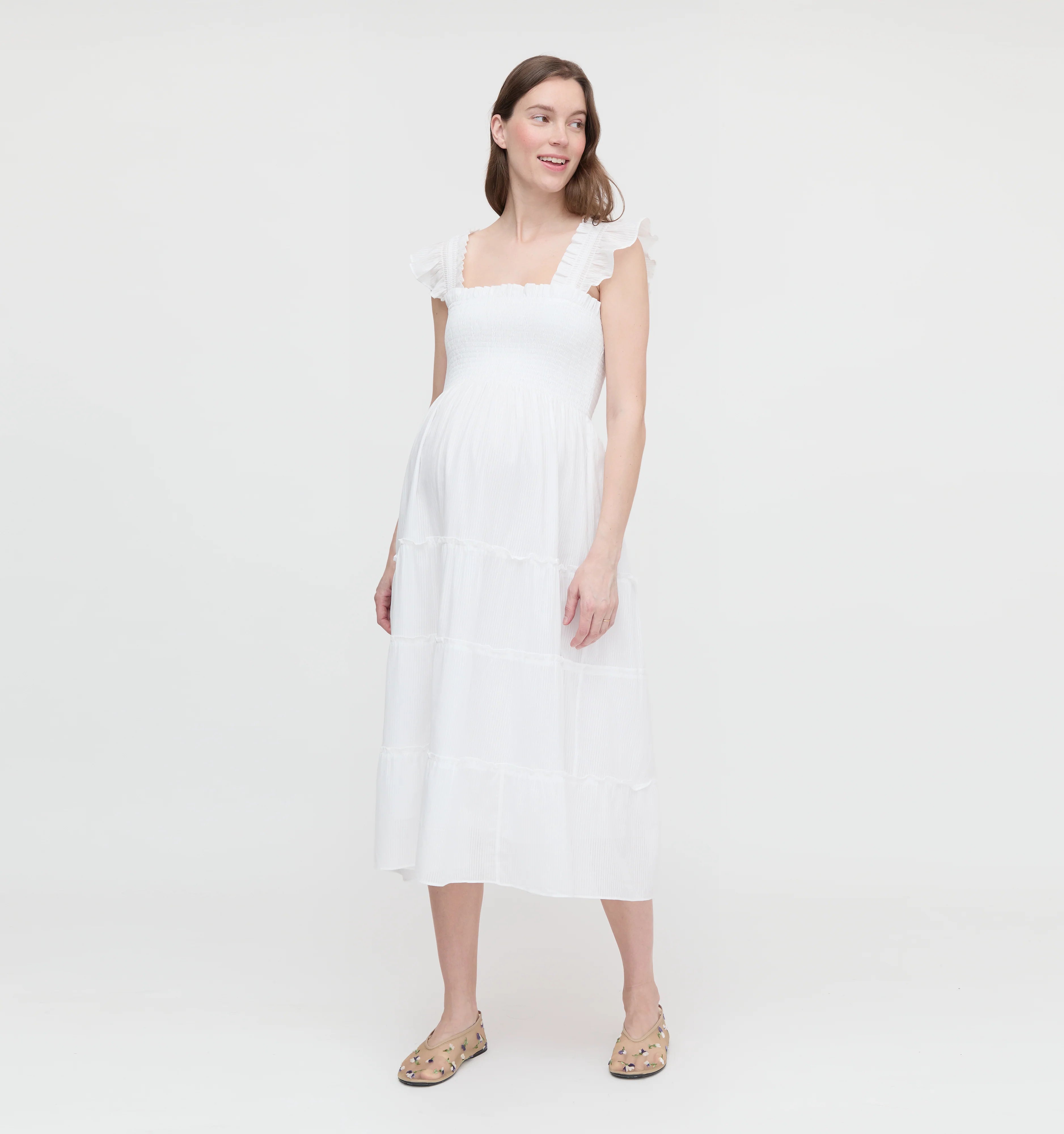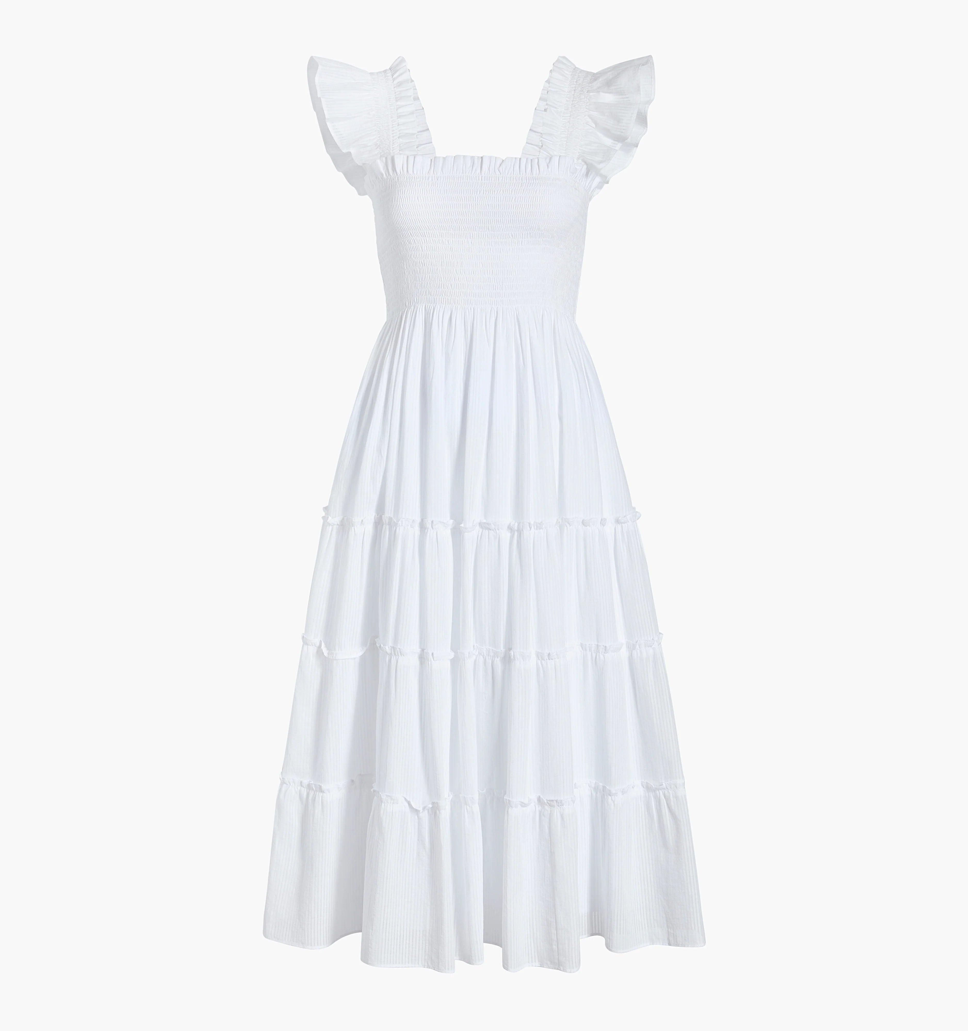 The Ellie is an A-line Nap Dress® with our proprietary, elasticated Nap Smocking, ruffled shoulders, tiered midi skirt, and pockets.