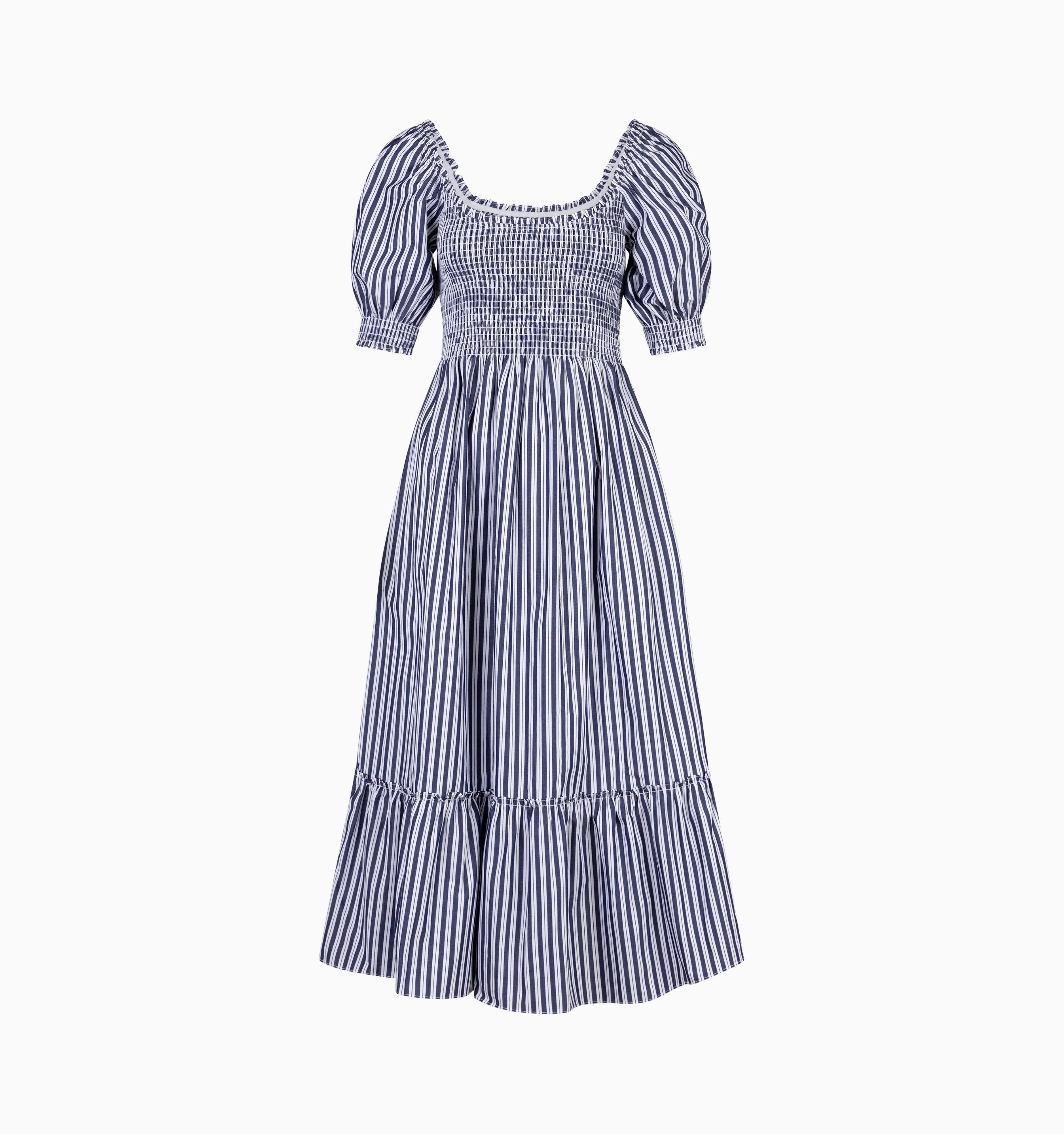 Meet the Louisa Nap Dress. Louisa features our proprietary, elasticated Nap Smocking, a bra-friendly scooped neckline, ruffle hem midi skirt in an updated length and puff sleeves.