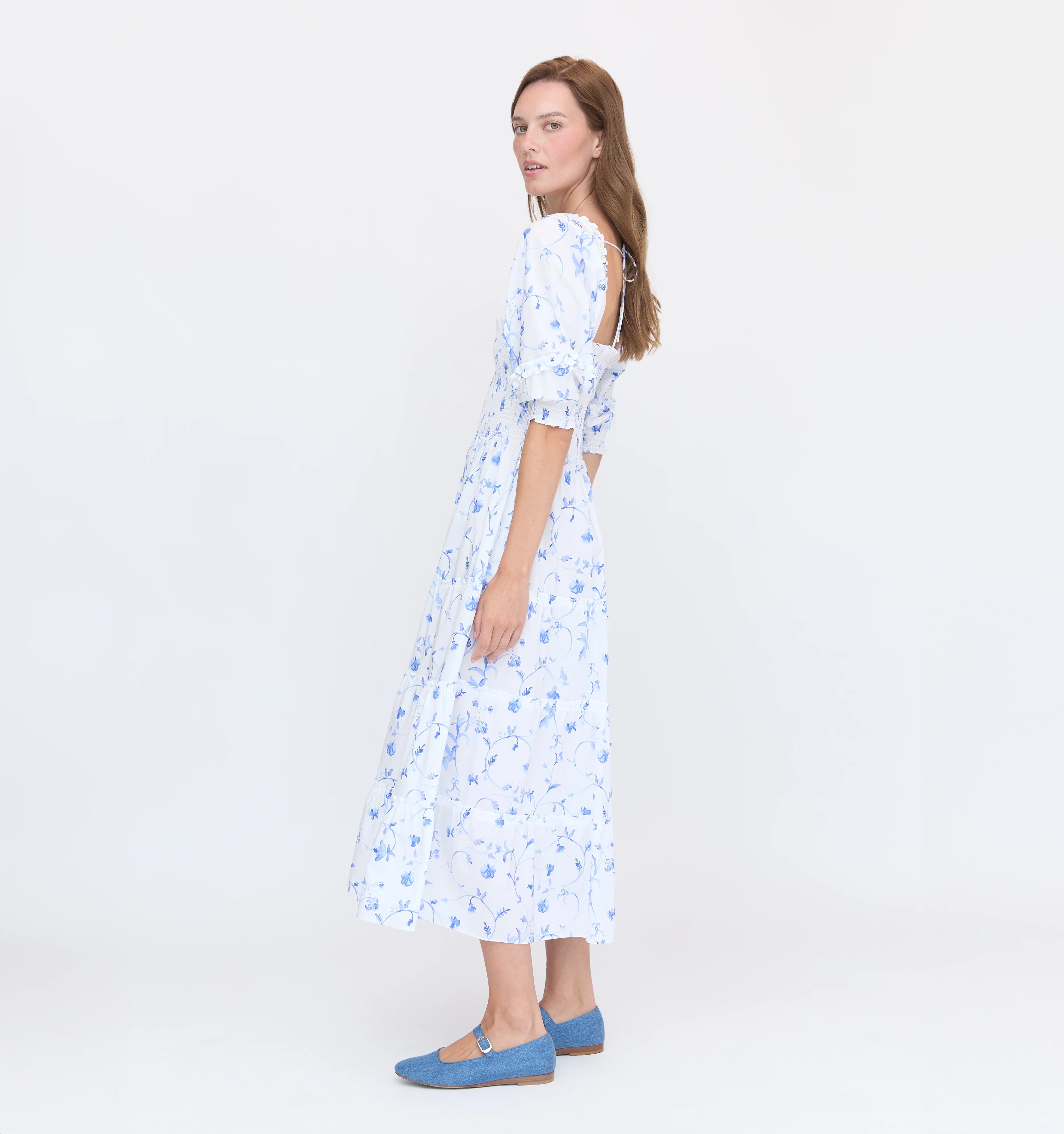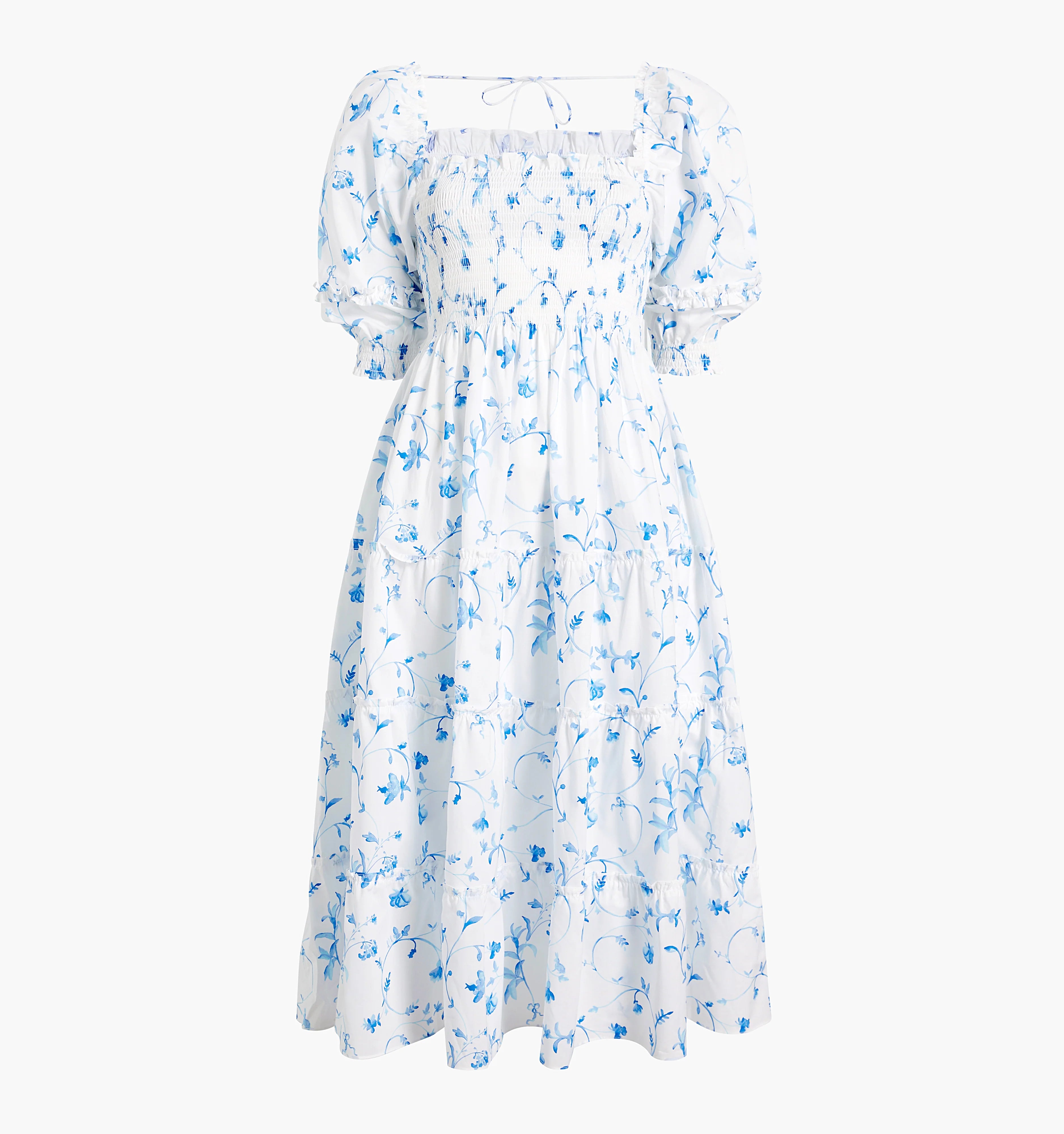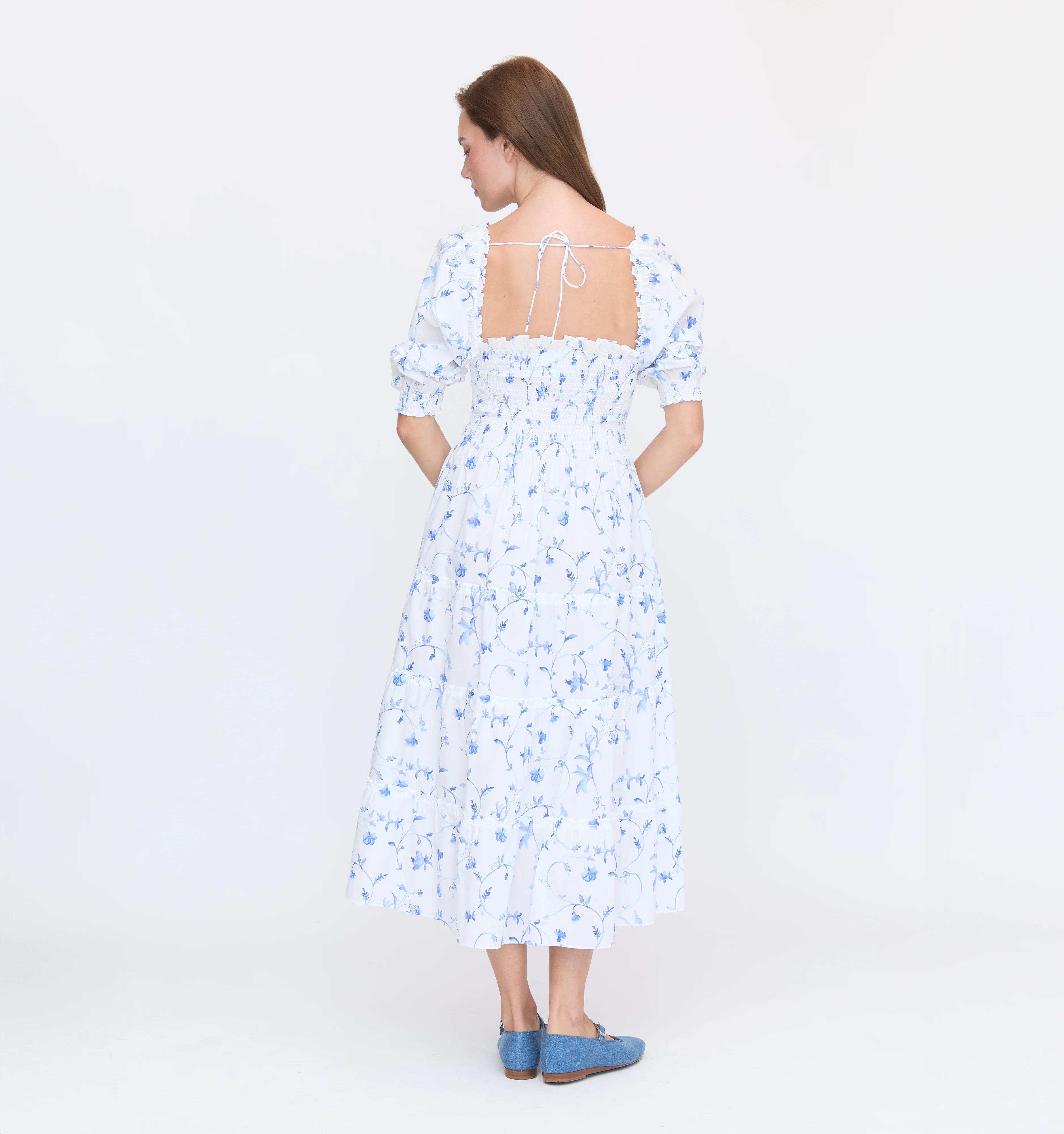 The Nesli is a Nap Dress with elasticated smocking, a tiered midi skirt, and dramatic puff sleeves. Fits both naps and busy schedules perfectly.