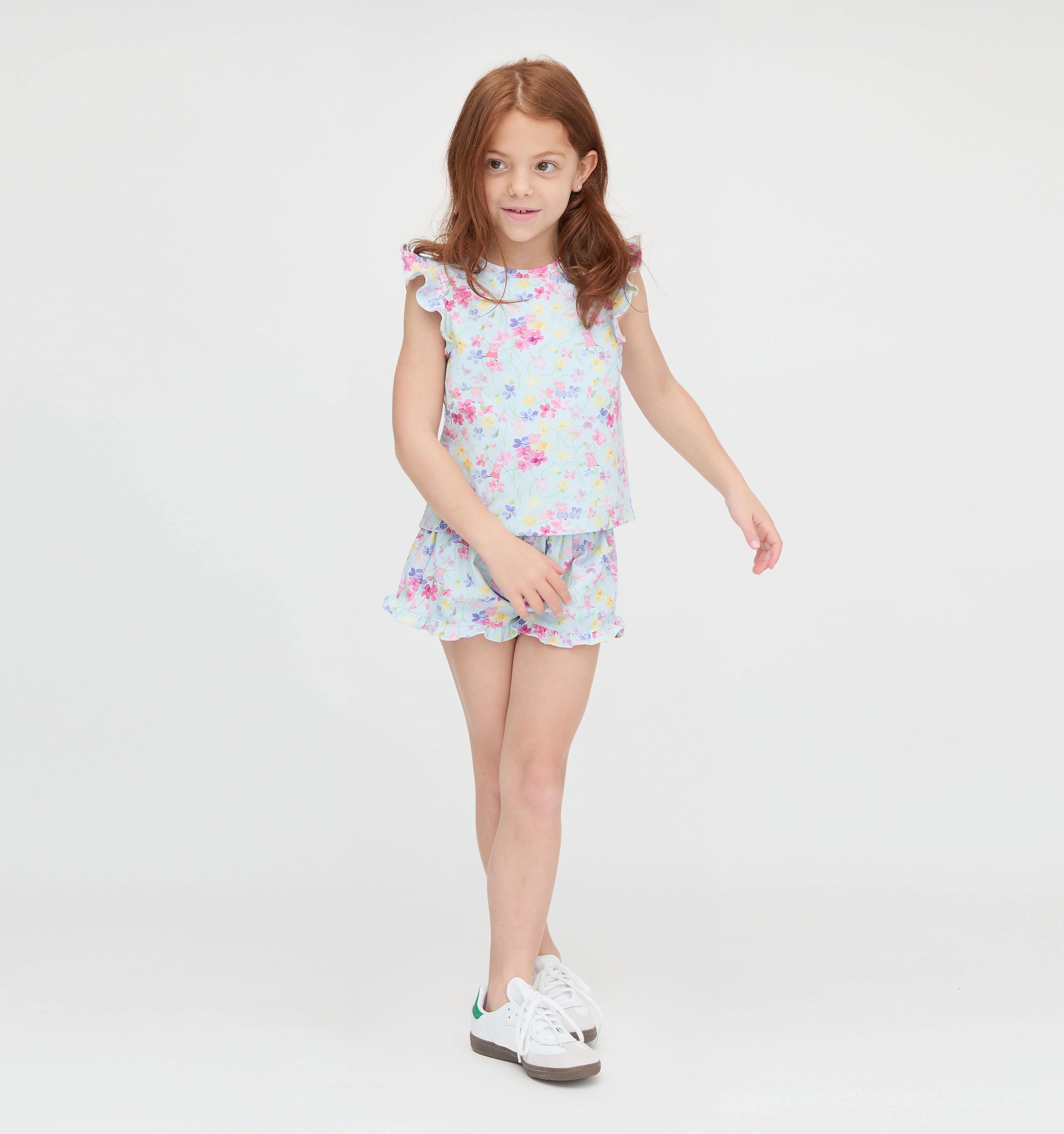 Peppa Pig© dances amongst watercolor sweet peas that capture the charm of English blooming garden vines in a delicate floral design.