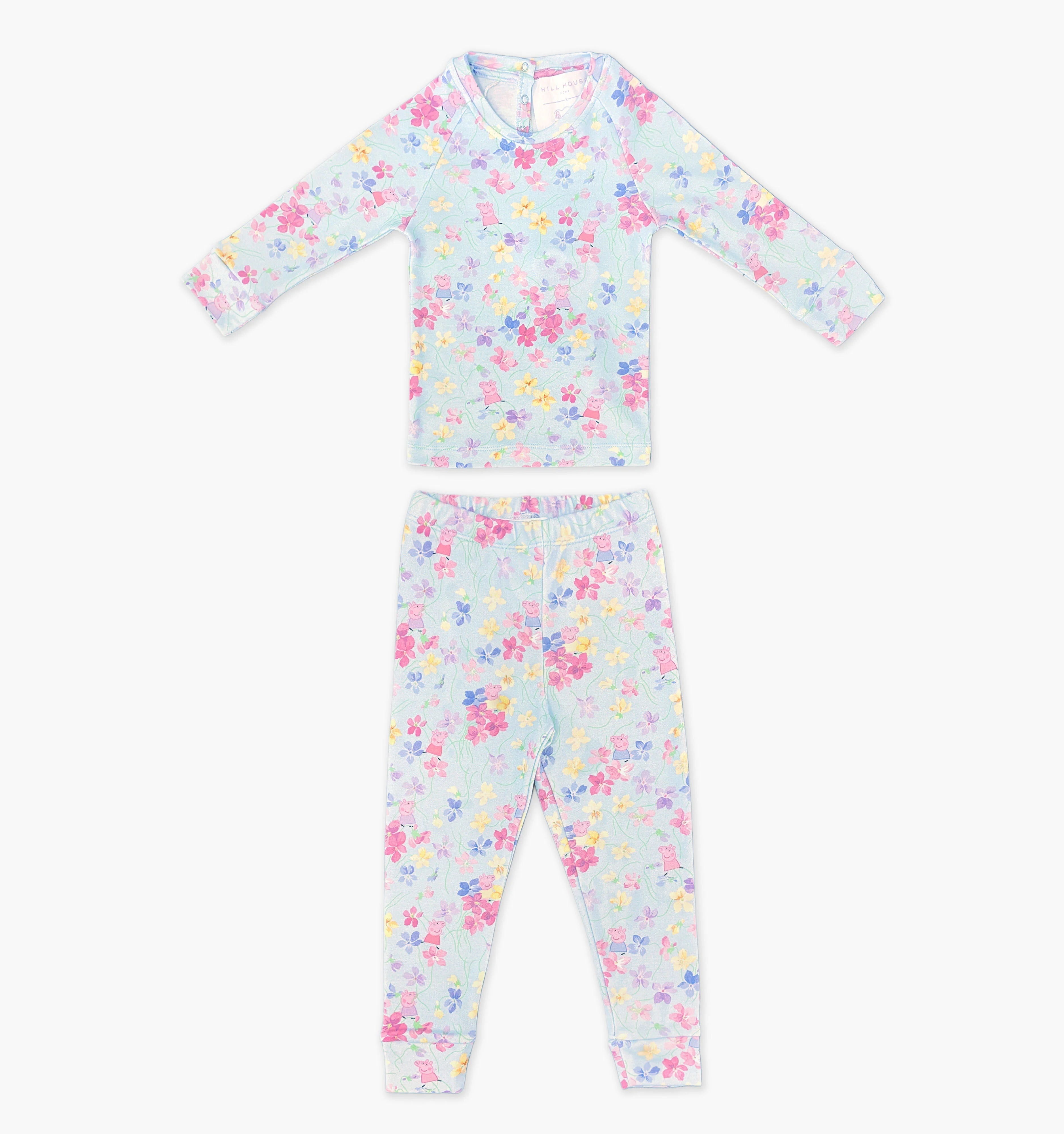 Peppa Pig© dances amongst watercolor sweet peas that capture the charm of English blooming garden vines in a delicate floral design.