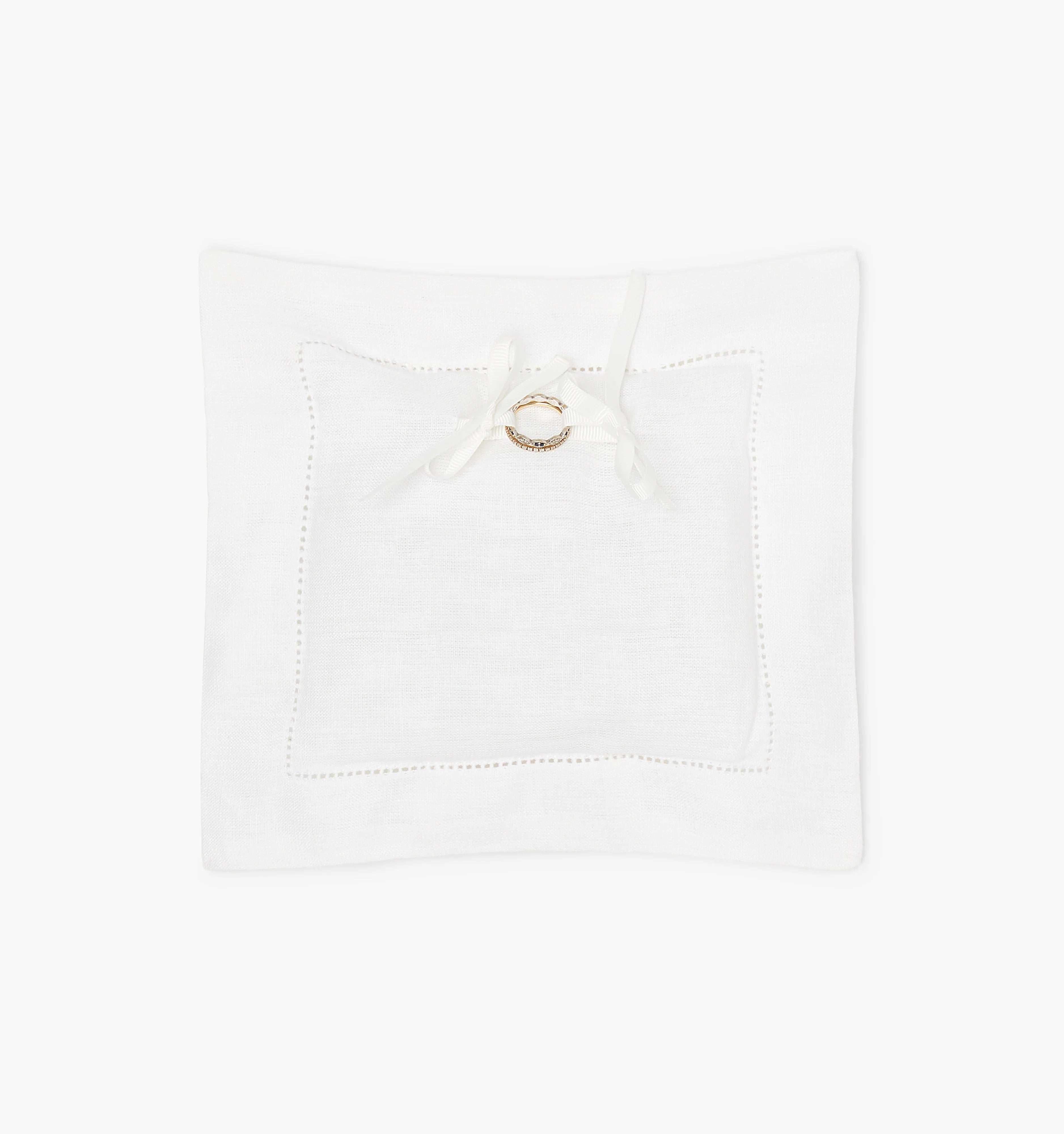 The Ring Pillow is a soft linen pillow with a classic hemstitch detail. The grosgrain ribbon can be tied to hold one or two rings.