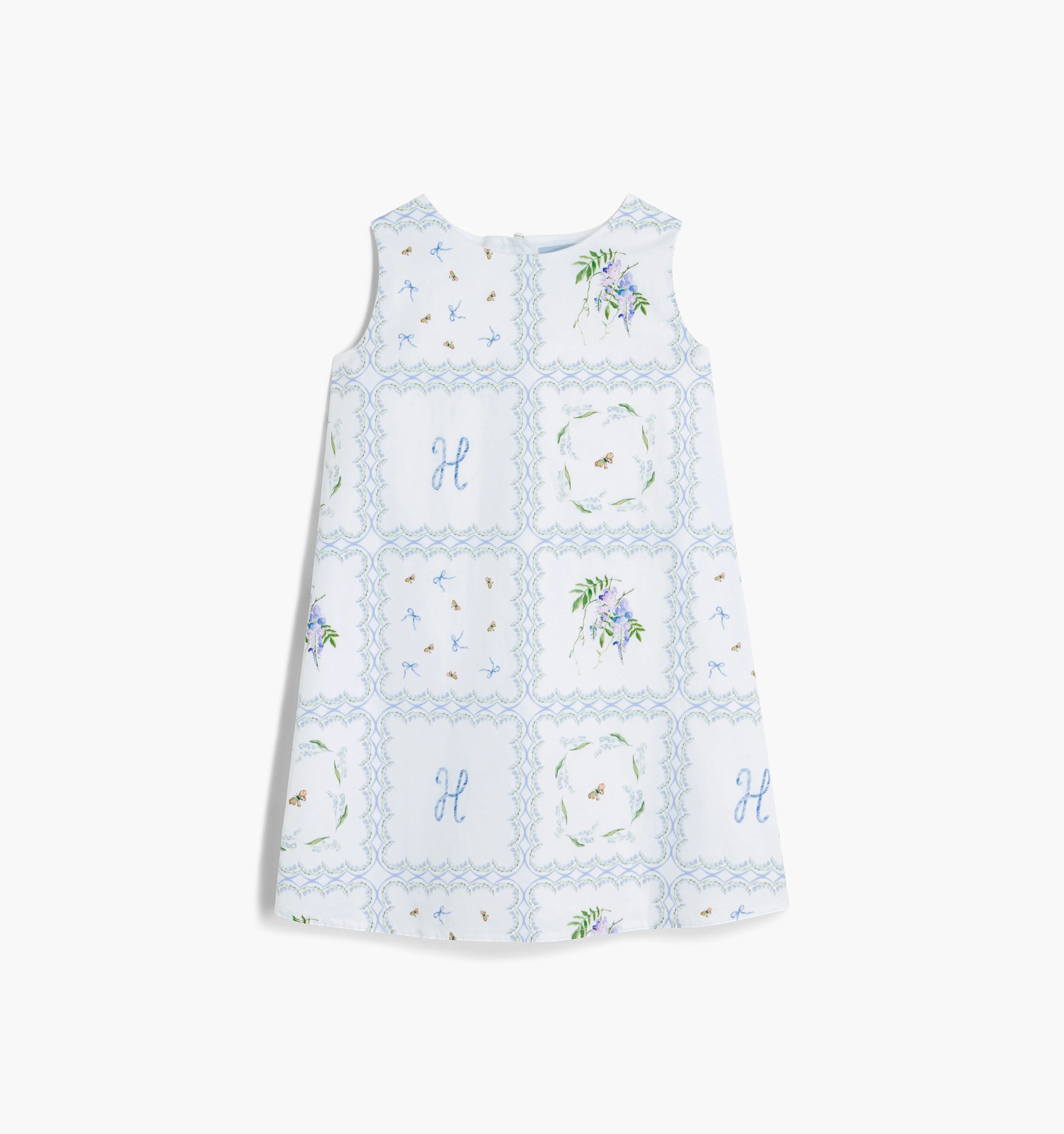 Through a vintage, embroidered linen inspired pattern, this watercolor print ties together all the playful motifs of the Summer 2024 collection - lily of the valley, bows, wisteria, butterflies, nautical inspired H’s – can you spot them all?