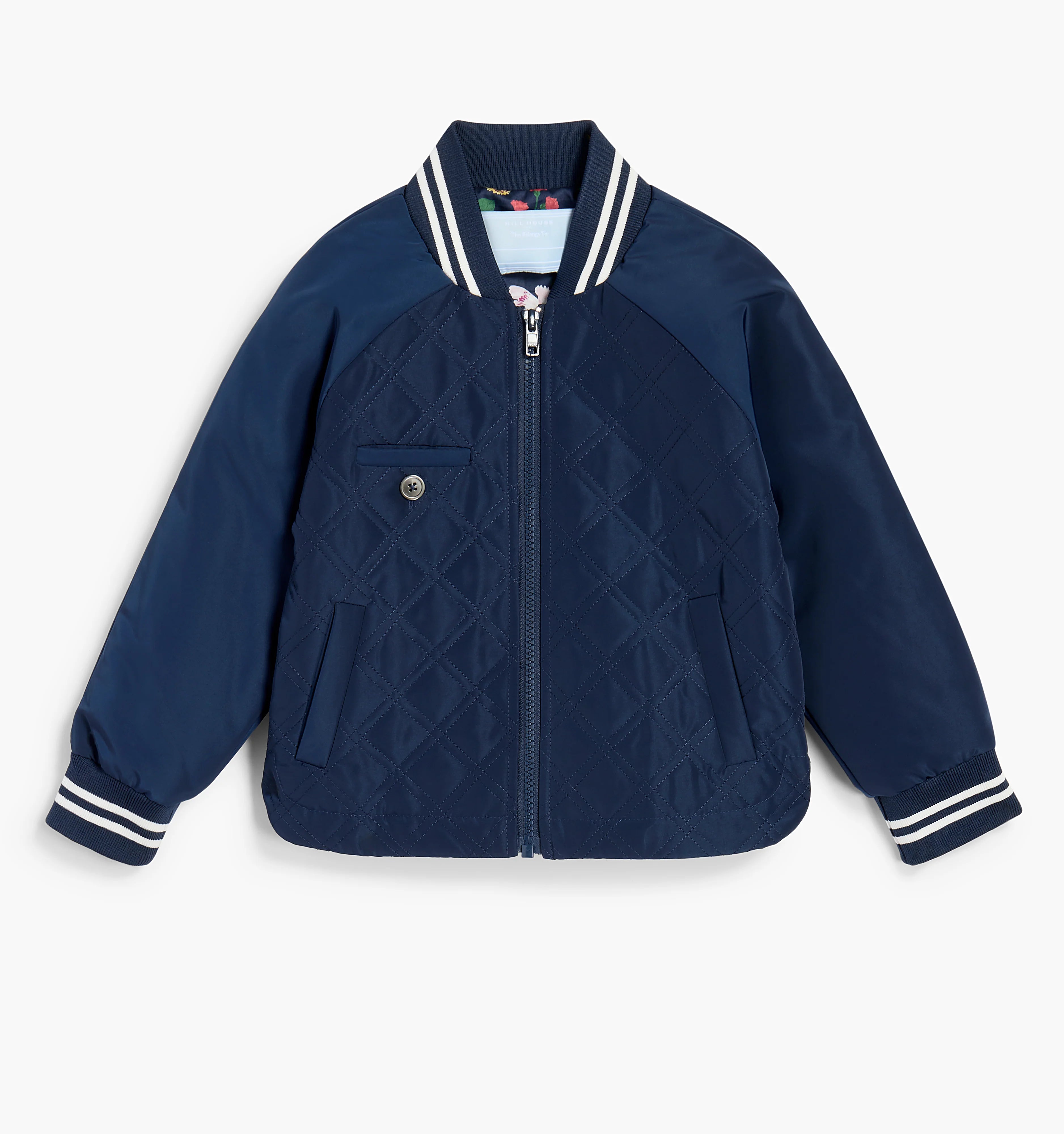Meet the Tiny Lee Jacket. Lee is a zip-front bomber jacket that features quilted detailing throughout, just like our Blake Jacket. The interior is lined with our Navy Peony Bouquet print for a fun floral moment.