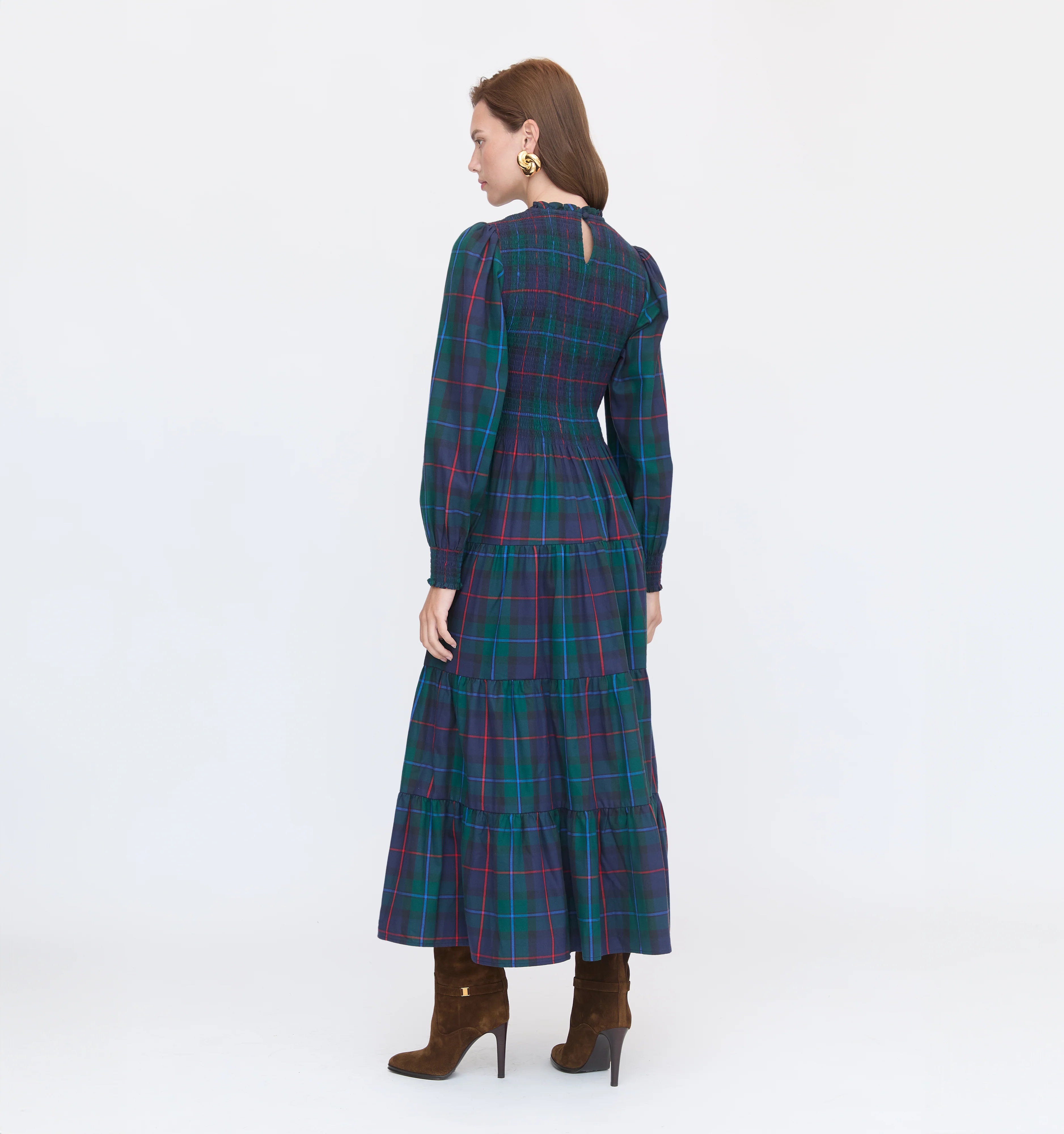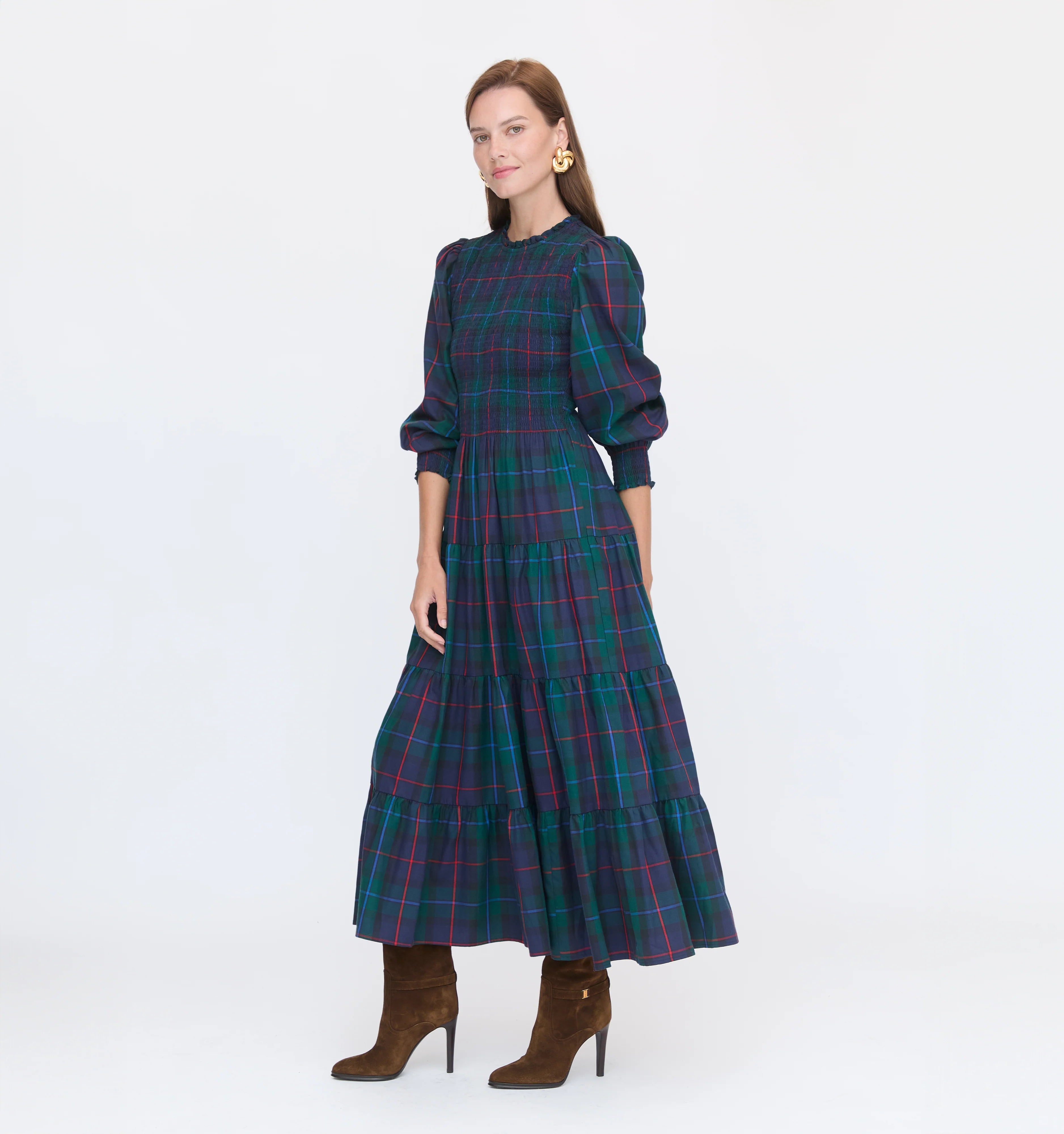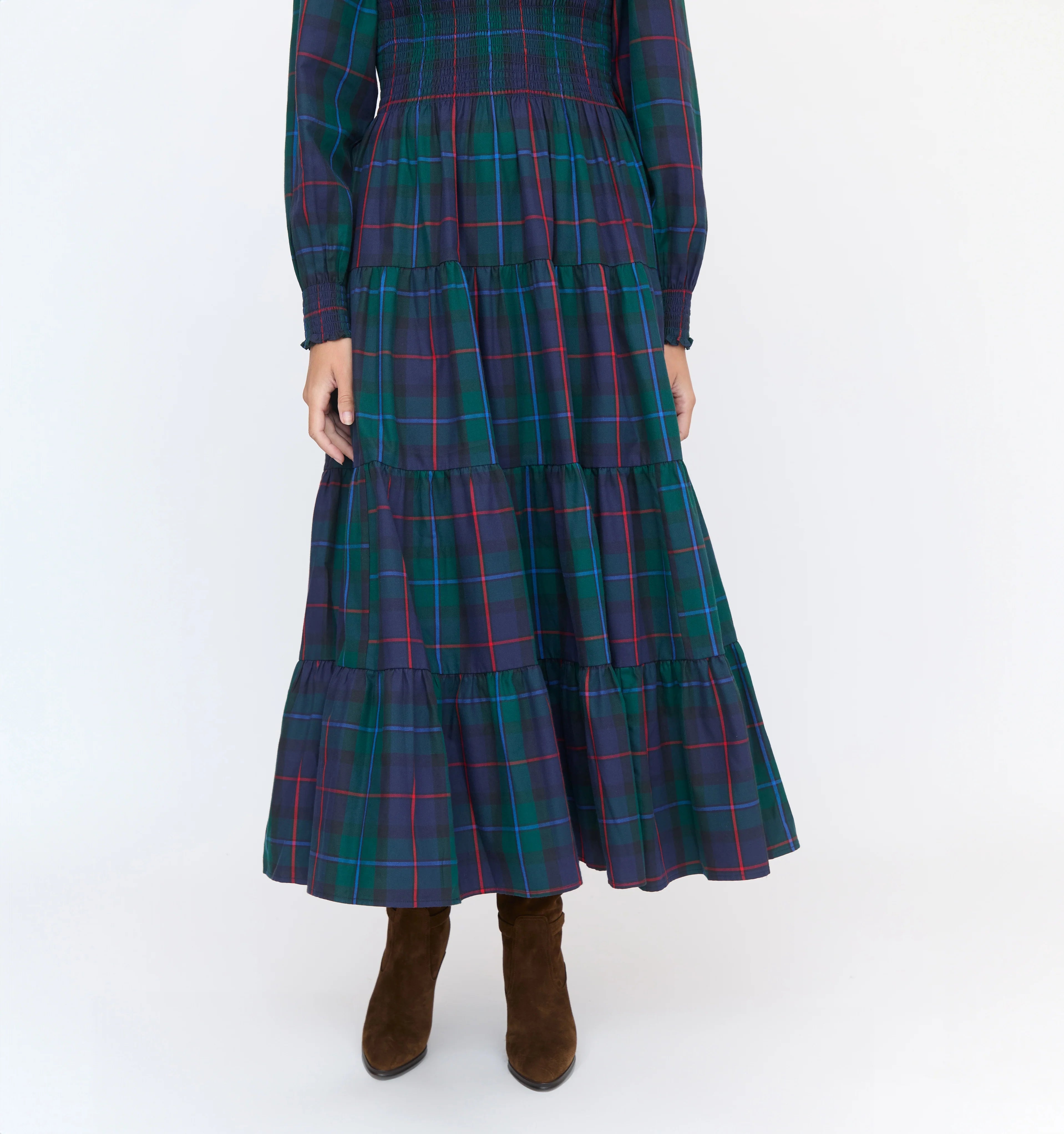 Meet the Viviana Nap Dress. Viviana features the best of a winter dress. Long sleeves, a flattering waist moment thanks to our elasticated, proprietary Nap Smocking, tiered midi skirt and a bra-friendly high neck. Dress it up with layered necklaces and a heeled boot or throw it on for your day-to-day with a favorite flat.