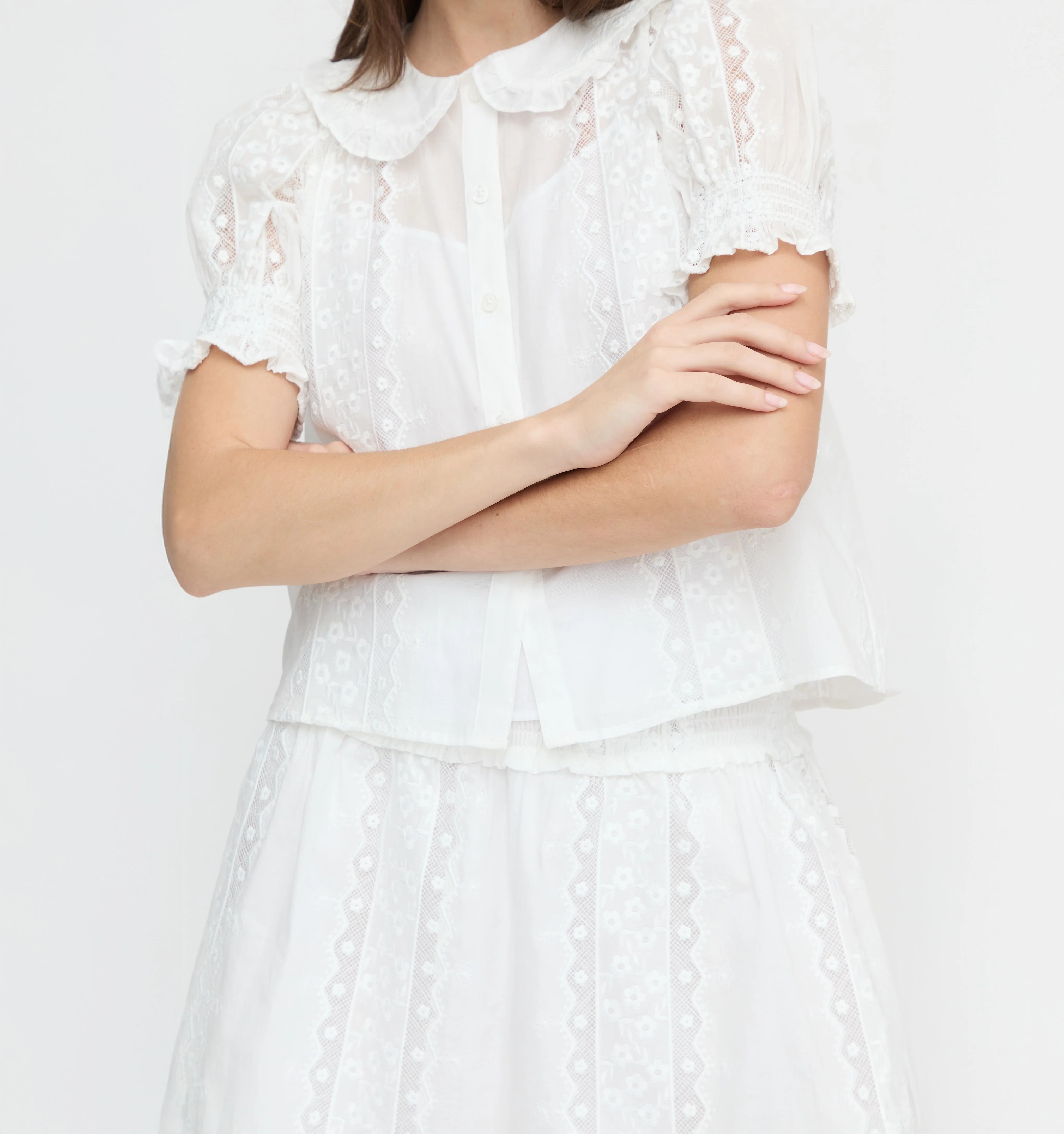 Meet the Adelaide Top. Adelaide features a classic peter pan collar and puff sleeves trimmed with a subtle ruffle for a feminine touch. Fully lined, Adelaide includes a removable white tank.