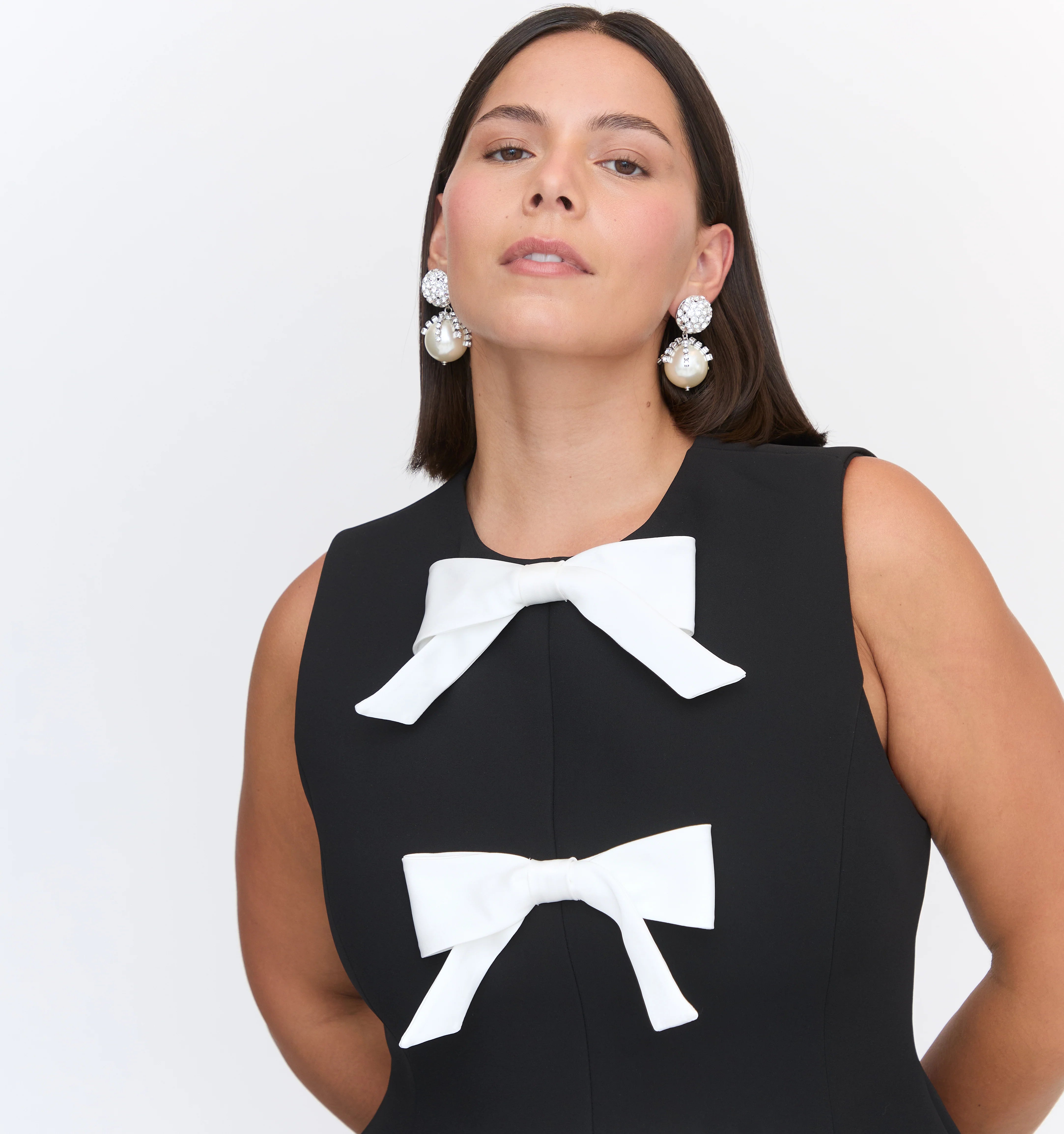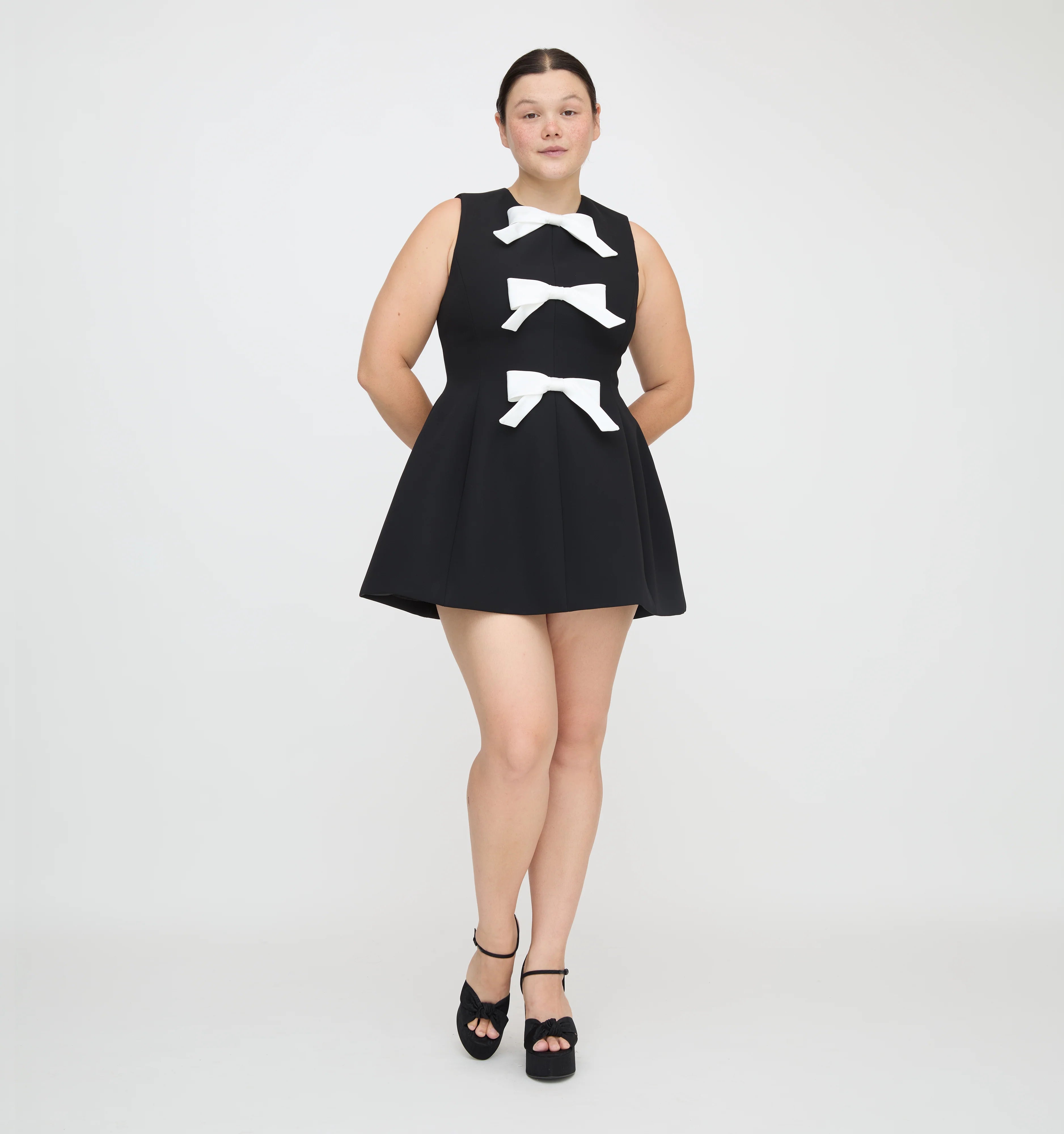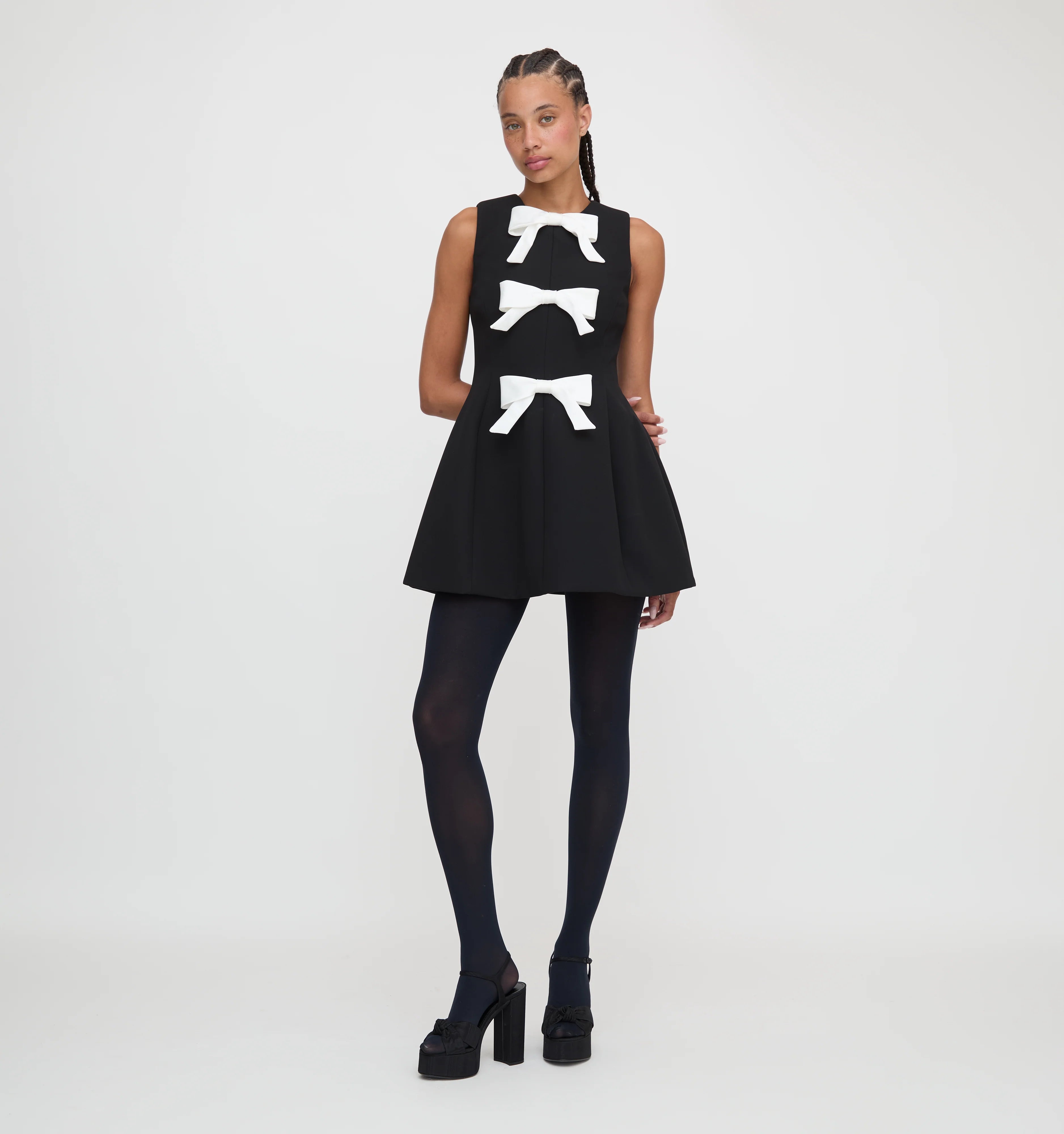 Meet the Blythe Bow Dress. Blythe is a micro mini dress with a structured bodice adorned by three silky bows. The tailored body is cinched at the waist and flares into an a-line micro mini skirt.