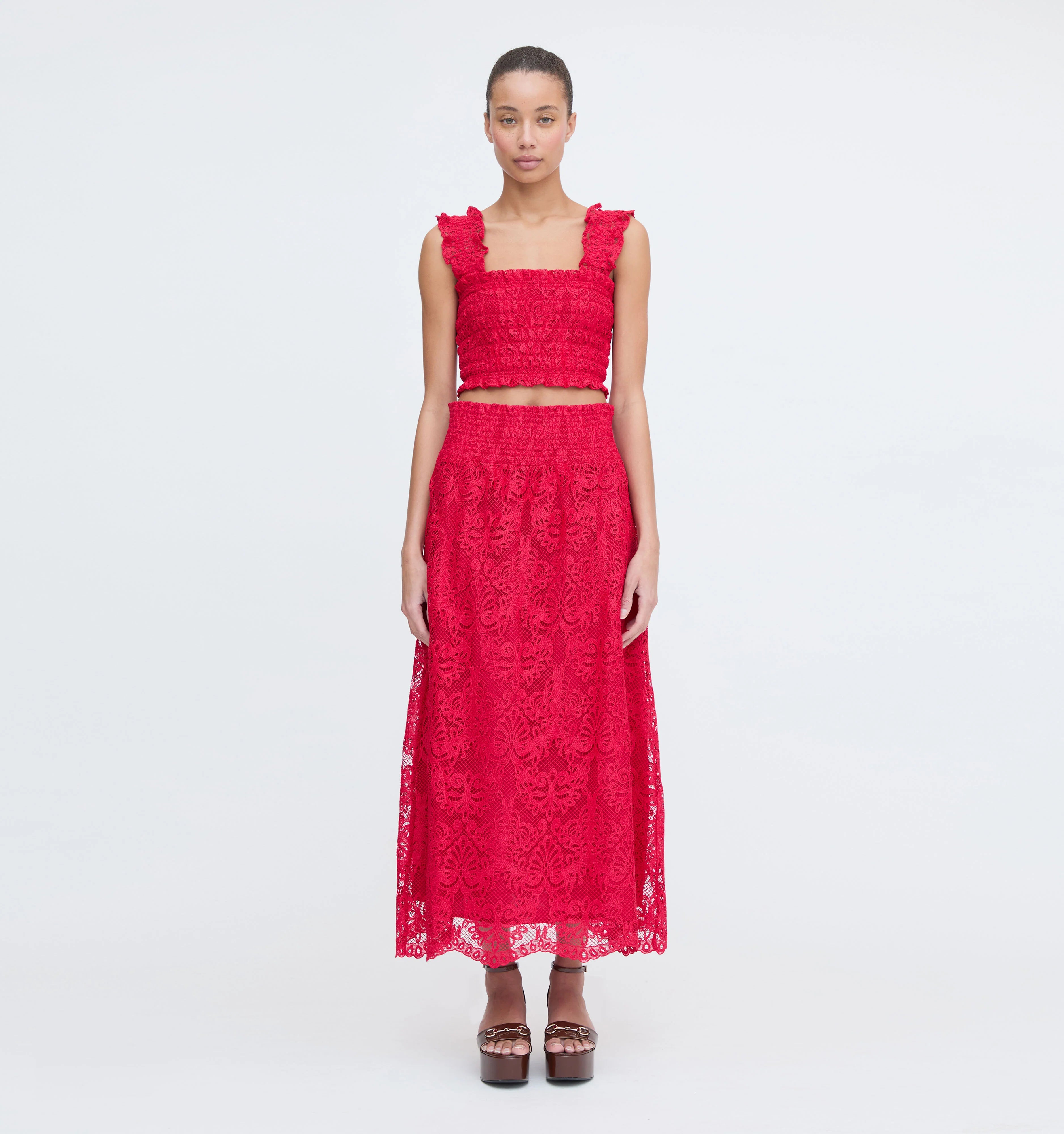 The Delphine Nap Skirt is midi length and has our smocked elasticated waistband for a flexible fit that can be worn high or low on the hips. Pair with your favorite tee or top for an easy, instantly polished look.