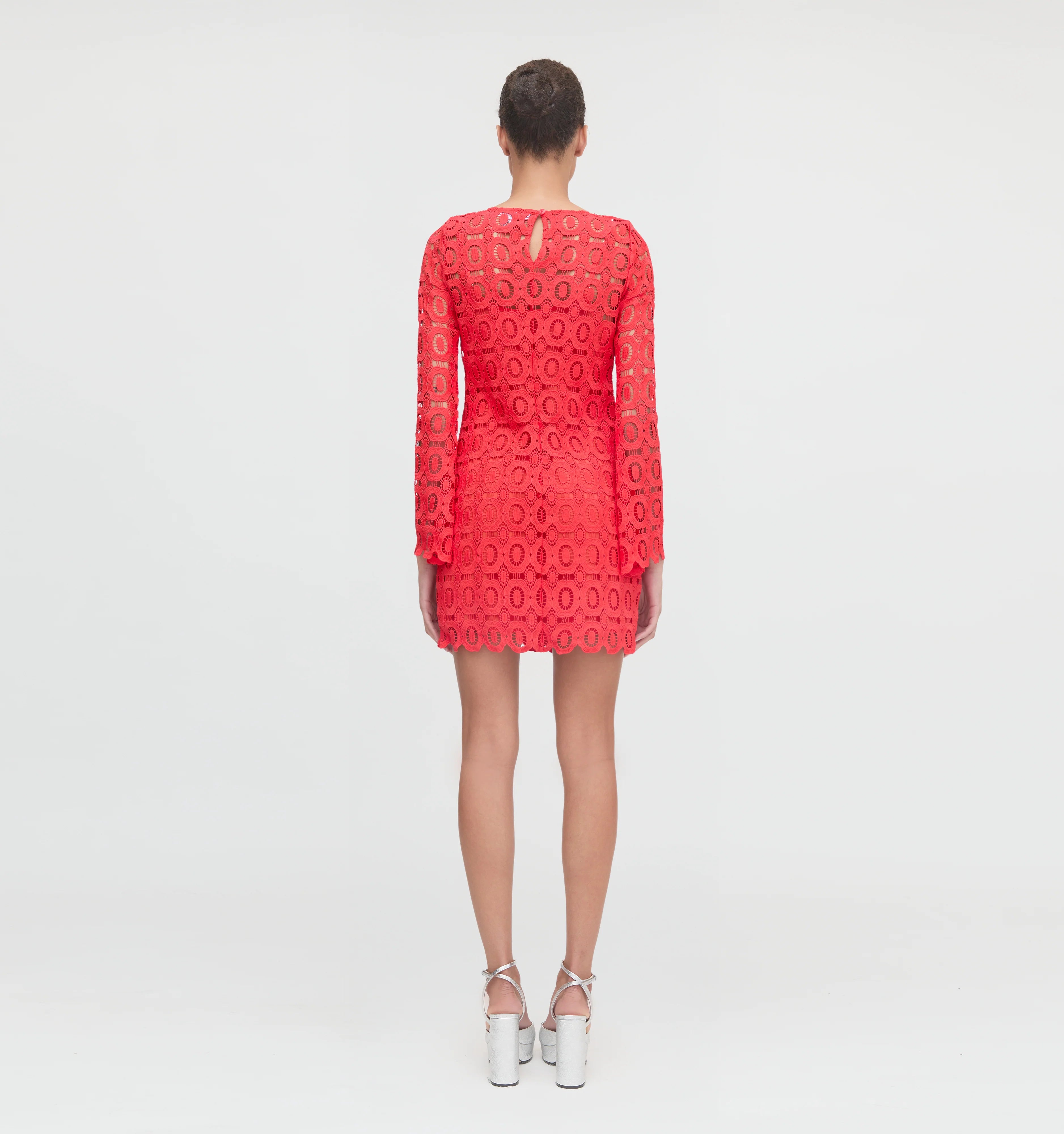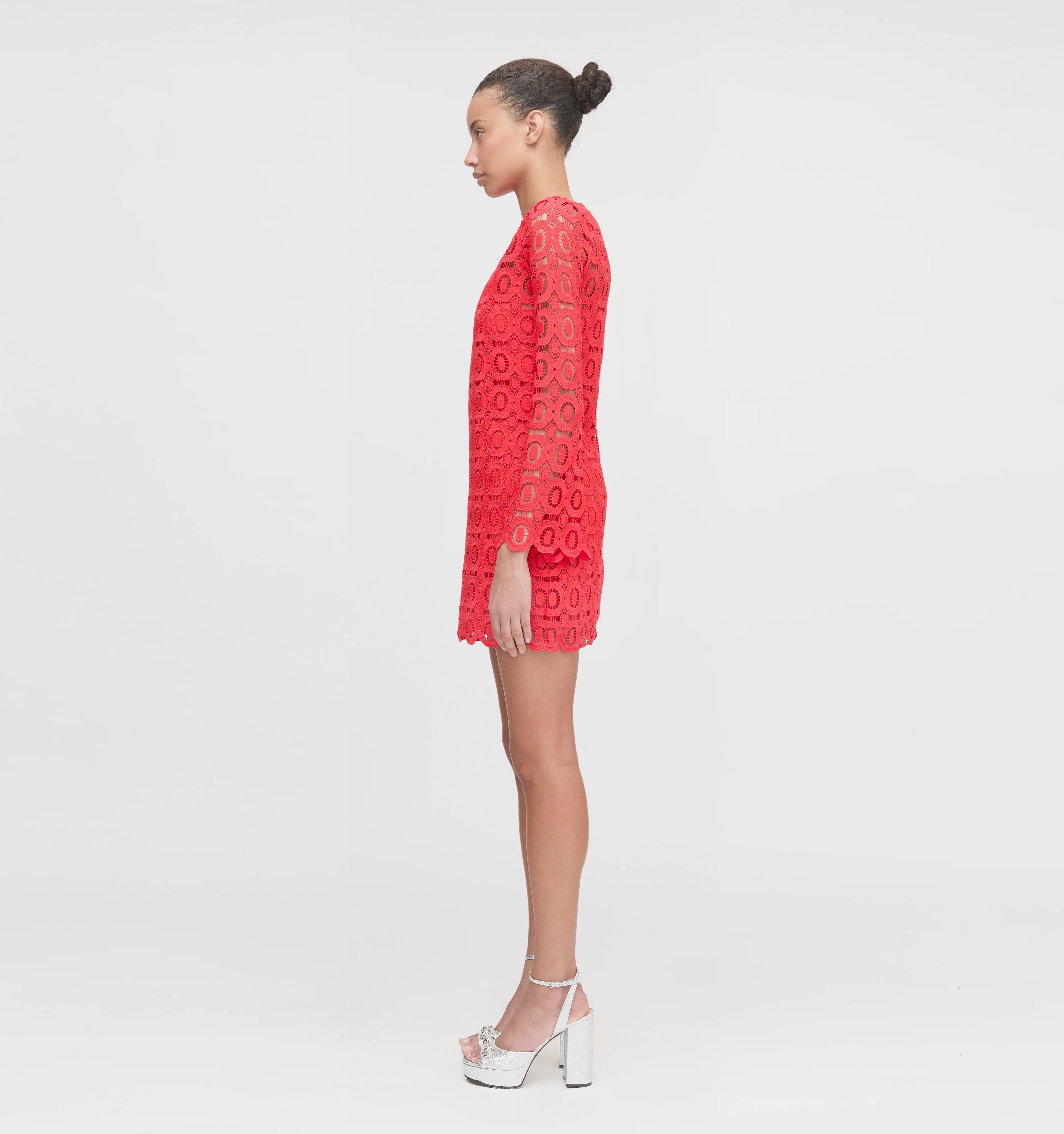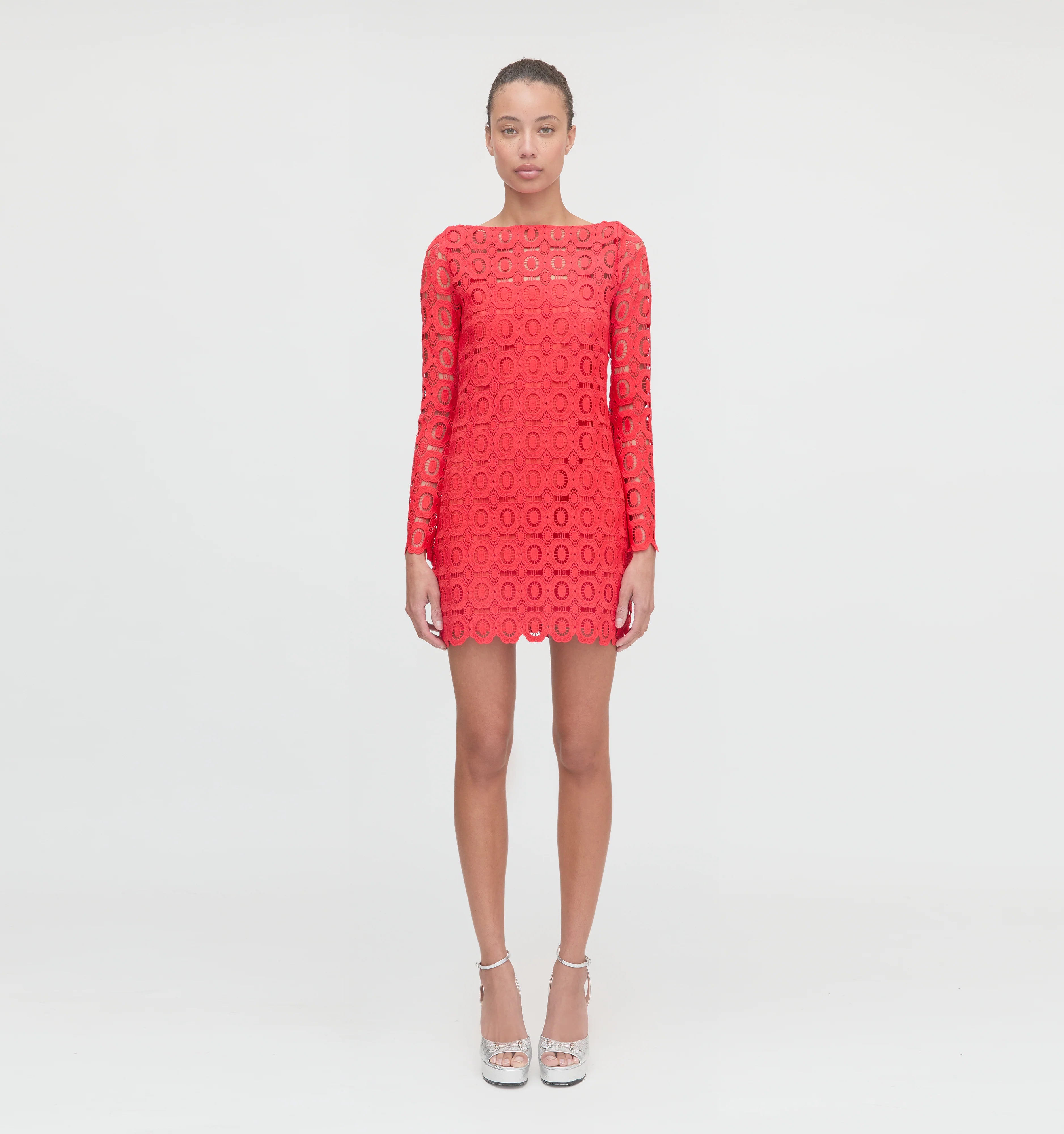 Meet the Eliza Mini Dress. A caftan-inspired silhouette, Eliza features long sleeves and a high neck. Beautiful lace fabric in poppy comes with a matching cotton slip that is removable. Style it with the slip for dinner or over a bathing suit by the pool.