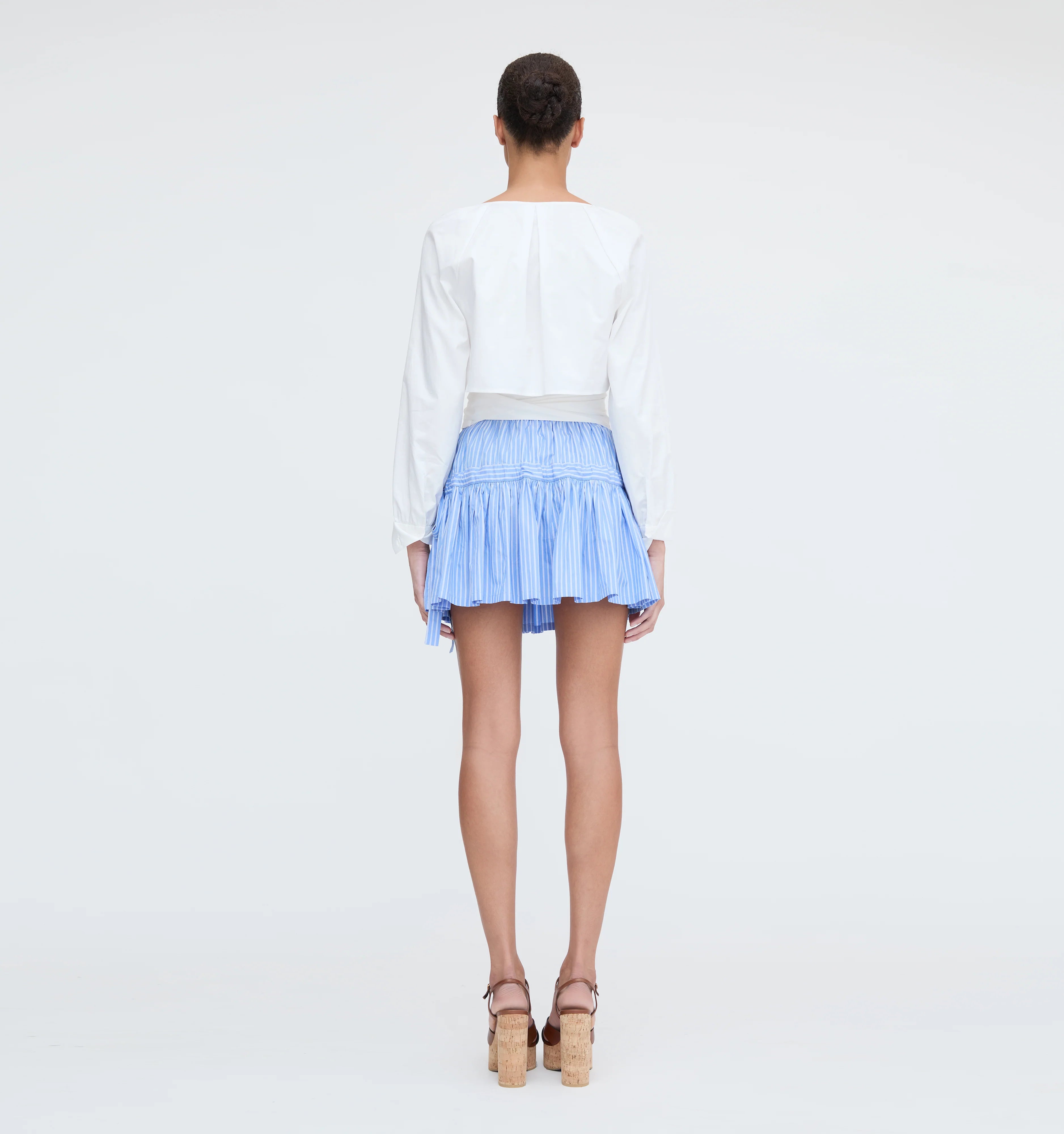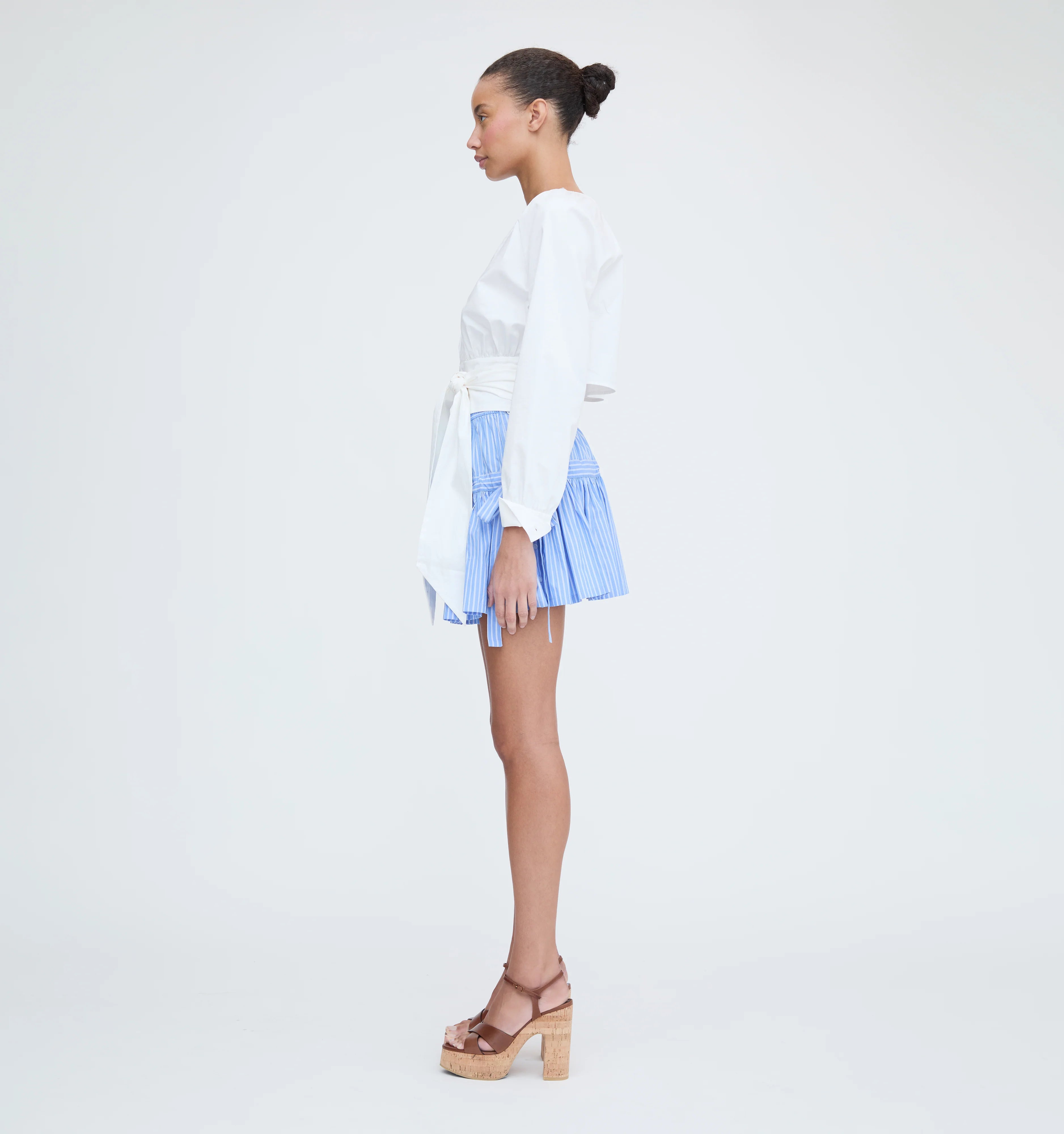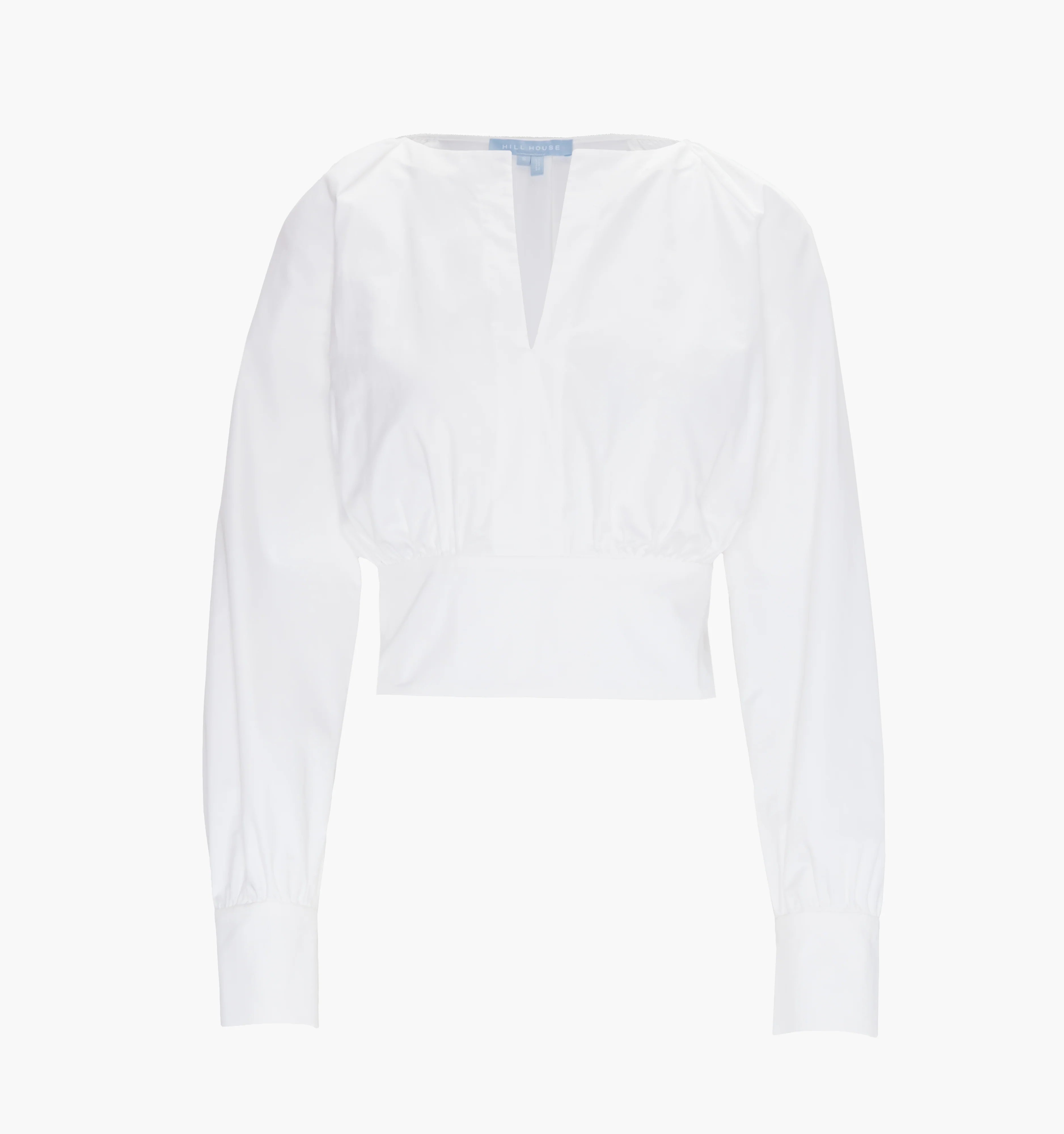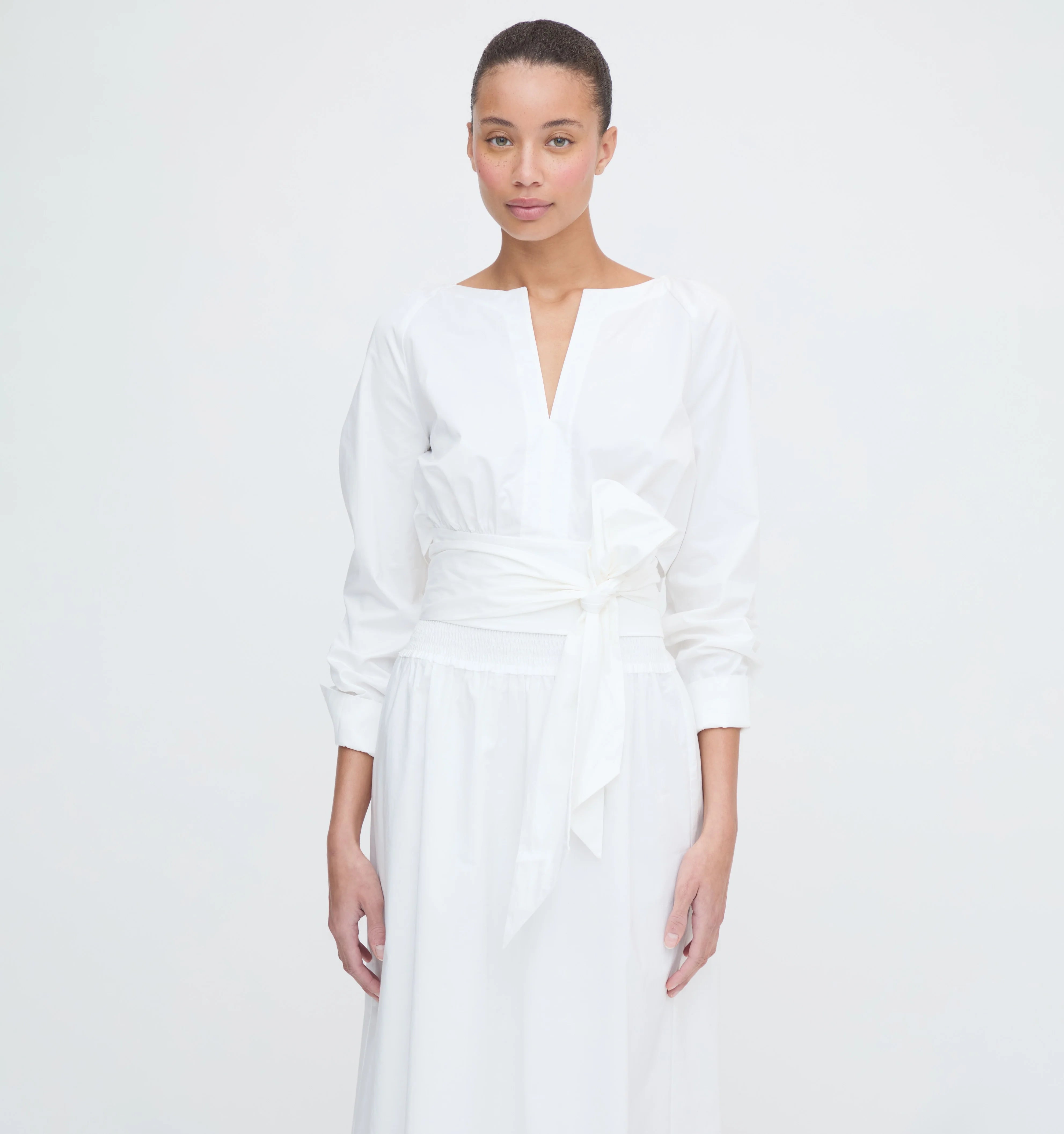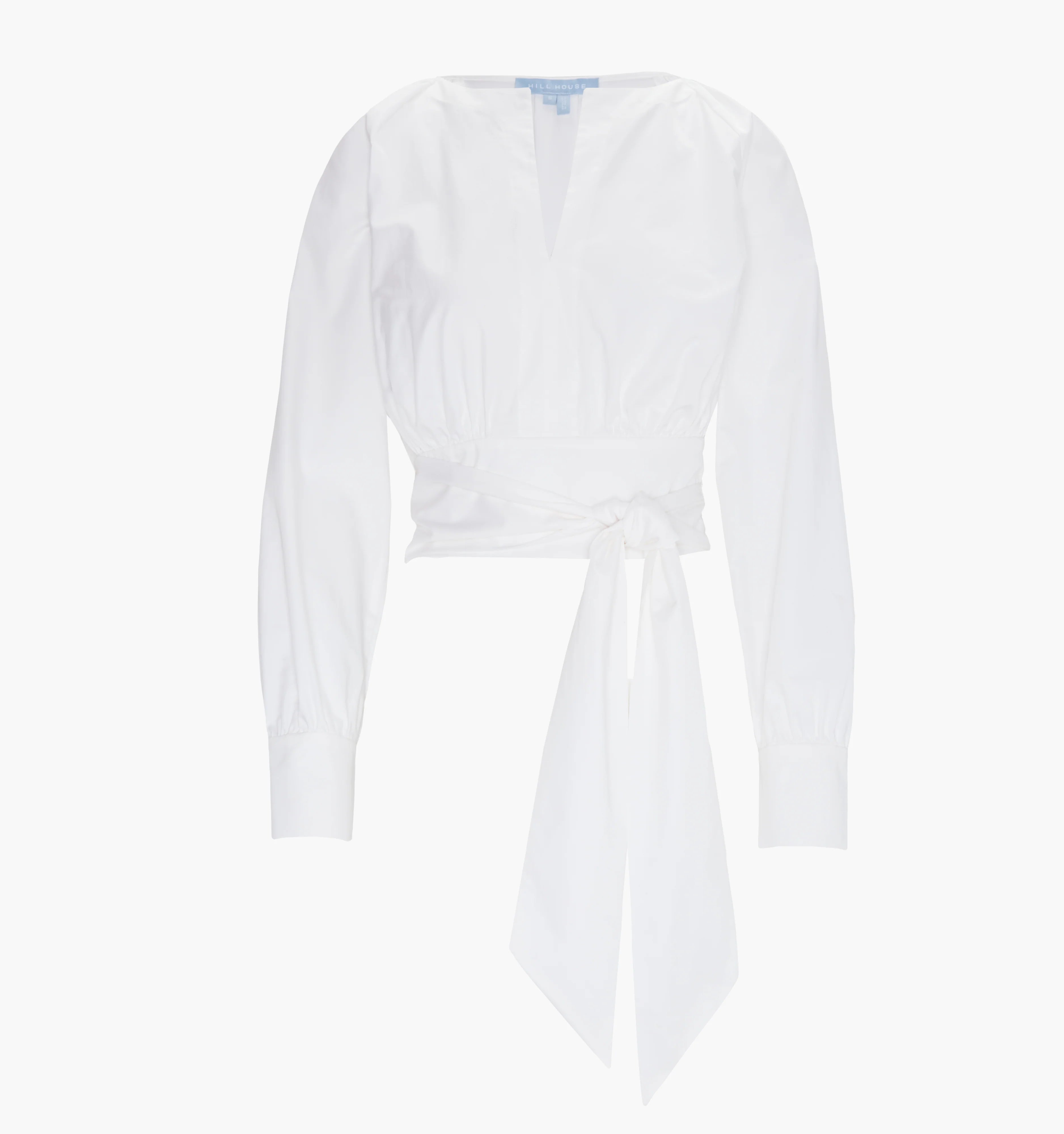 Meet the Giada Top. Crafted from crisp white cotton poplin, this top features a V-neckline, long sleeves with gathered cuffs and a flattering wrap waist that you may tie in the front or back for a cinched silhouette.