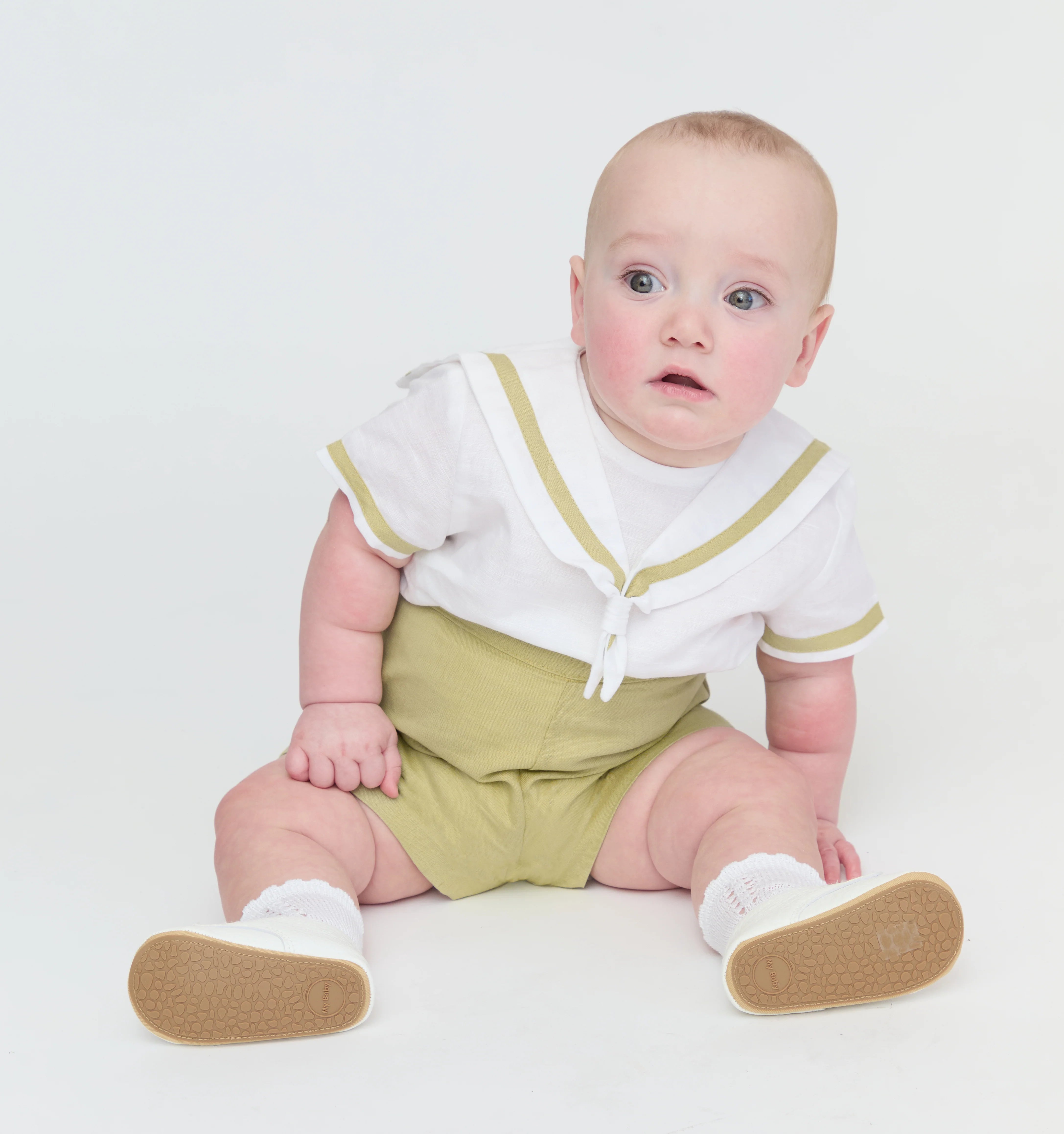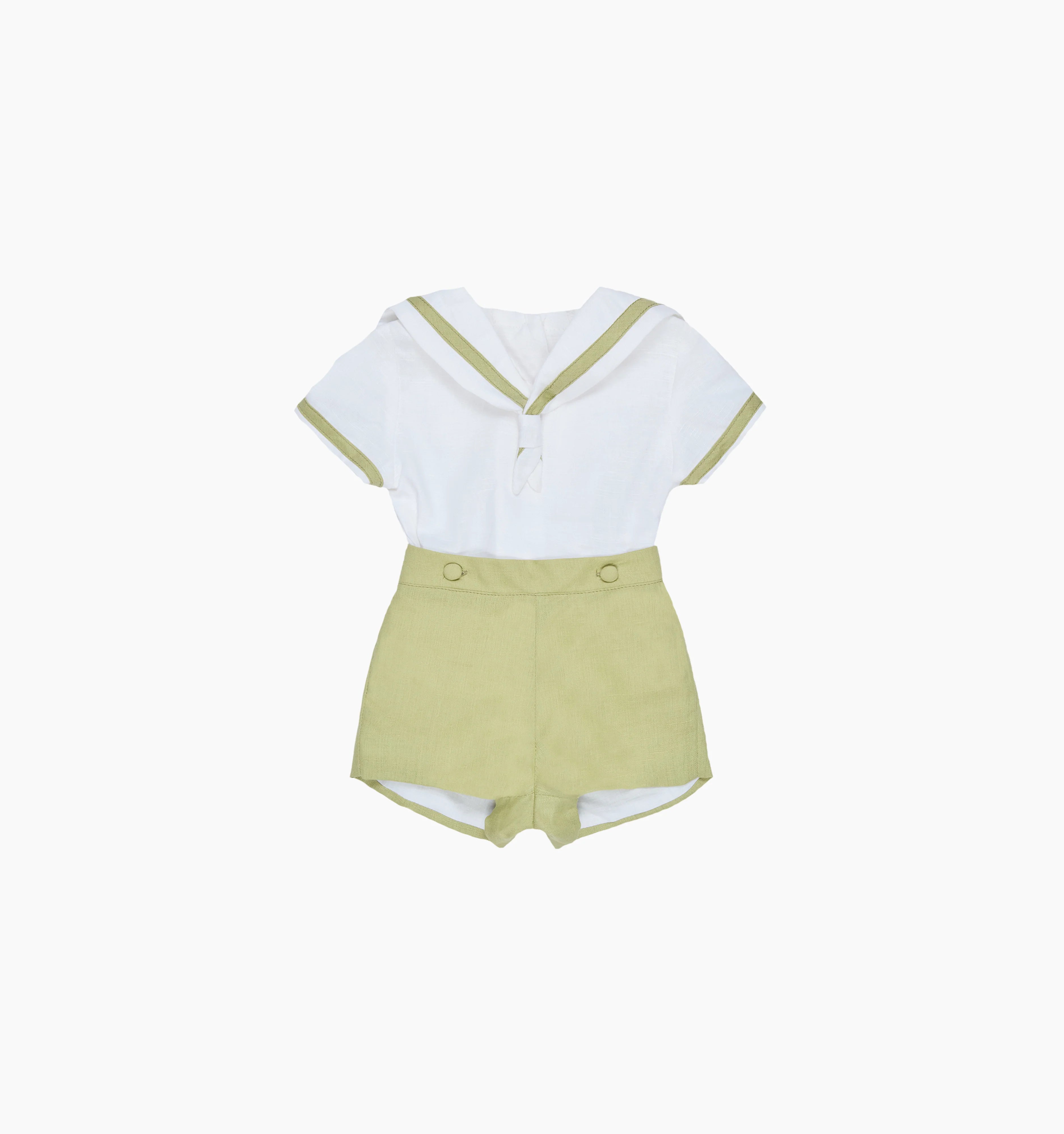 The La Coqueta x Hill House Home Antonio Baby Boy Set is a charming two-piece outfit inspired by classic sailor silhouettes, a signature of La Coqueta’s Spanish heritage. Featuring a crisp white shirt with a delicate sailor collar and short sleeves, it pairs effortlessly with the attached pistachio green shorts, complete with covered buttons and an elasticated back for comfort. Crafted from luxuriously soft cotton, this timeless set is lightweight and breathable, making it the perfect choice for warmer months and special summer occasions.