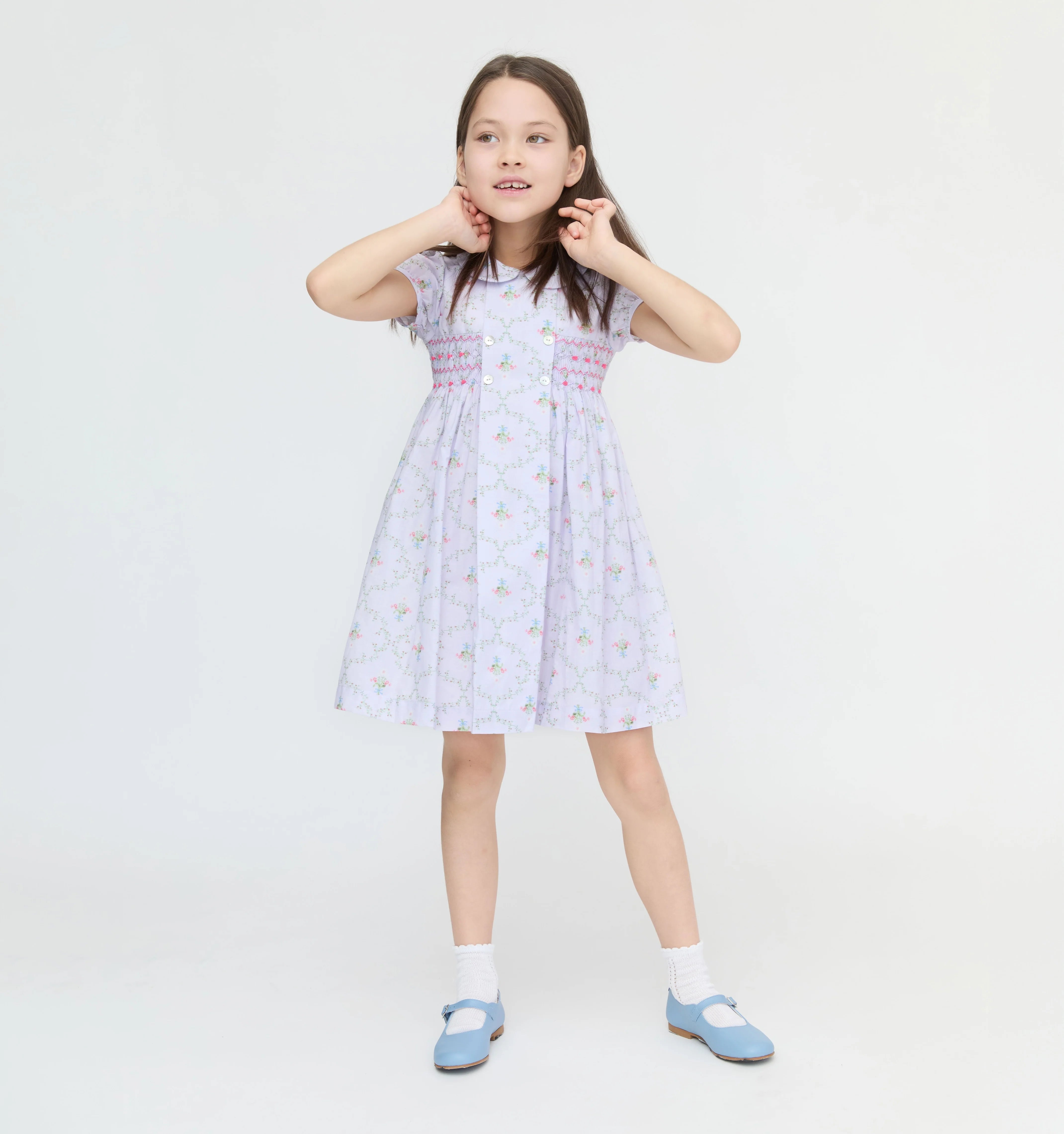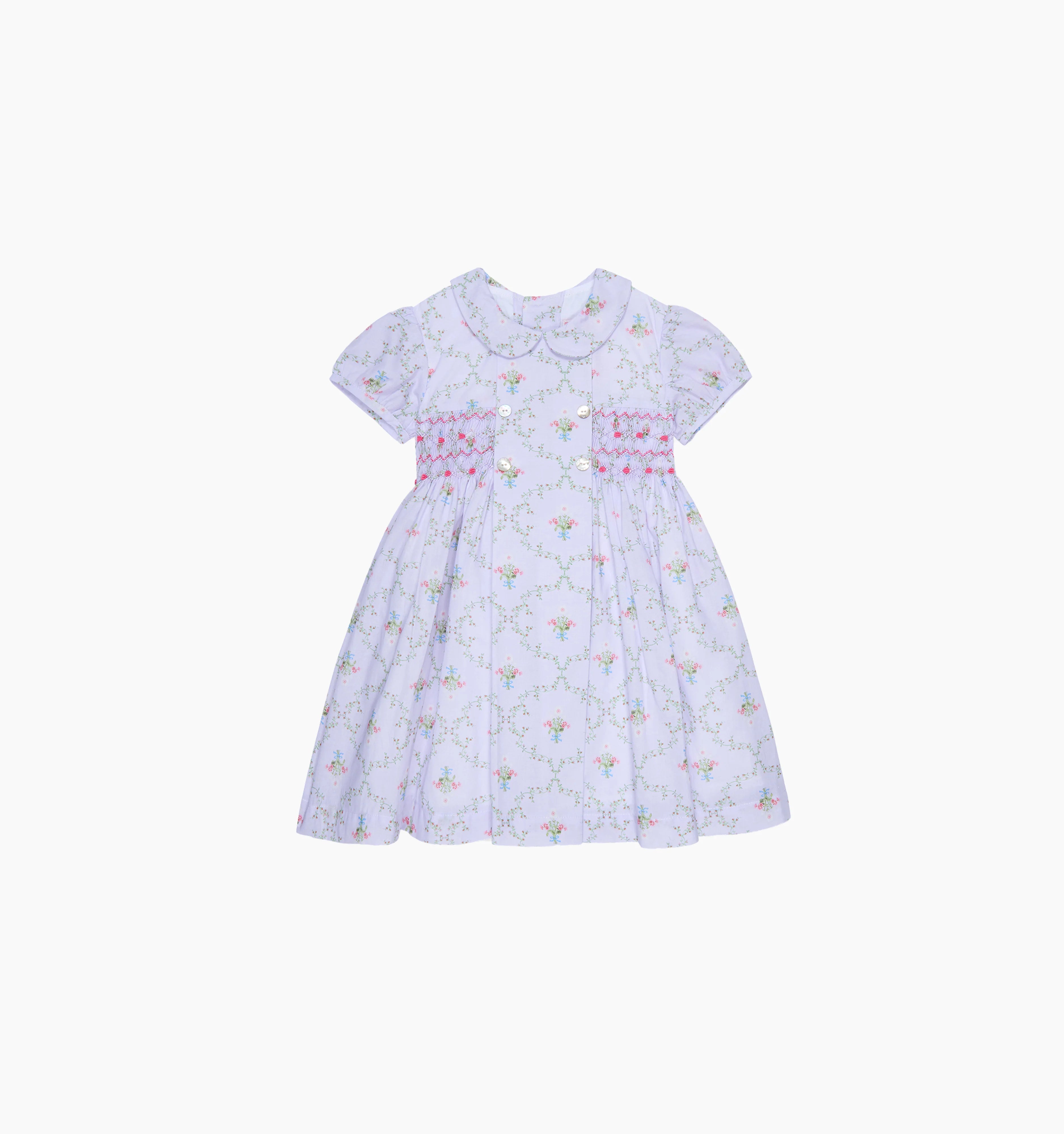 The La Coqueta x Hill House Home Arcadia Girl Hand-Smocked Dress is an iconic style in the collaboration. Crafted from pure cotton, it is adorned with intricate hand-smocked detail across the empire line waist and traced with geometric embroidery in contrasting thread. Inspired by vintage botanical illustrations, the result is a soft, painterly pattern in lilac hues, perfectly complementing the feminine details. Finished with short capped puff sleeves, it has a charming layered Peter Pan collar, mother of pearl buttons on the panel down the yoke, and a long floaty skirt. Fasten at the back with mother of pearl buttons, and adjust the fit with the self-tie floppy bow. Pair with the matching Girl Large Bow Clip and coordinate with a big sister or mama wearing the Arcadia Baby Girl Hand-Smocked Set and The Ellie Nap Dress Girl Large Bow Clip for those adorable perfect-picture moments.