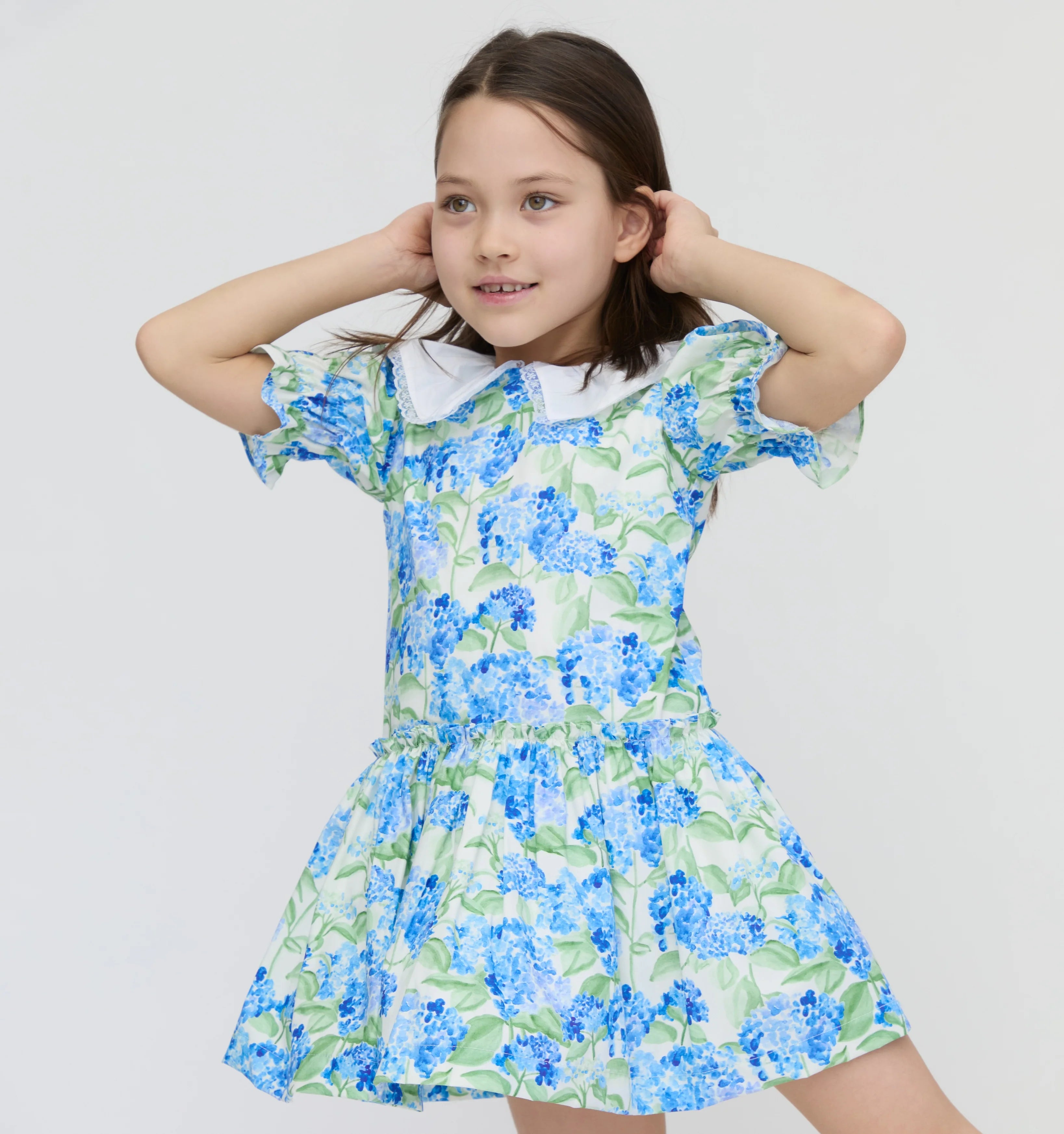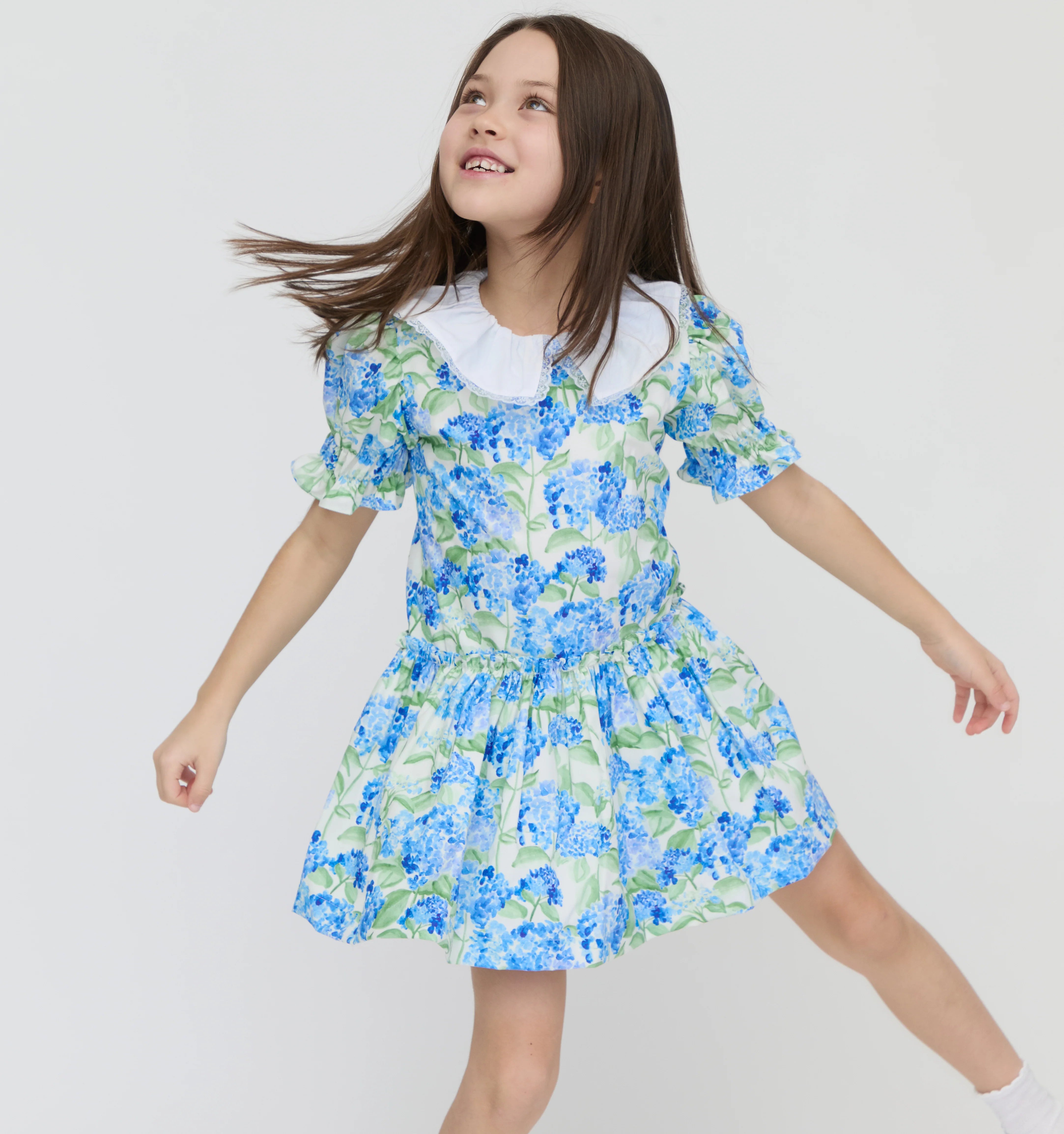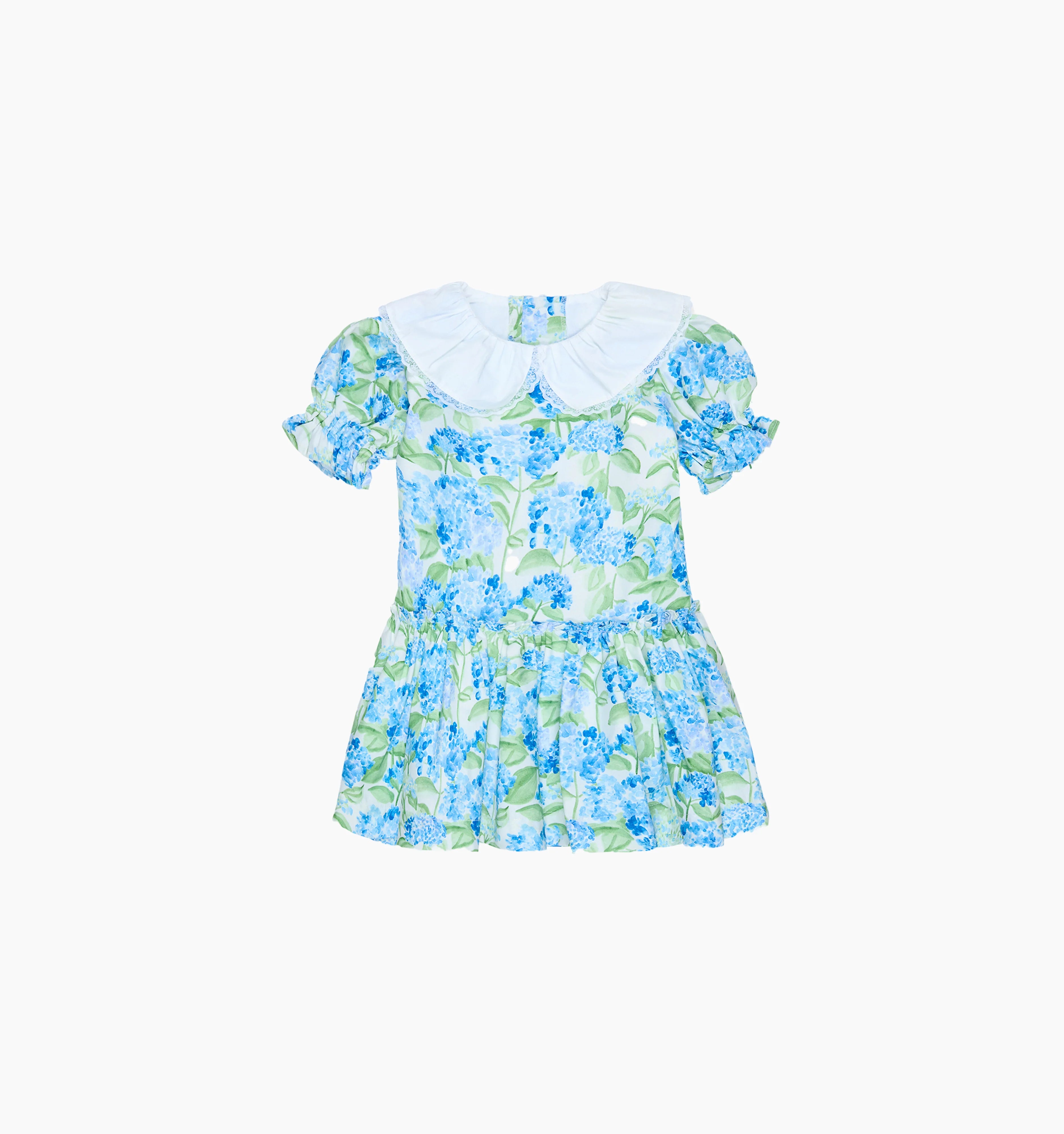 The La Coqueta x Hill House Home Izara Girl Drop Waist Dress is one of those pieces that you and your little one will truly adore, decorated with a painterly hydrangea floral print in tones of blue and green, crafted from pure cotton poplin with a dropped waist and a softly pleated skirt that swishes with every move. It has a relaxed, boxy fit, short puffed sleeves that have been shirred at the cuffs and a statement white cotton pleated collar traced with hand-finished openwork trims. It fastens at the back with signature mother of pearl buttons for easy dressing all season long. The perfect piece for garden parties and special events, it can easily be dressed up or down depending on the occasion. Coordinate with a big sister or mama wearing the Hestia Baby Girl Set, The Ellie Nap Dress and the Maribel Girl Jacket for those adorable perfect-picture moments.