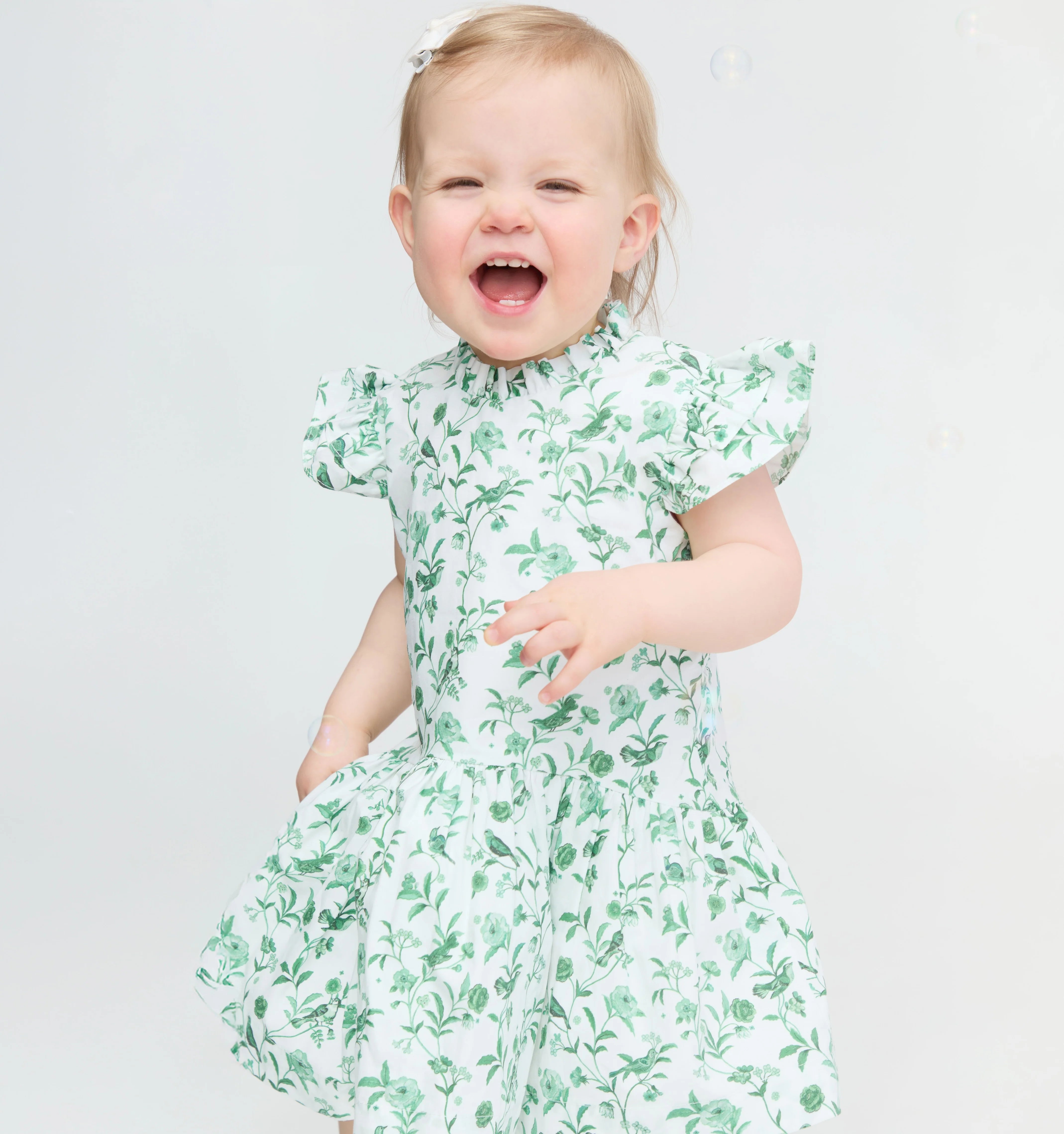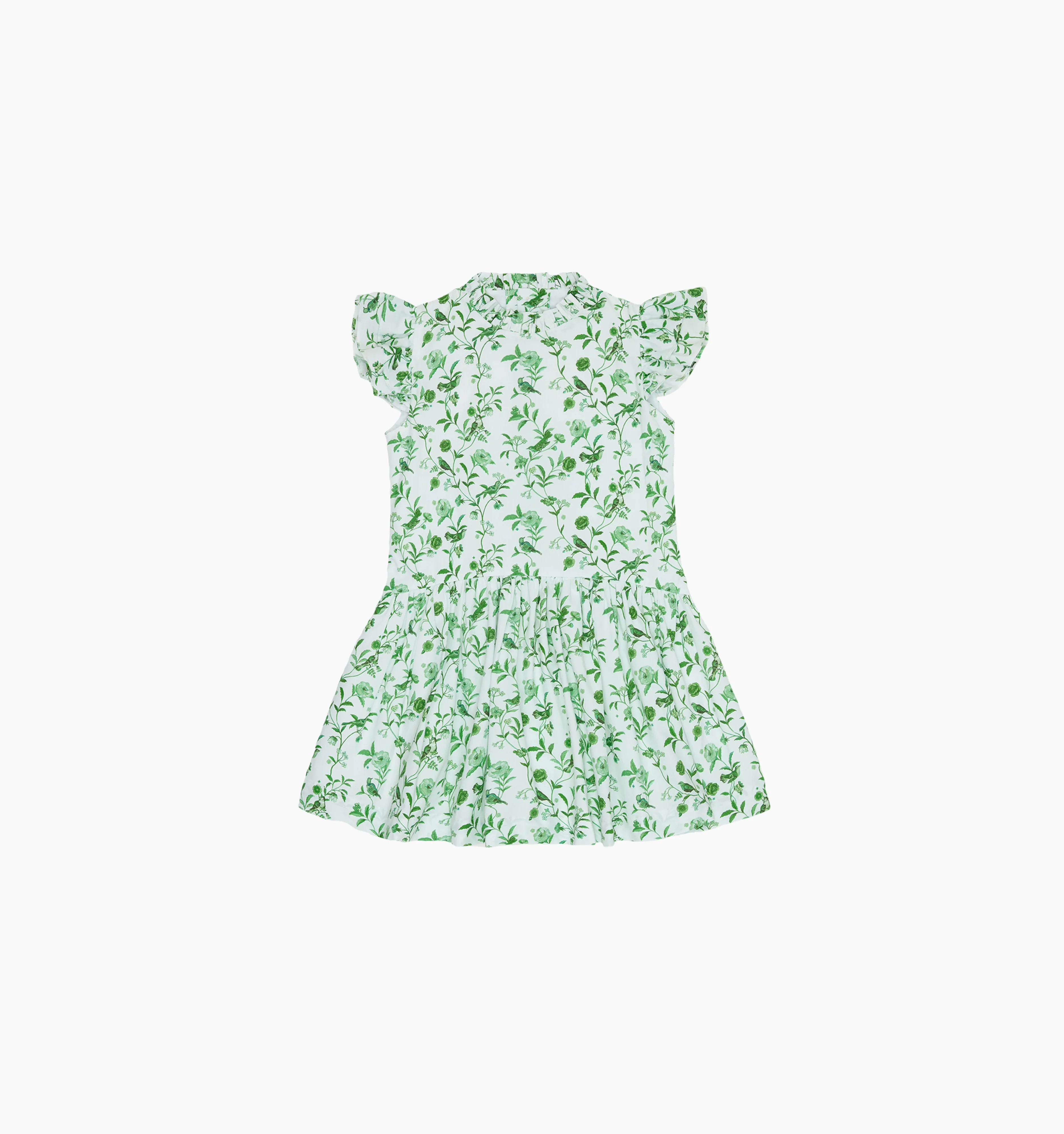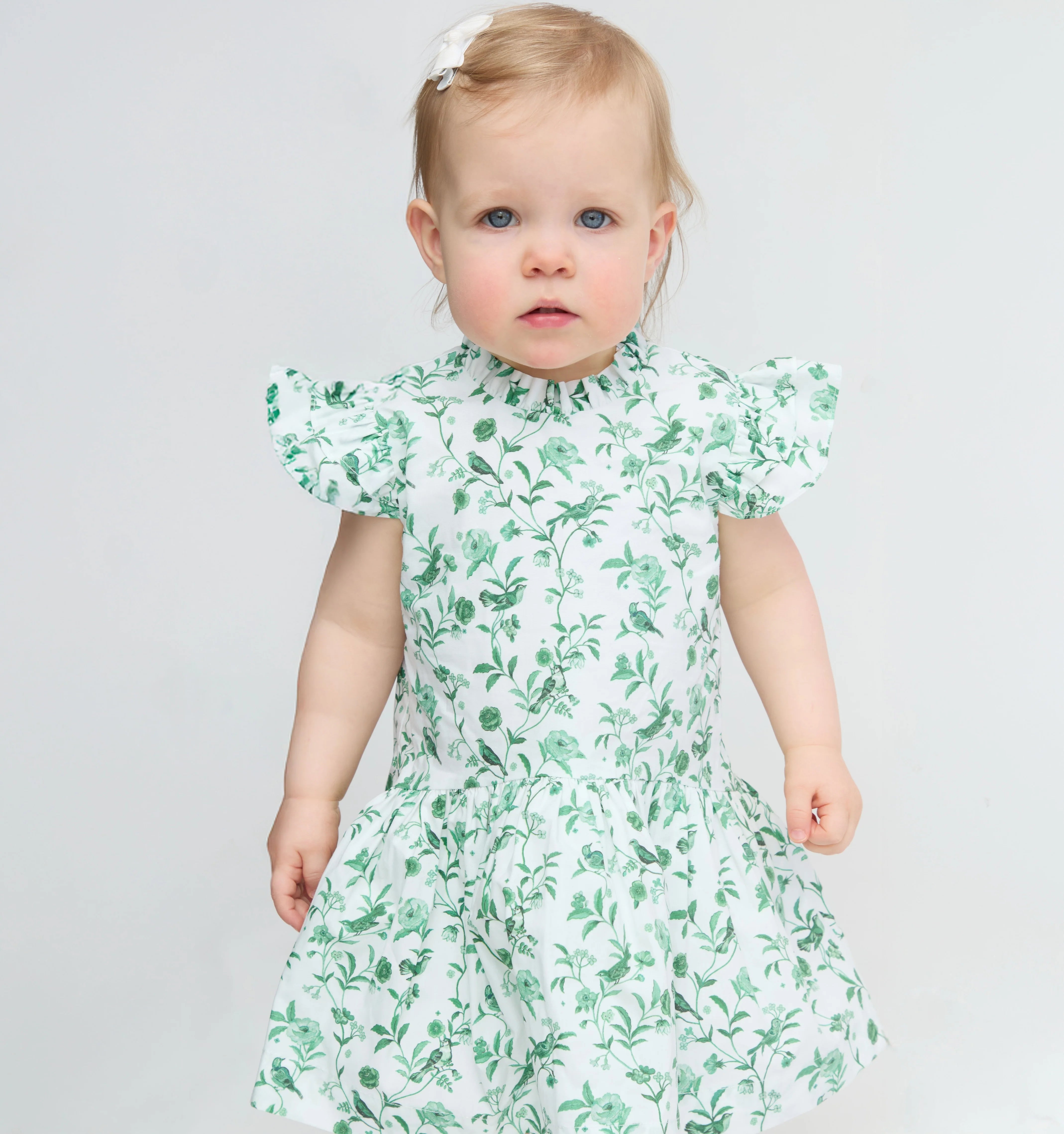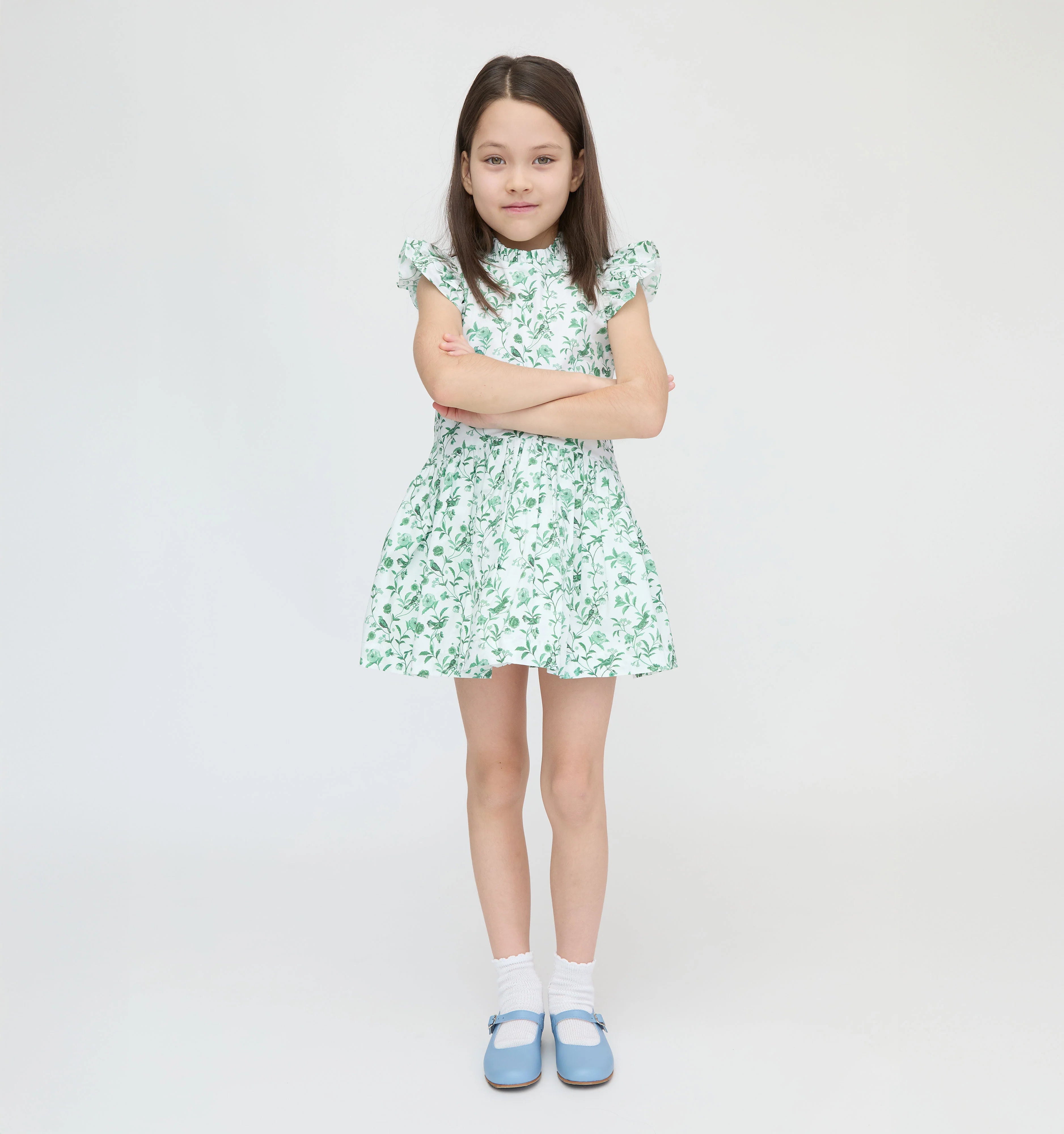 The La Coqueta x Hill House Home Rita Girl Drop Waist Dress has a charming dropped waist with a floaty, ruffled skirt, a stand collar traced with pleated frills and decadent butterfly sleeves. It feels so nostalgic yet simultaneously modern, adorned with vintage botanical illustrations in green hues, and buttons up at the back with signature mother of pearl buttons. Coordinate with a big sister or mama wearing The Tiny Ellie Nap Dress and The Matilda Dress for those adorable perfect-picture moments.