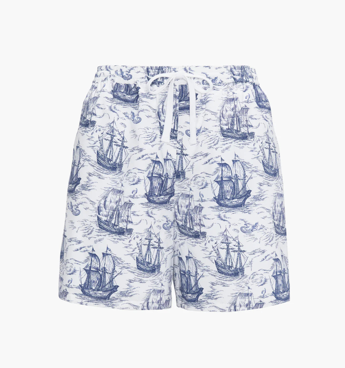 Mariner’s Toile is a nautical print inspired by vintage maritime etchings. Featuring illustrated sail boats, mermaids and rolling ocean waves in a toile pattern, this whimsical print is rendered in crisp navy blue on a soft ivory background.