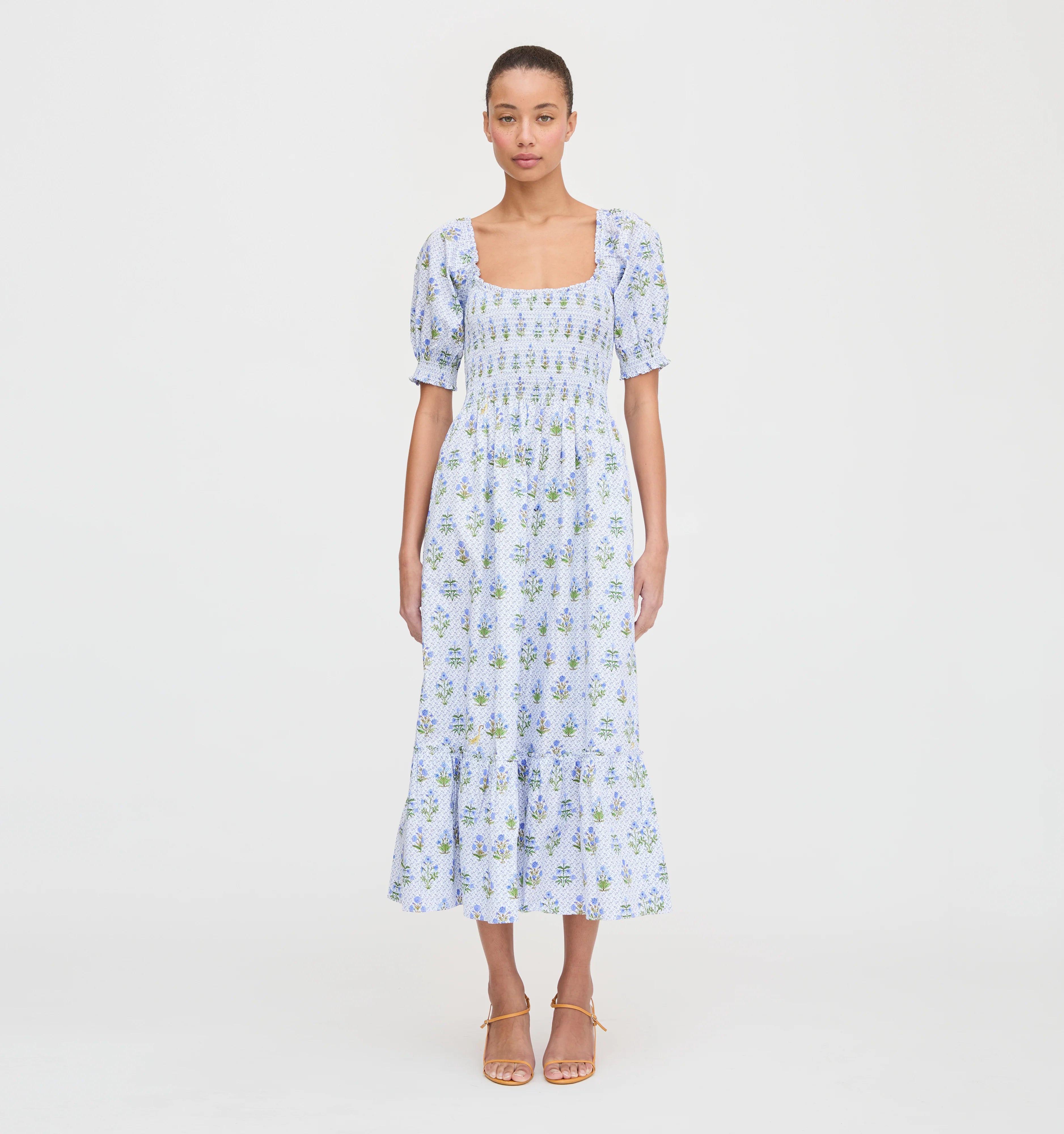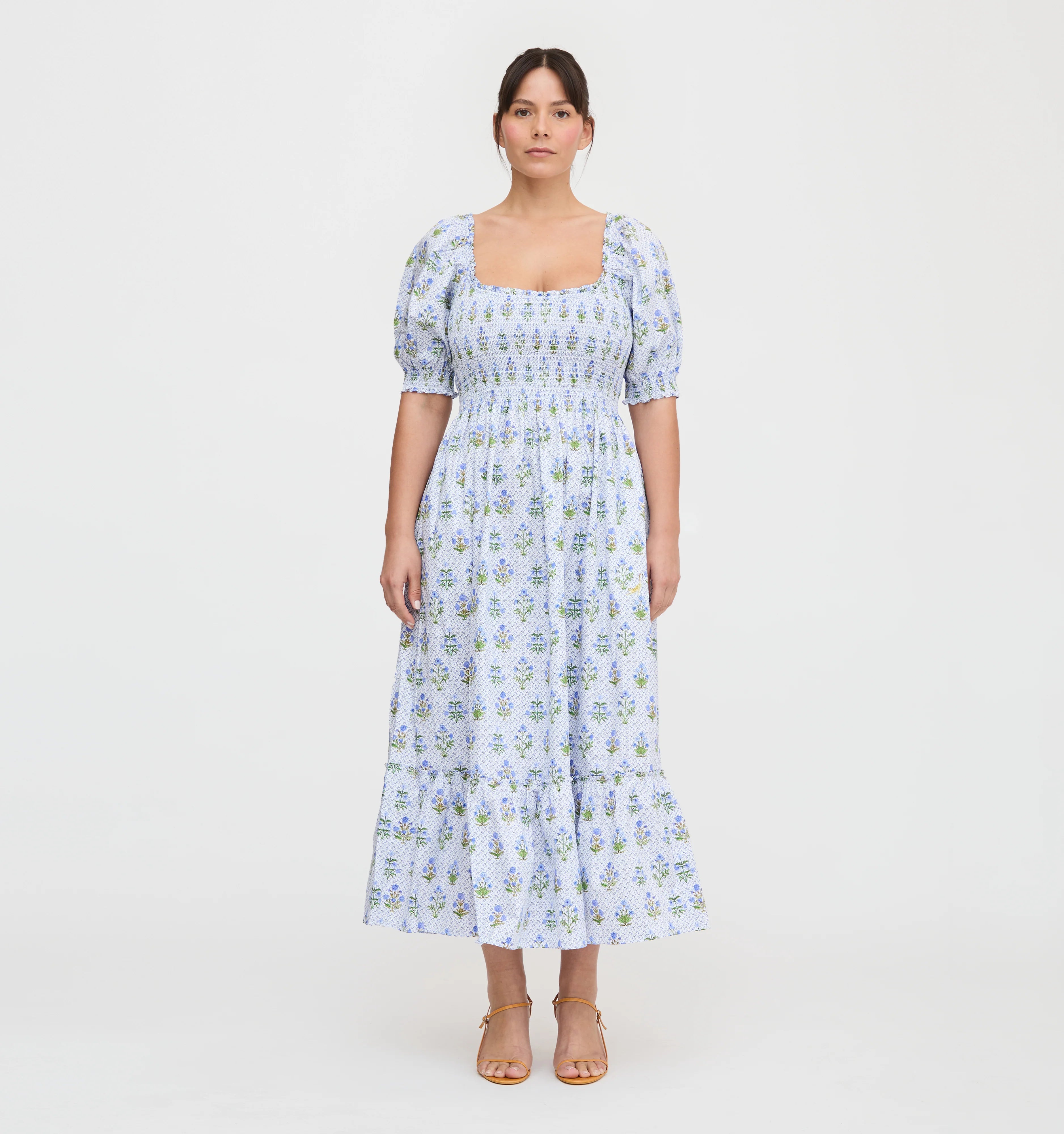 Meet the Louisa Nap Dress®. Louisa features our proprietary, elasticated Nap Smocking, a bra-friendly scooped neckline, ruffle hem midi skirt in an updated length and puff sleeves.