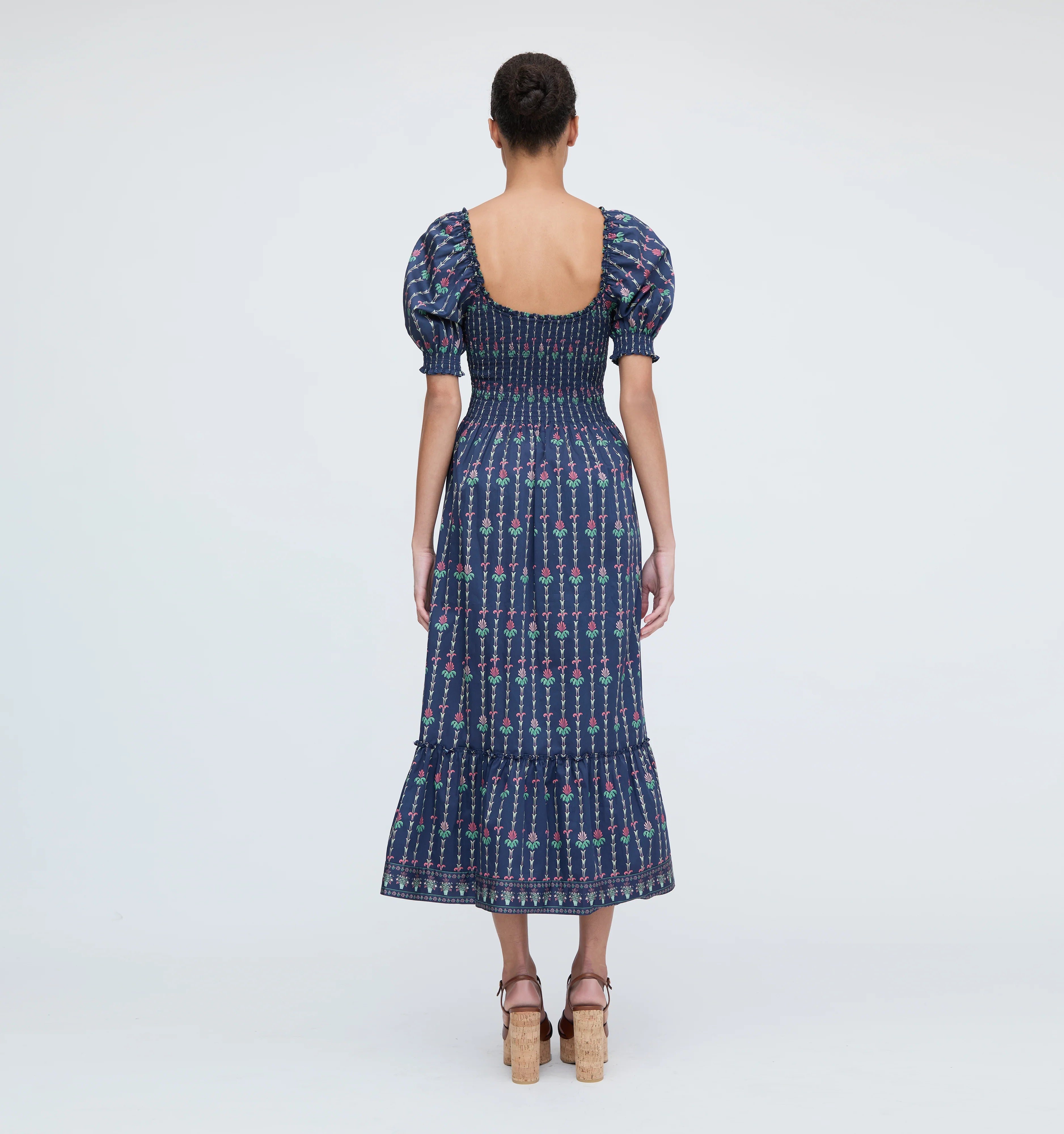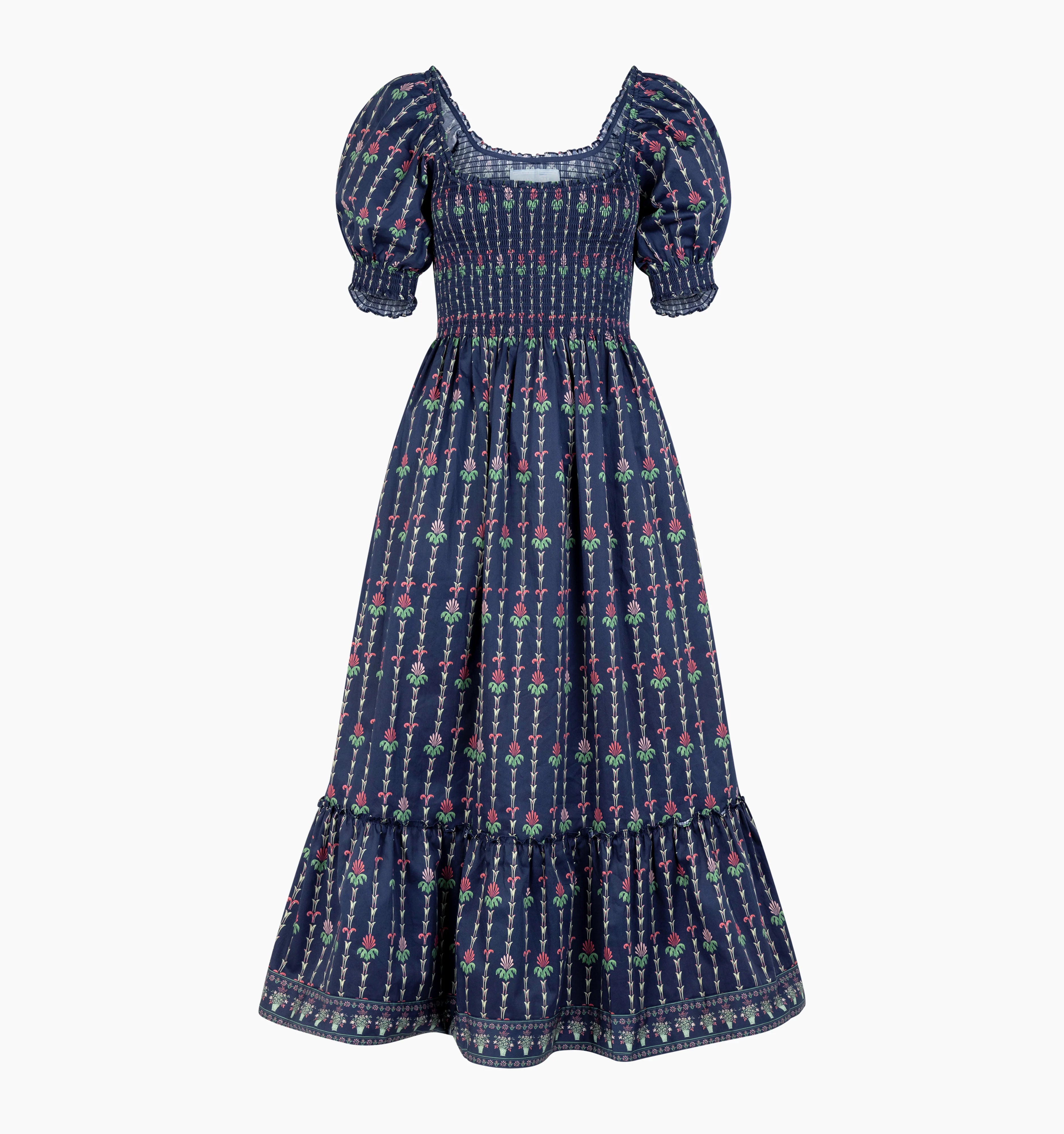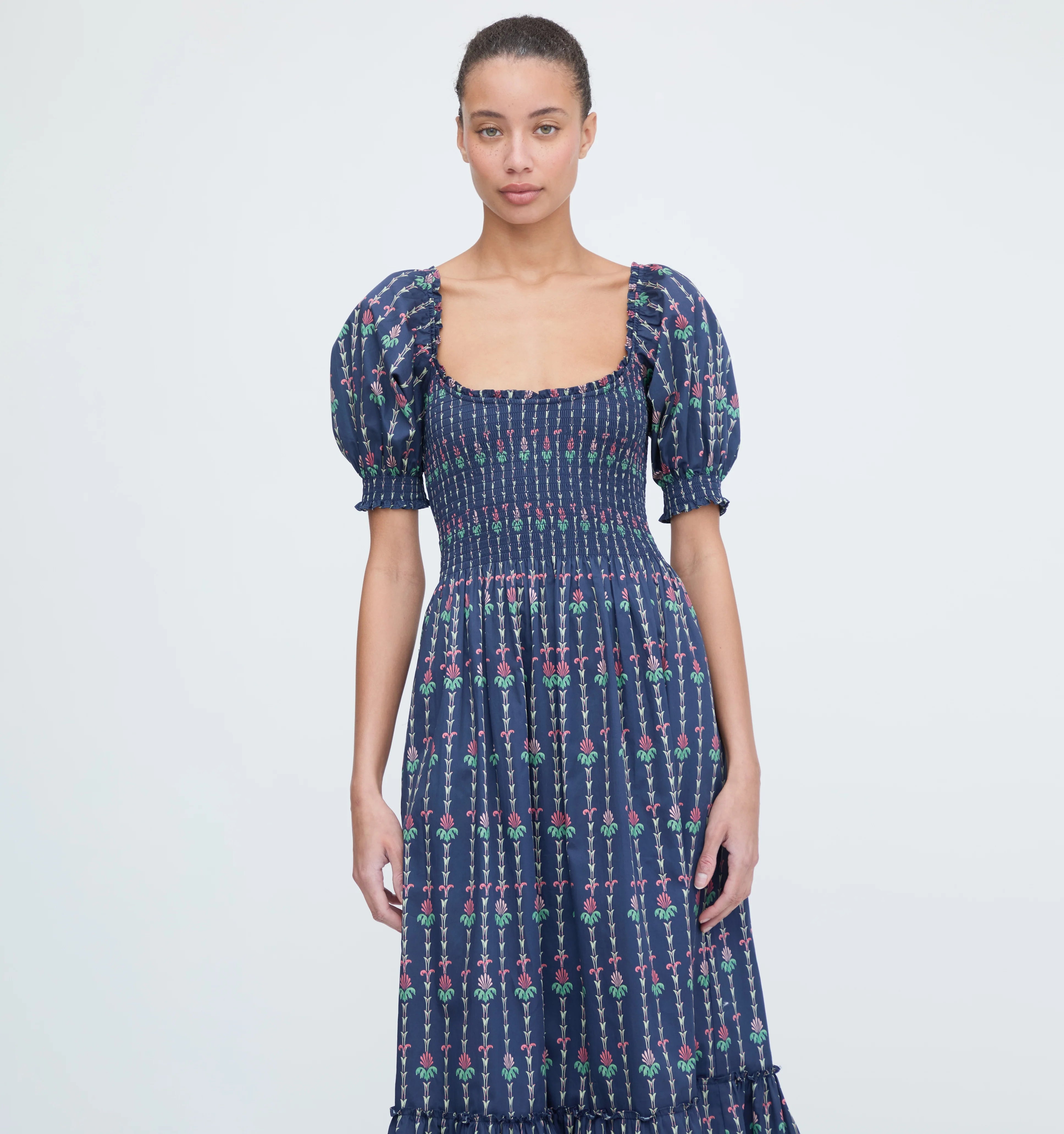 Meet the Louisa Nap Dress®. Louisa features our proprietary, elasticated Nap Smocking, a bra-friendly scooped neckline, ruffle hem midi skirt in an updated length and puff sleeves.